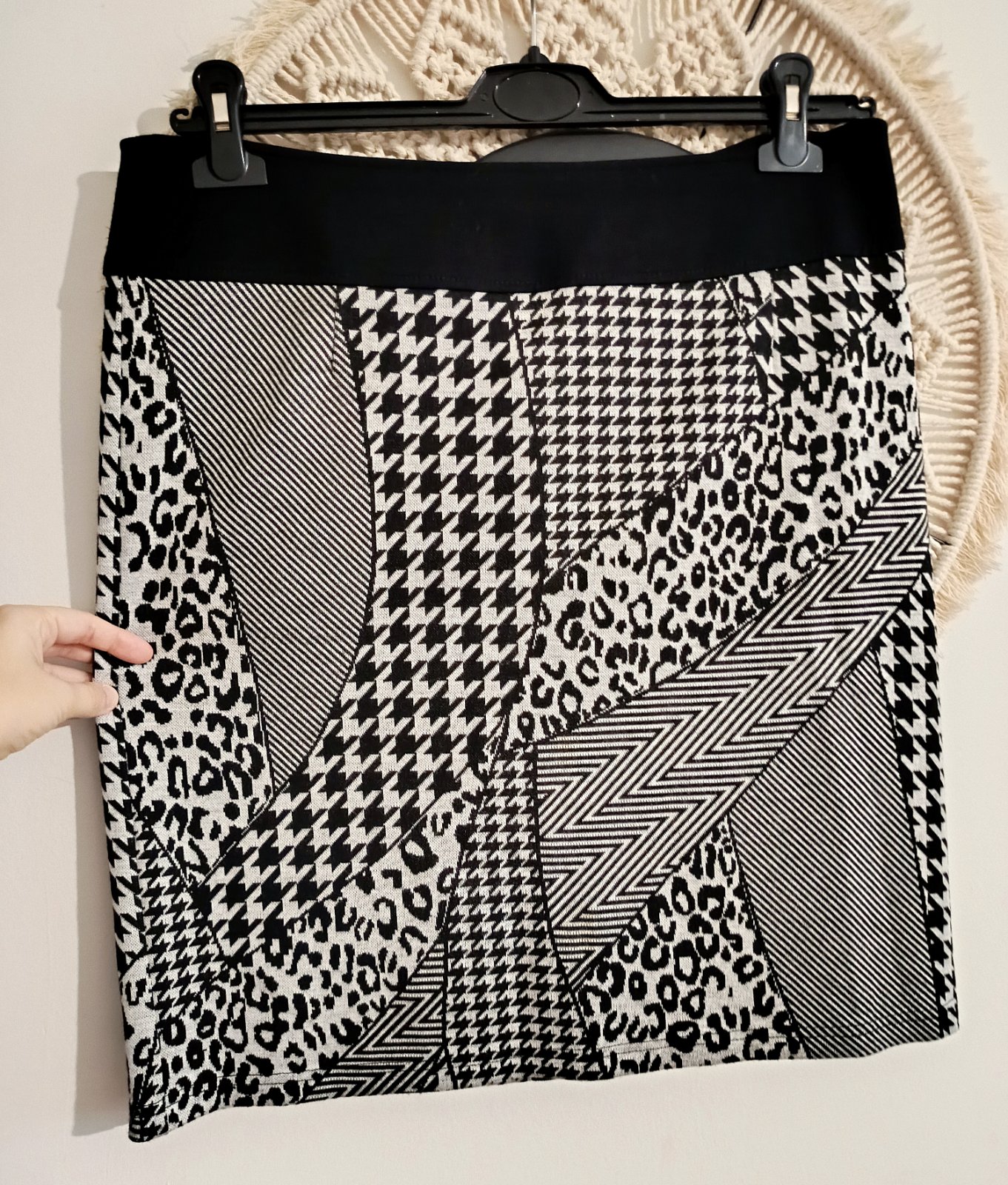 Čierno-biela károvaná sukňa z elastického materiálu. V pása má gumu, takže sa prispôsobí. A pohodlné nosenie zabezpečuje aj malý rozparok. Značka Sinsay. Veľkosť XL.