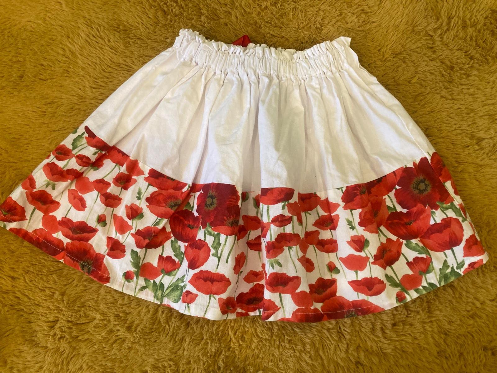 Predám bielu sukničky s červenými ruža mi. Pás je na širokú gumu. Veľmi málo nosená. V prípade záujmu premeriam veľkosť.