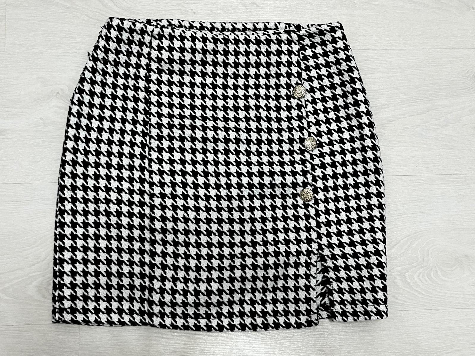 Sukňa s ozdobnými zlatými gombíkmi, vzadu zapínanie na zips, hrubšia, vhodná na chladné dni, elegantná, pepítkový vzor, odporúčam