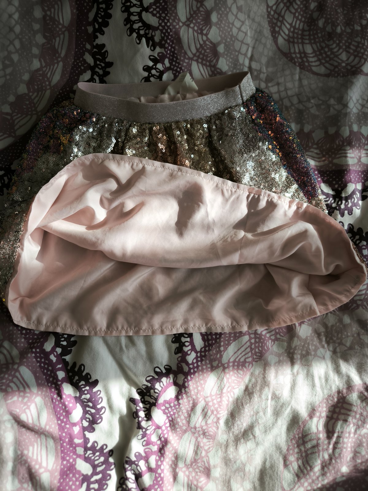 Krásna sukňa s trblietkami. Veľkosť 134/140. Jeden maličký fliačik ,vid posledná a predposledná fotka. Takmer nevidno,ale je tam.