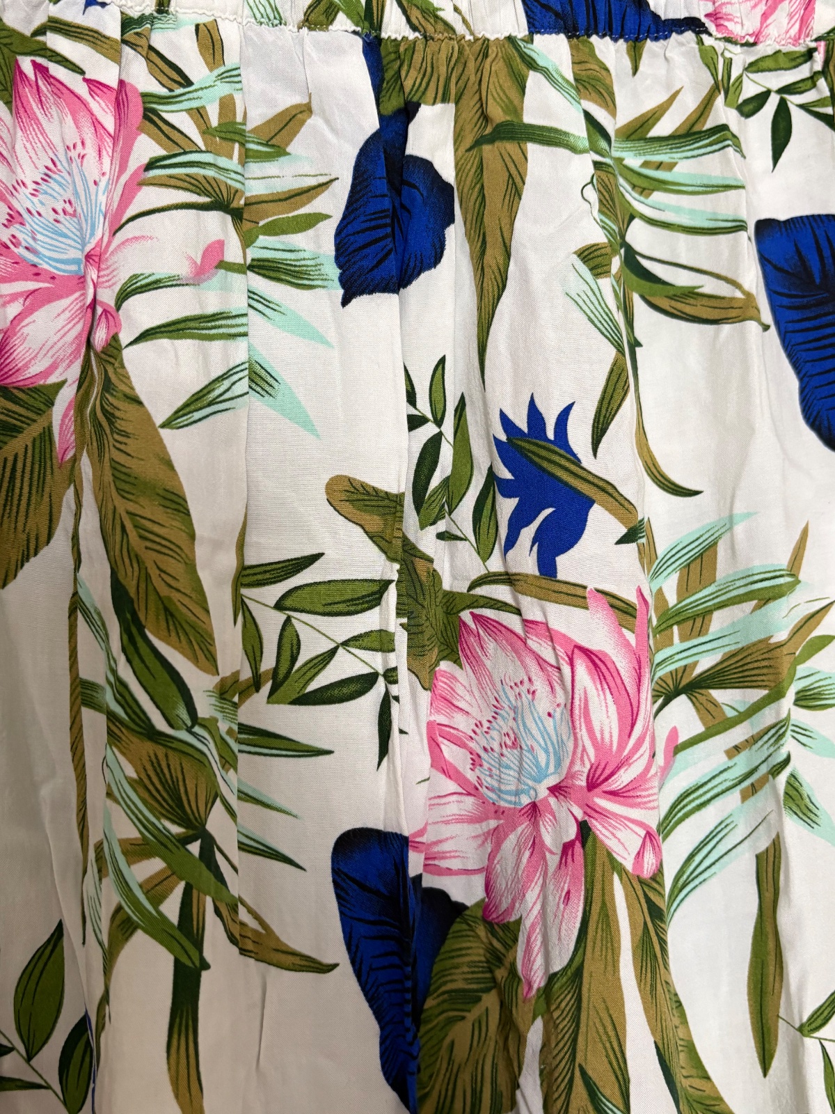 Letná sukňa, materiál tenký. Veľkosť uvádza 36. Zodpovedá S-M. Zvnútra spodnička zhruba pod kolená. Značka Club Frendy. Zboku zips. Pri jednom švíku je asi 2 cm rozpáraná, sem tam oslabené pri šití...