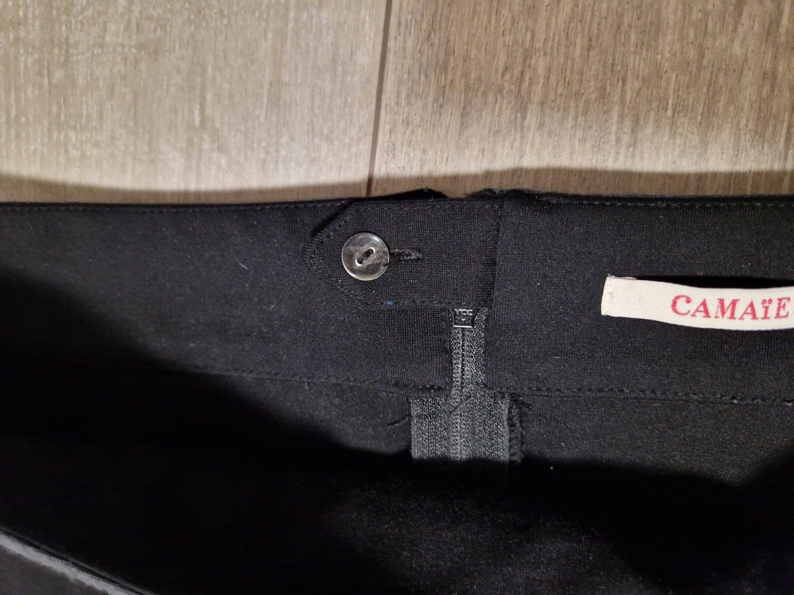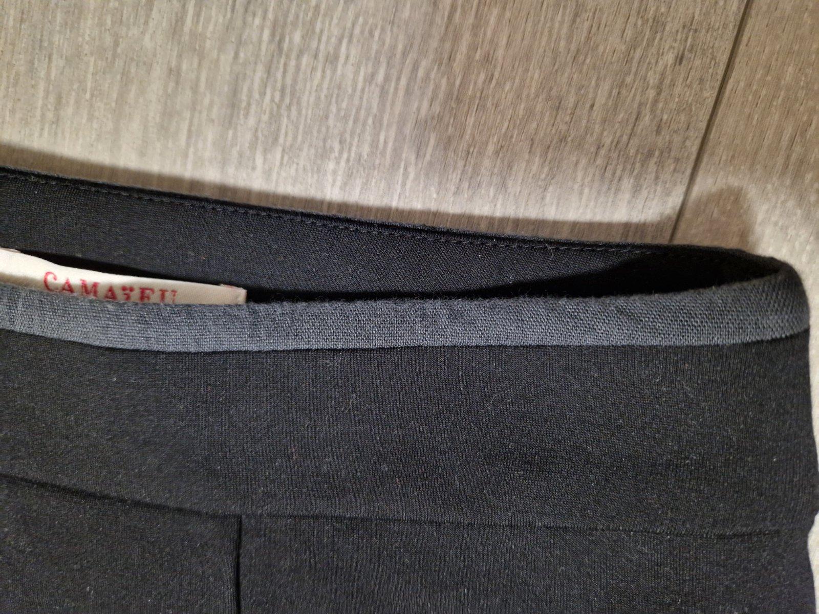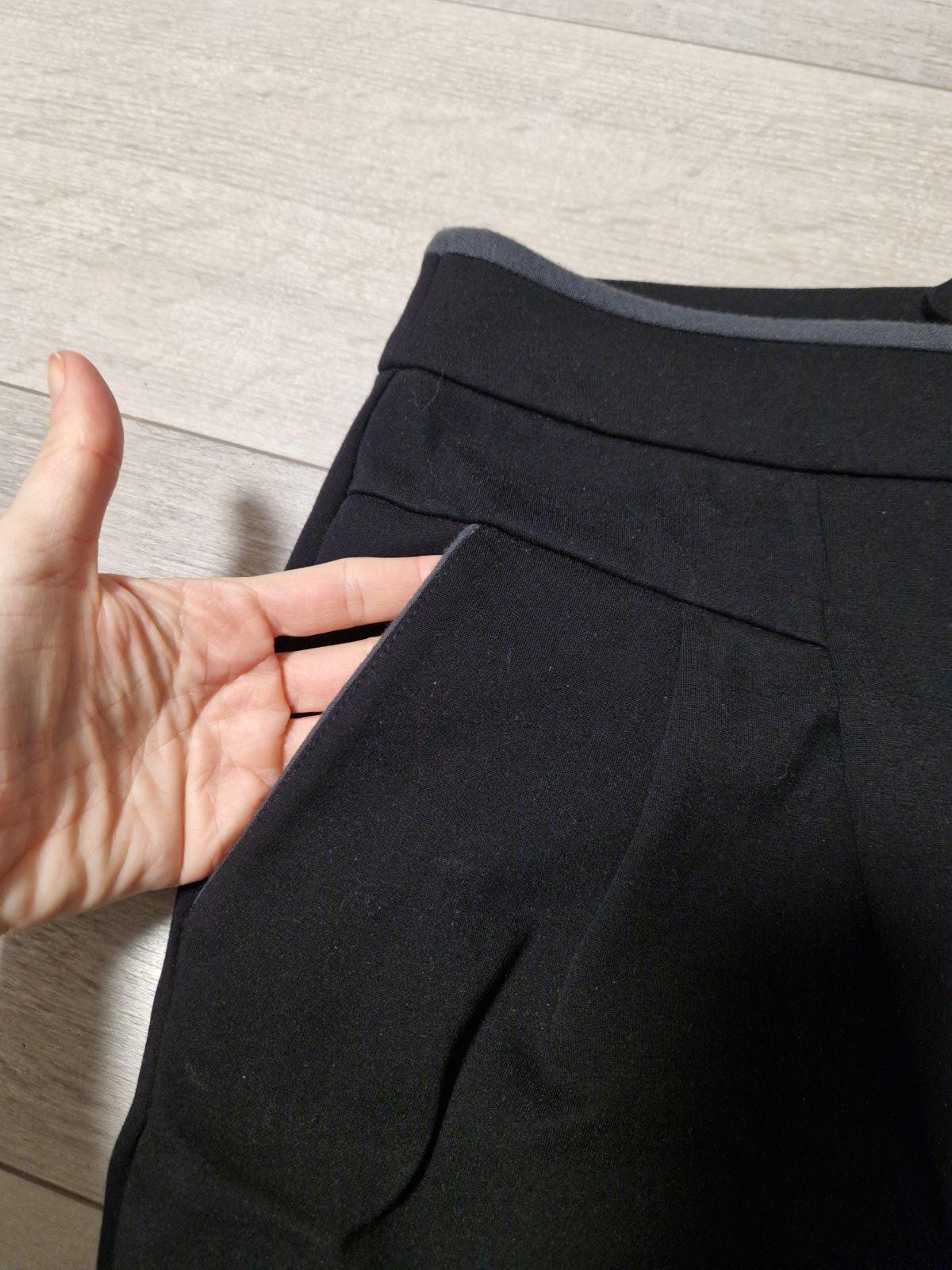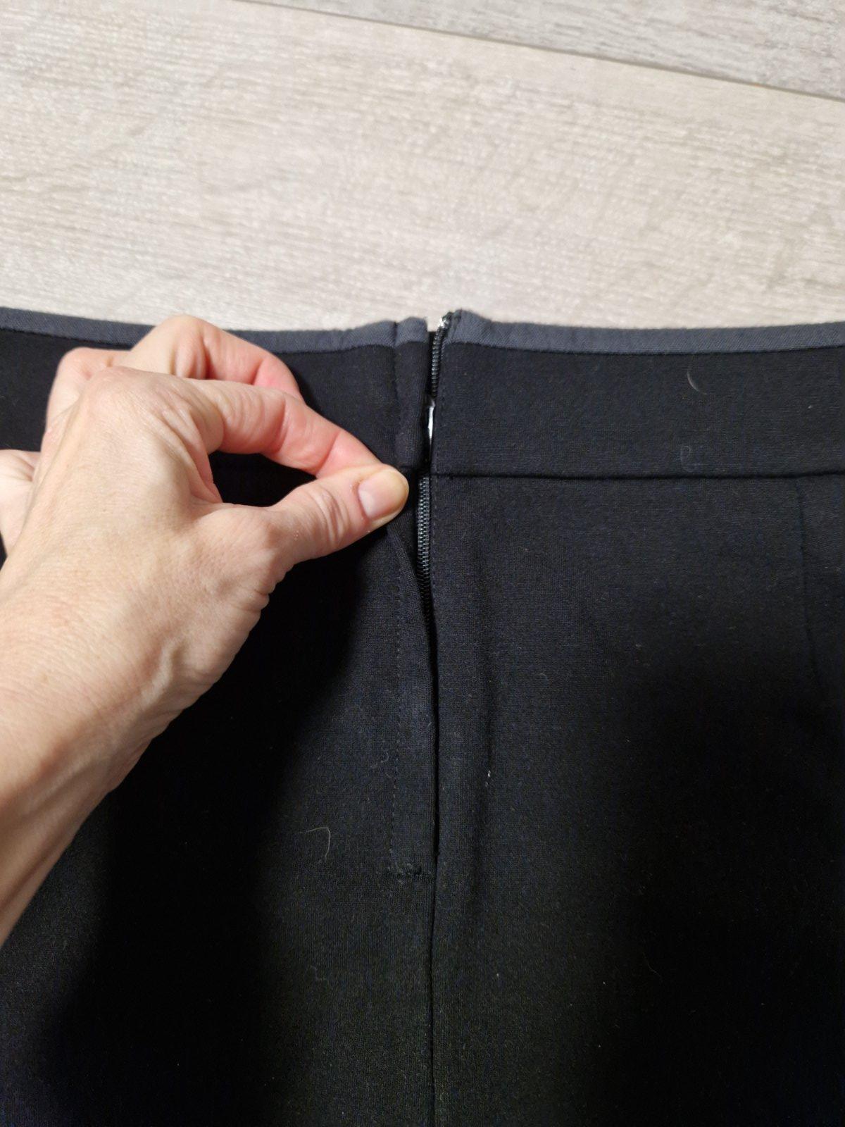 Výborný nosený stav. Vzadu zips, vrecká.vpredu so zámikmi. Na tých bledších lemoch bola koženka, no tá sa celá ošúpala časom, aj keď sukňa stála v skrini. Teraz je to taká tmavšia sivá látka. Pás v kľude 40,dĺžka 46. Štítok s veľkosťou odstrihnutý.