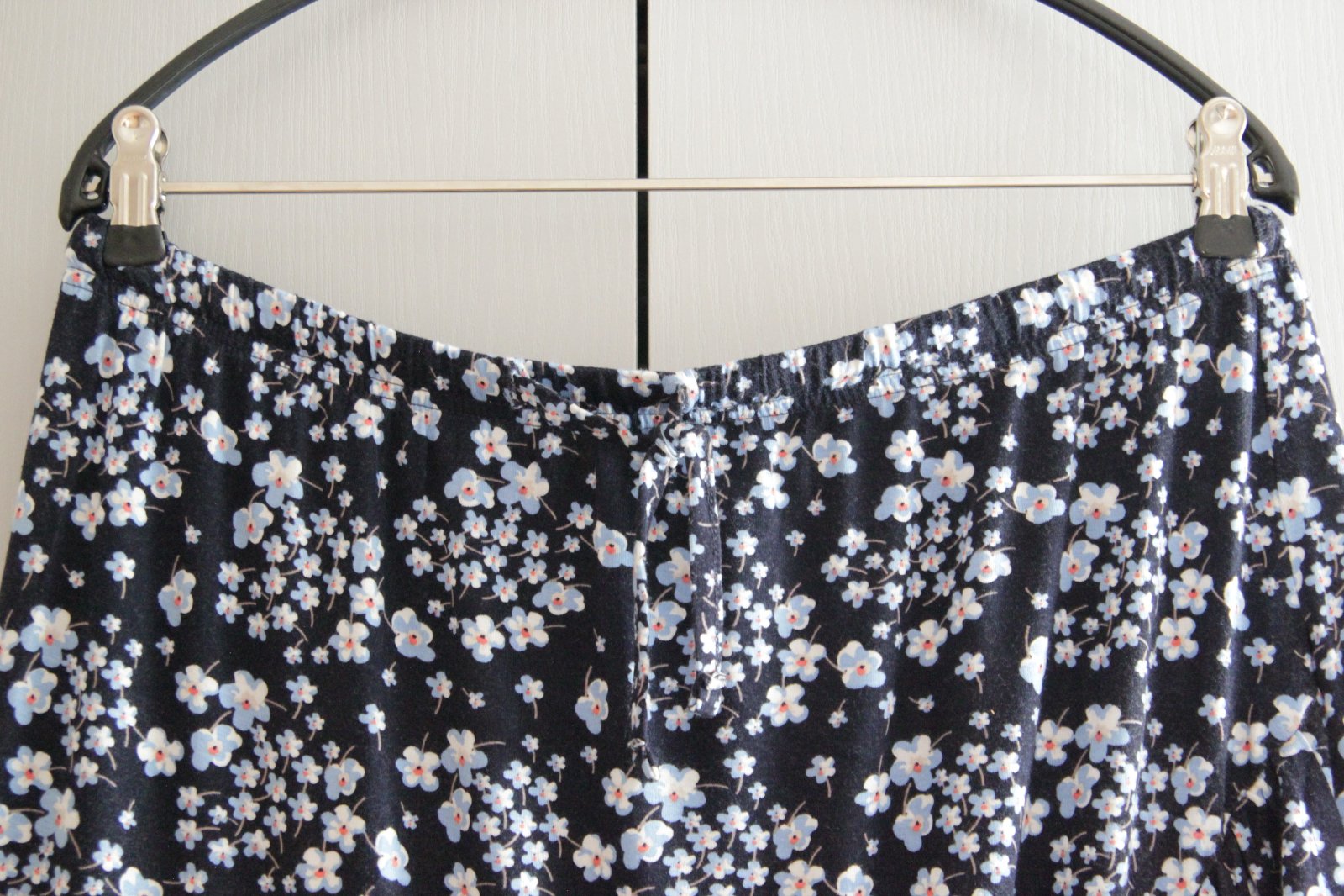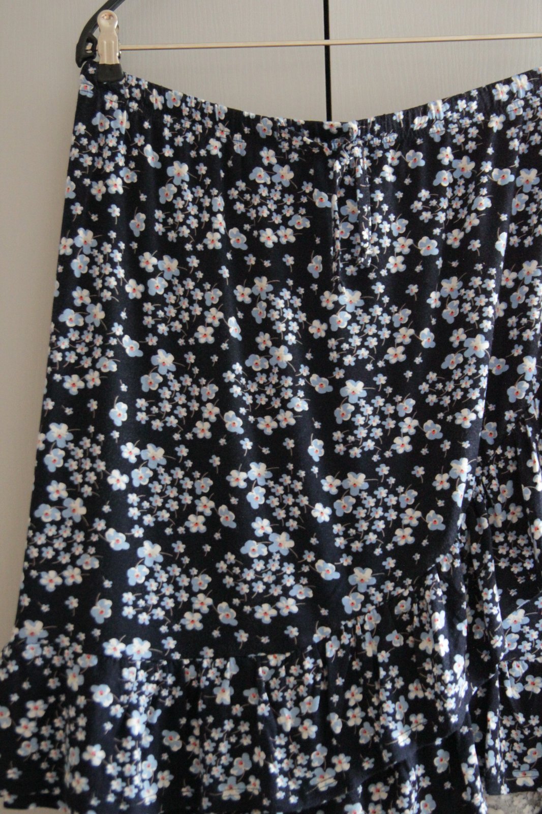 Tmavo modrá kvietkovaná sukňa s volánmi z pohodlného elastického materiálu, veľkosť XL. Pás je na gumu.
