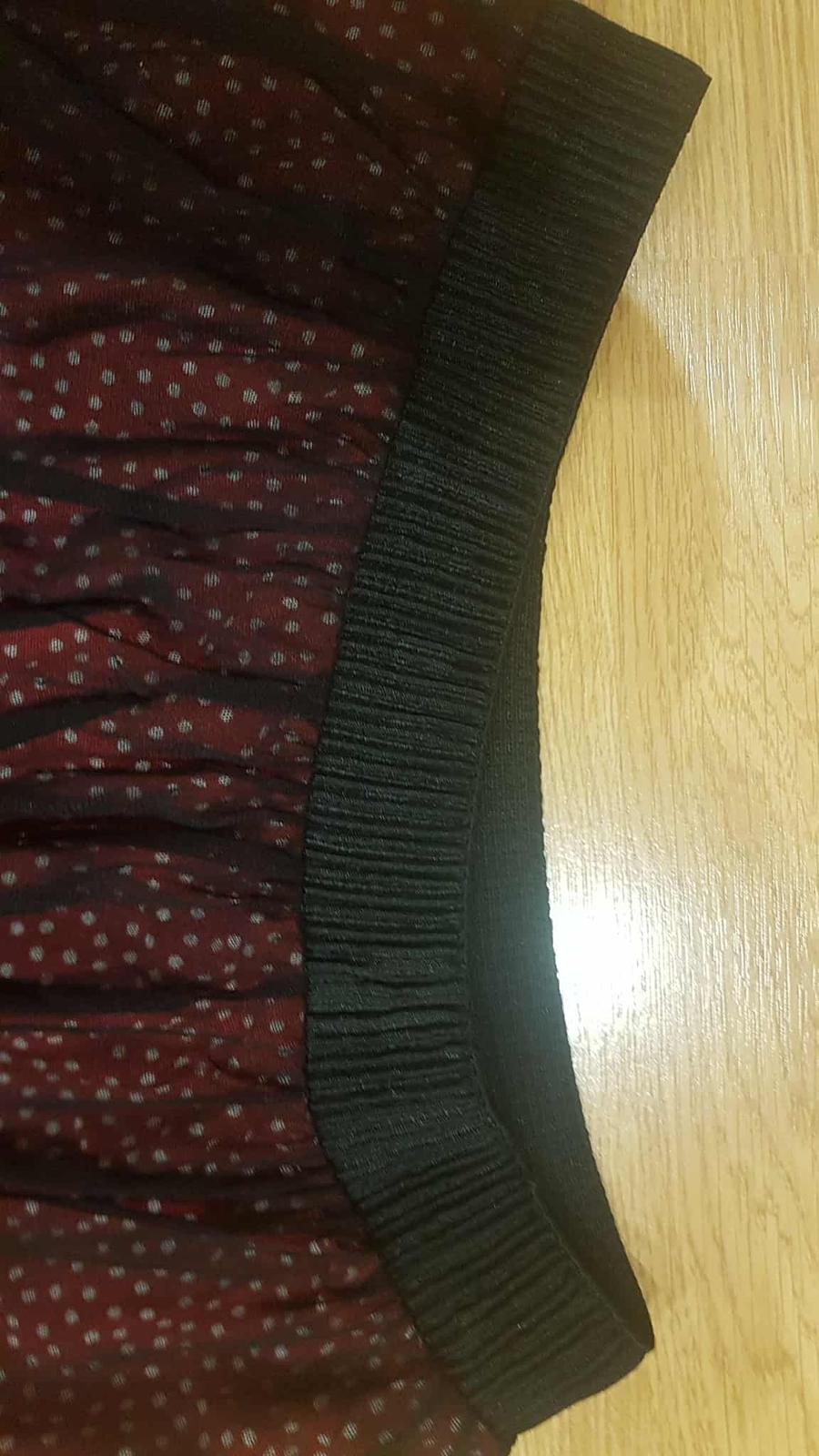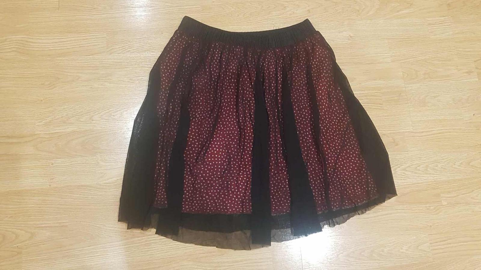 pekná čierno - červená sukňa na gumu v páse, Je to vlastne šifón a pod ním červená podšívka s bielymi bodkami, výborný stav. Pás v klude je 38 x 2 cm, natiahne sa do 50 x 2 cm.