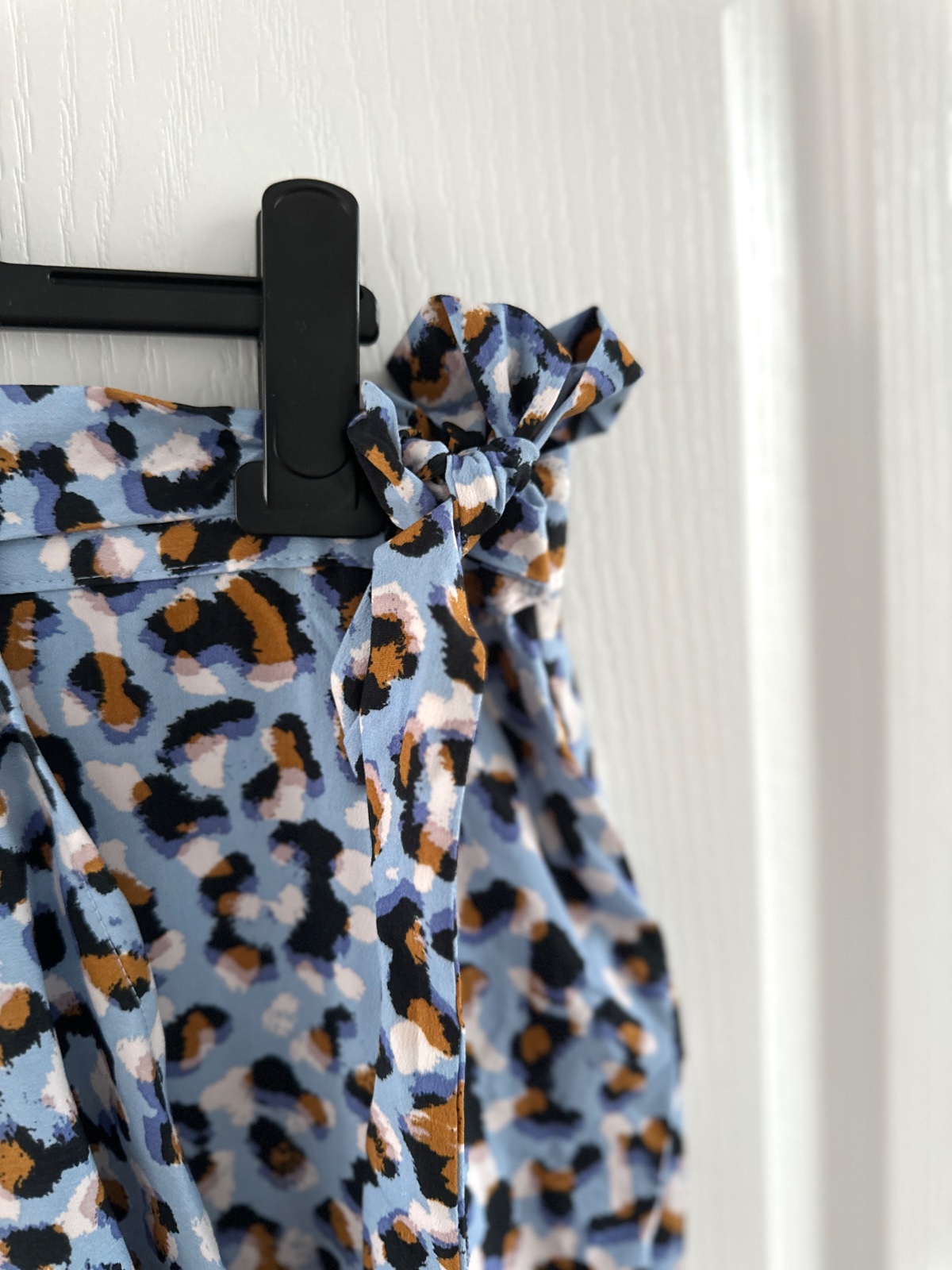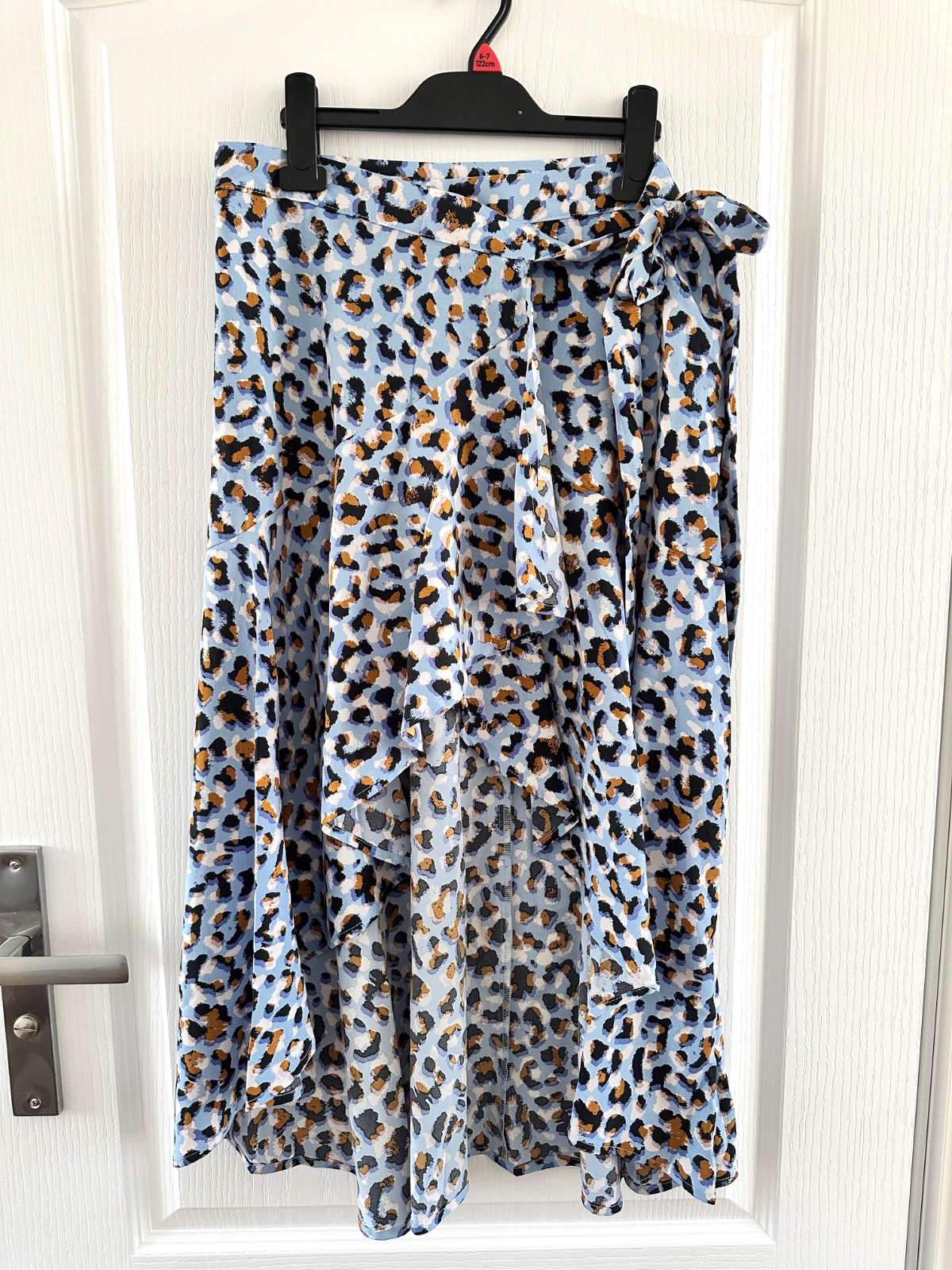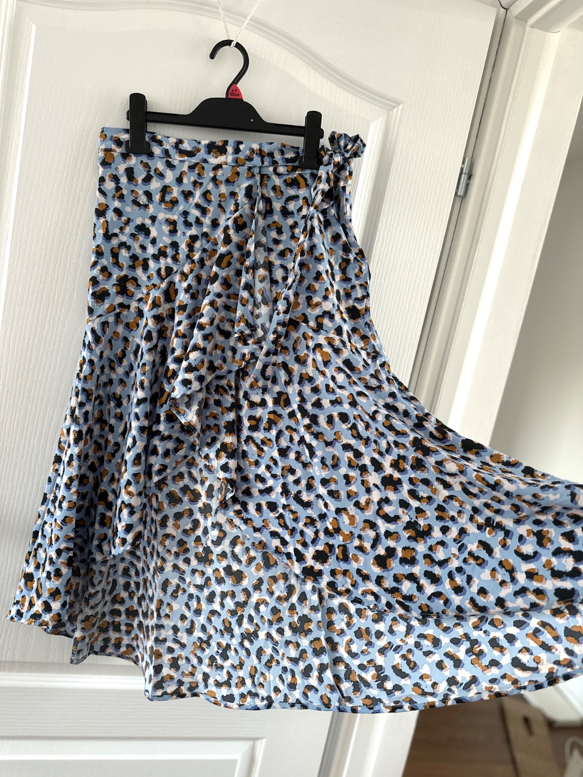 Midi zavinovacia sukňa s krásnym leopardím vzorom na modrom podklade. Sukňa je nová s visačkami, kúpená v predajni Lindex. Veľkosť na visačke je XS, ale je zaviazaná, takže sa dá upraviť a bude vhodná od veľkosti XS do M. Má midi dĺžku, široký volánik, ktorý krásne splýva. Je to perfektná sukňa na mnoho príležitostí. Dá sa nosiť športovo alebo elegantne. Ideálna na svadbu, krst alebo záhradnú párty.