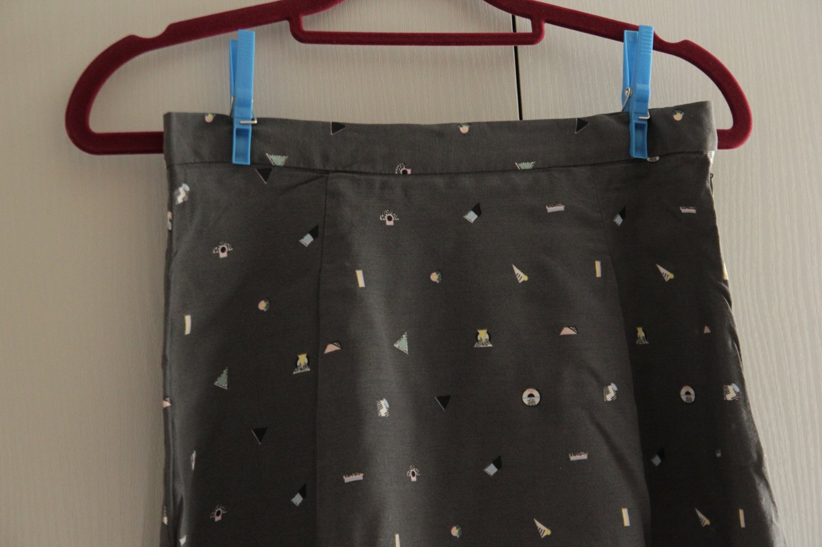 Šedá áčková sukňa s malými vzormi, na boku sa zapína na zips.