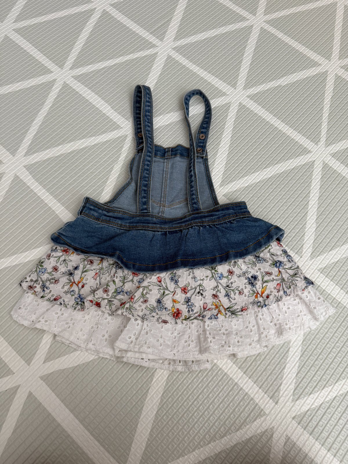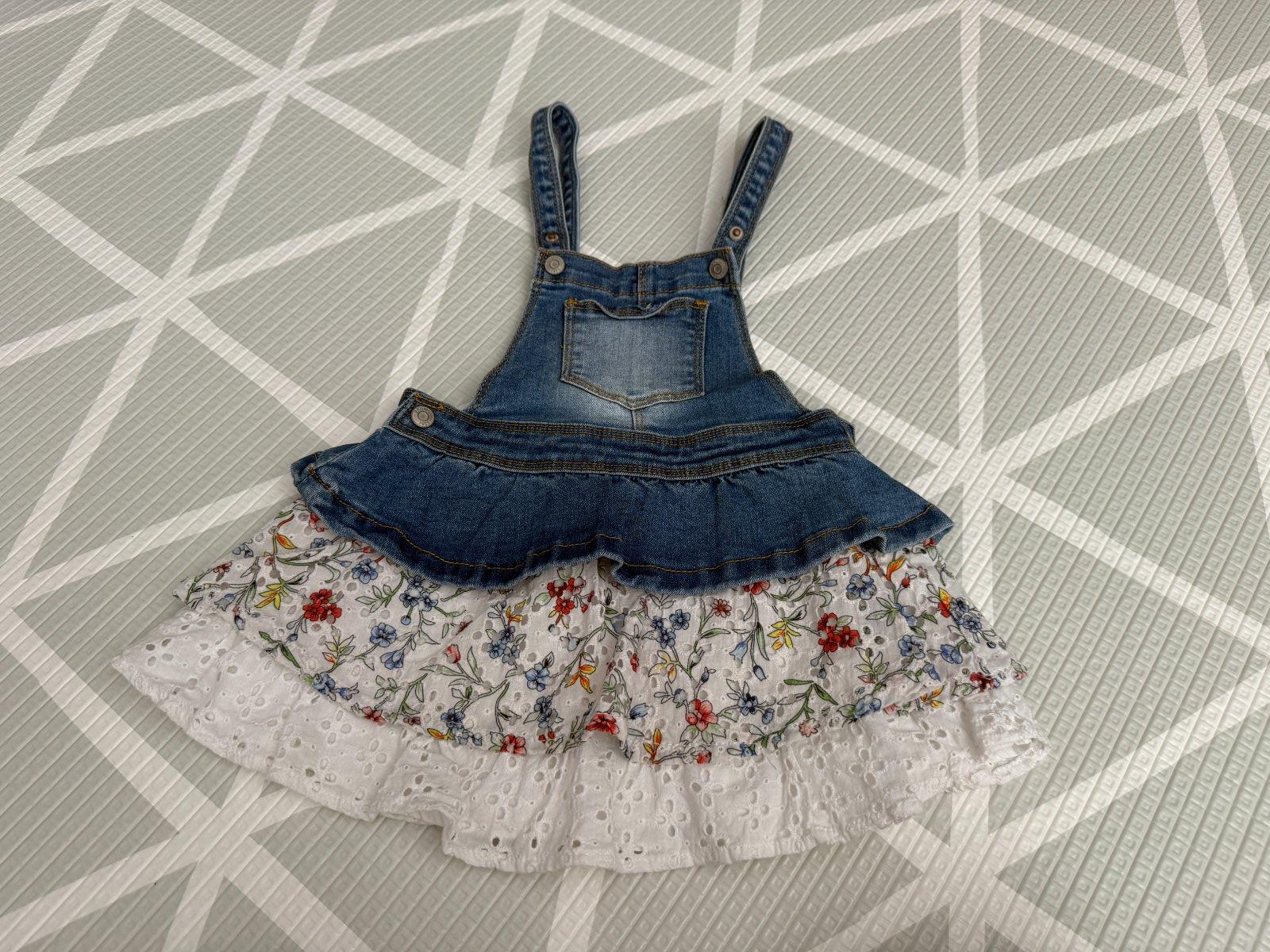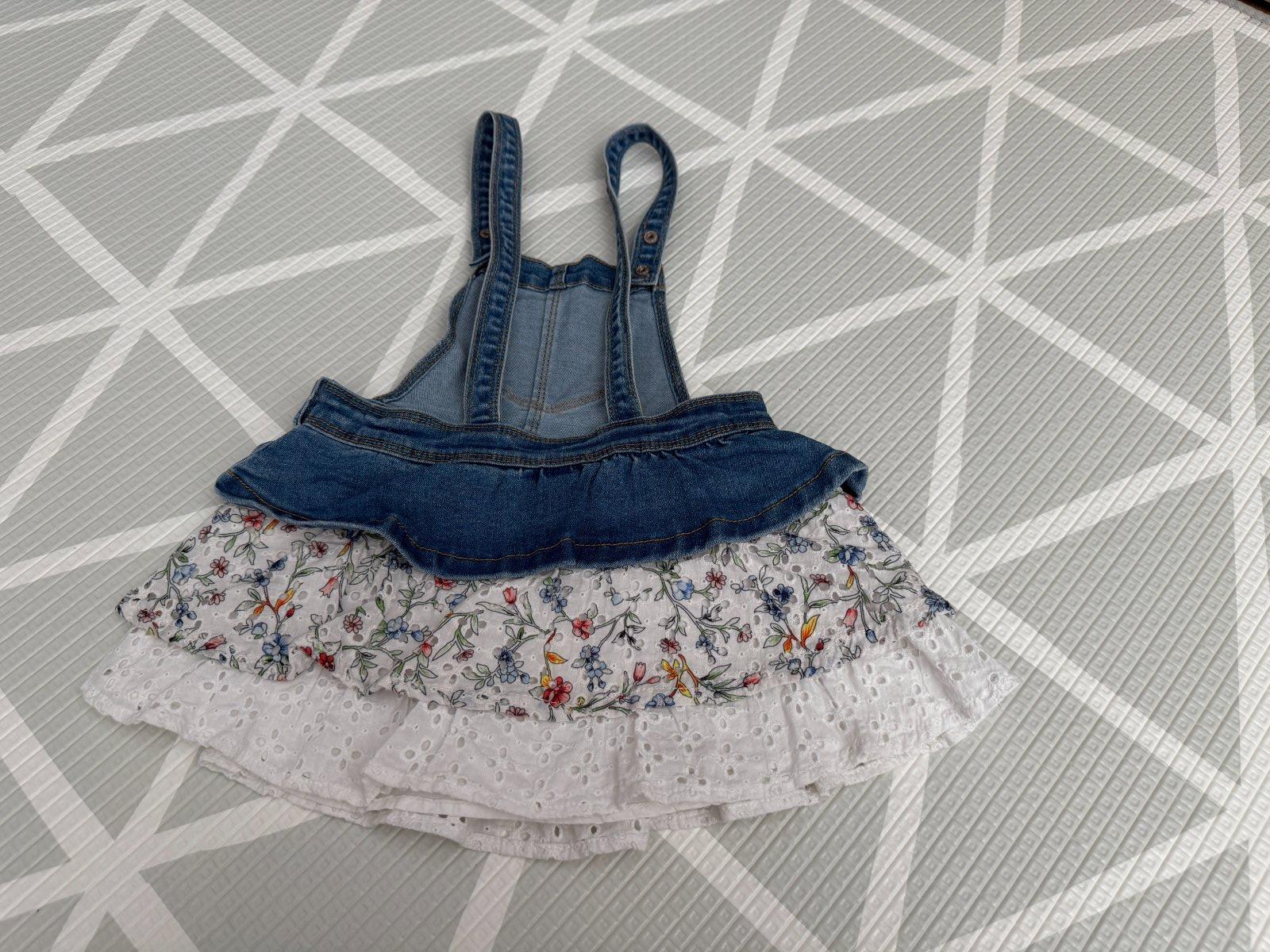 Riflová suknička na traky. V páse gumičky na regulovanie šírky. Top stav. Cena 5eur+pošta