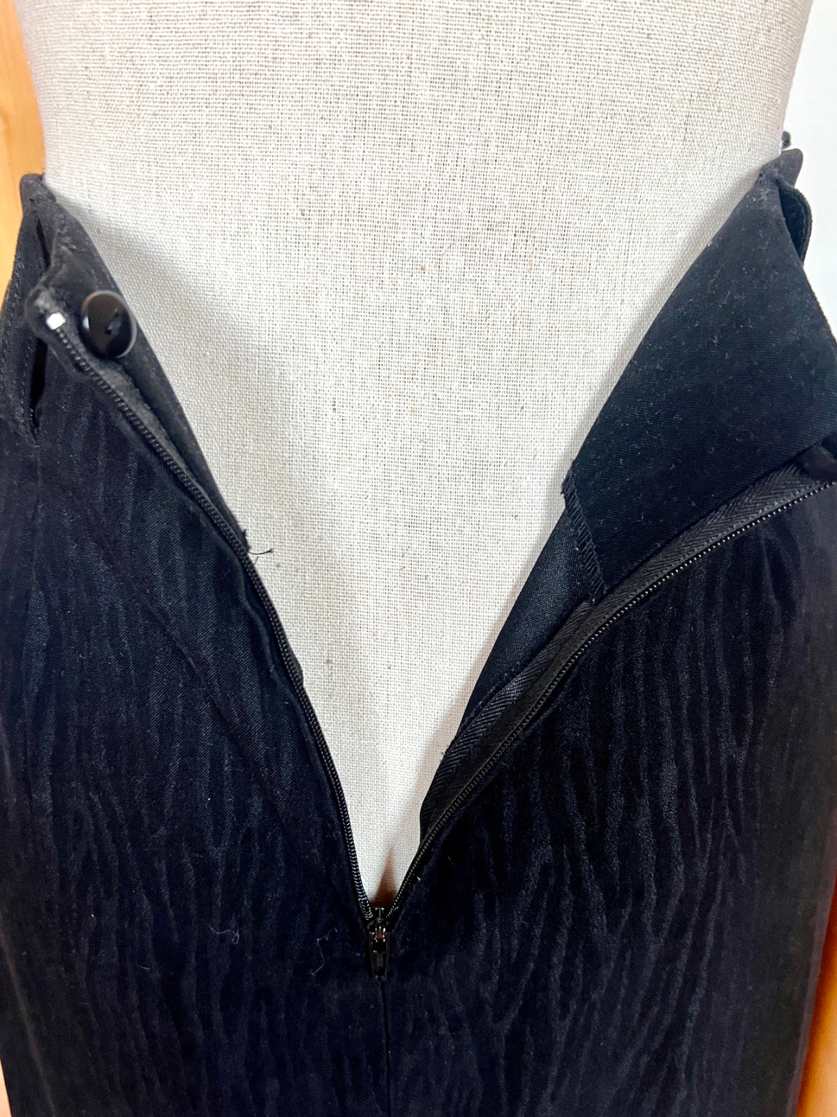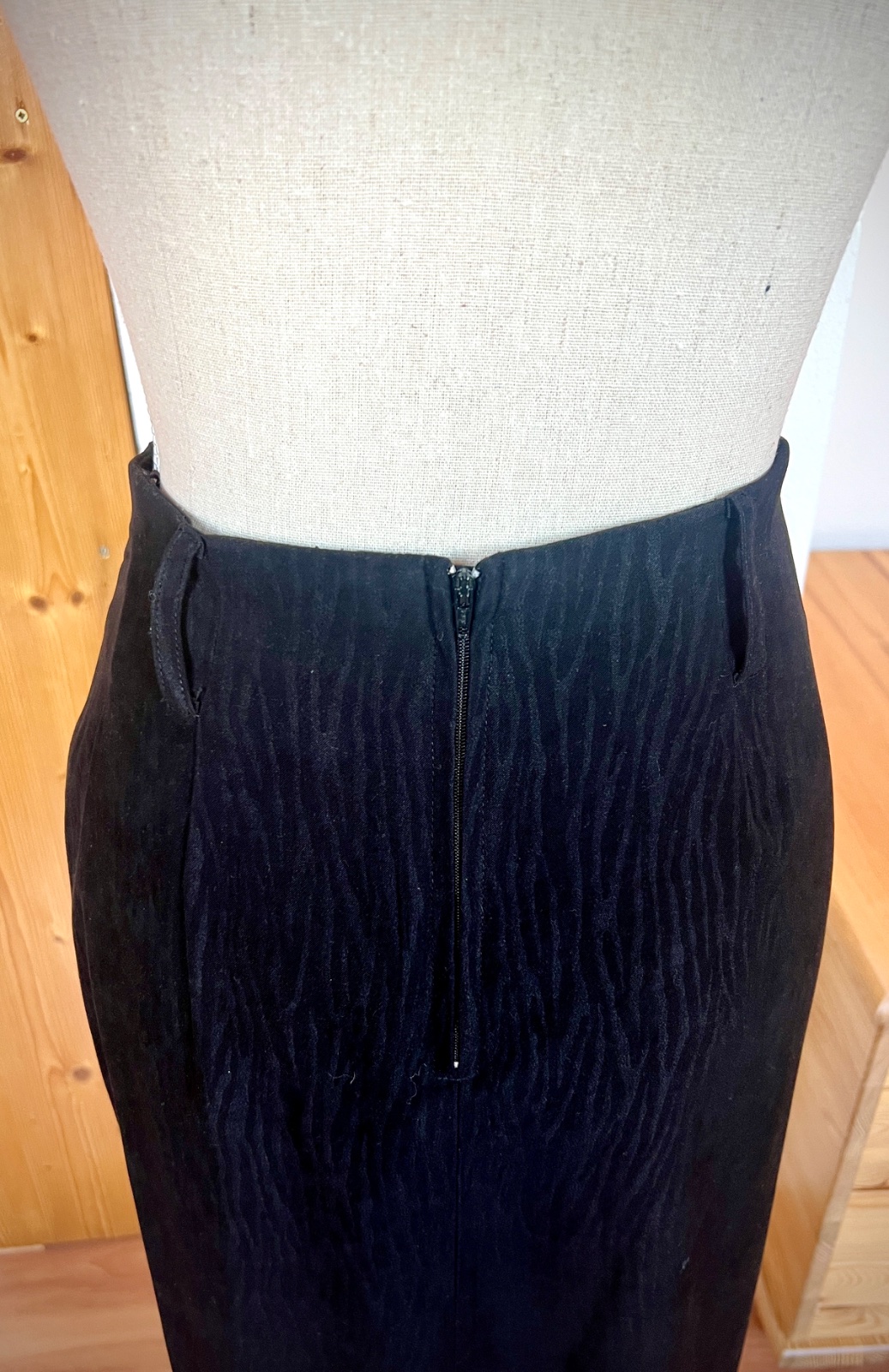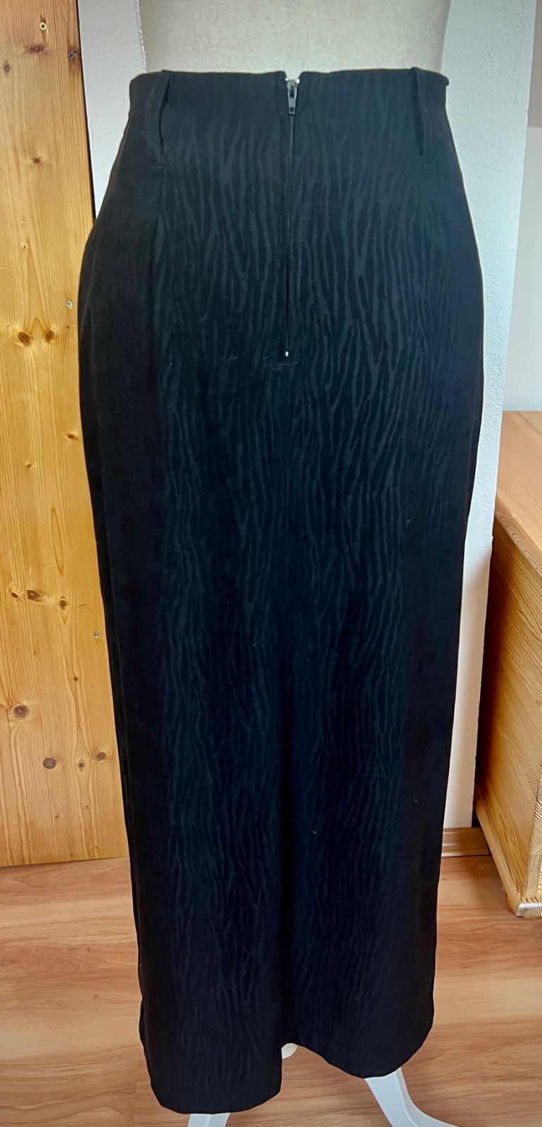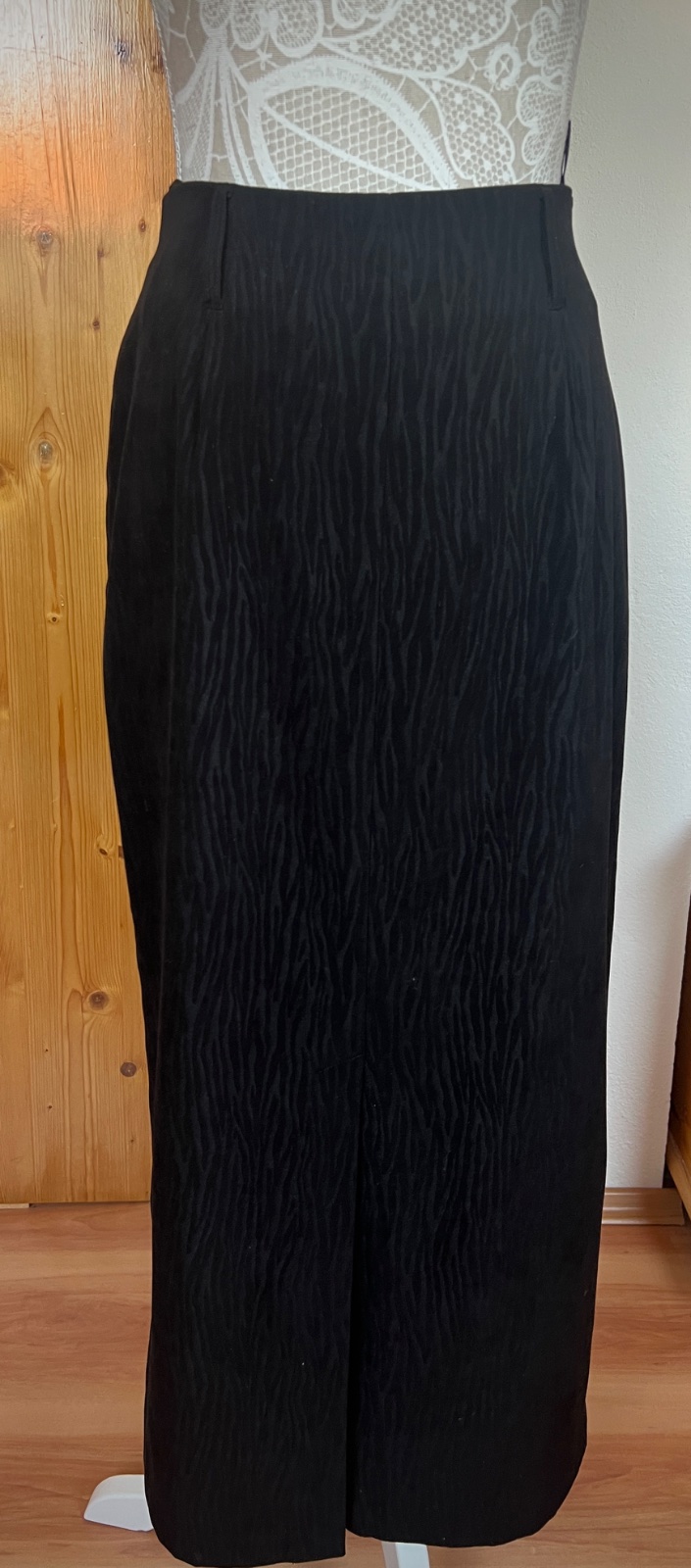 Čierna dlhá sukňa, ktorá sa zapína vzadu. Na spodku má rozparok, takže sa dobre nosí. Má jemný vzor, ktorý je tón v ropné, takže sa ťažko fotí, ale krásne vyzerá. Veľkosť 38. Značka Biaggini.