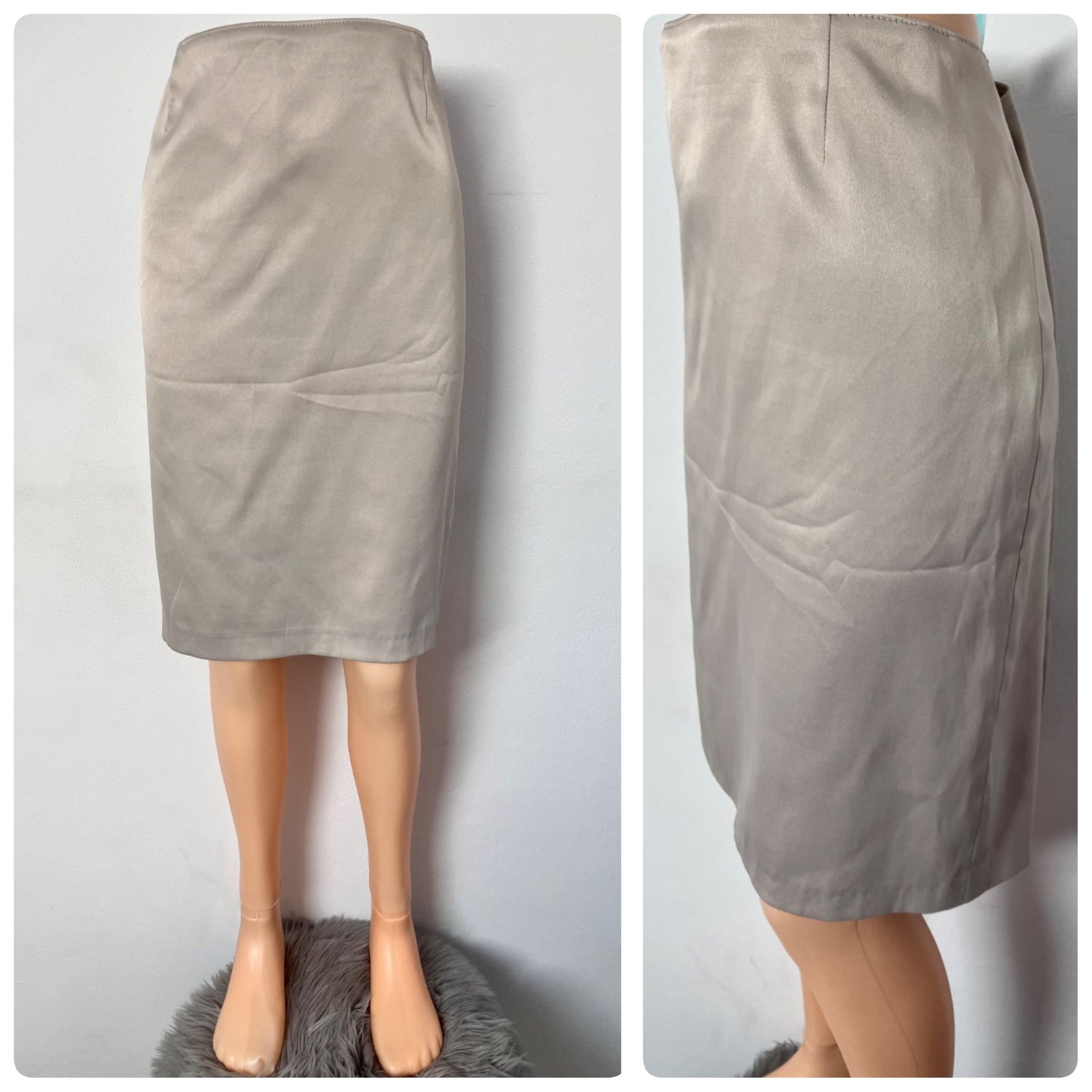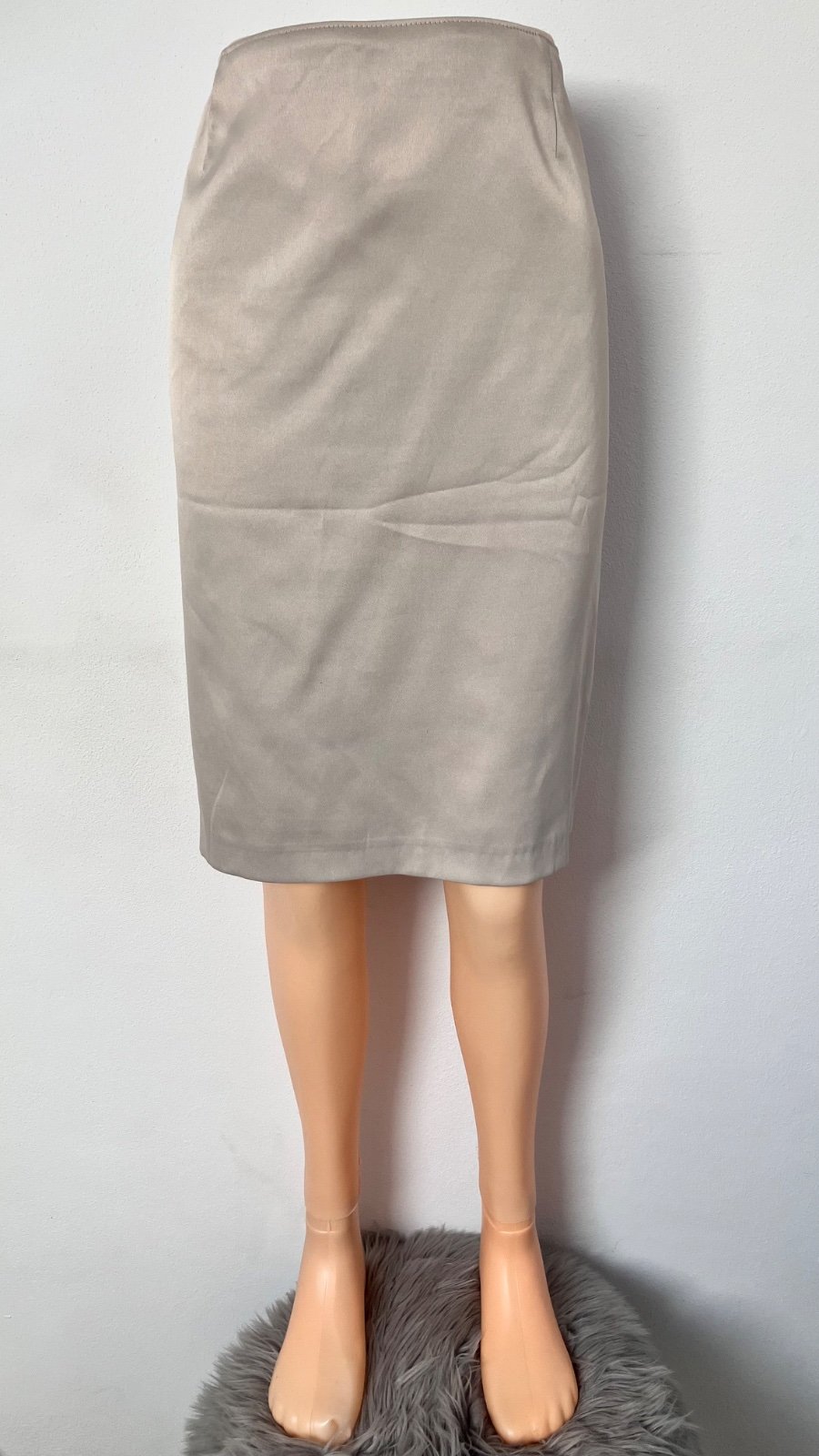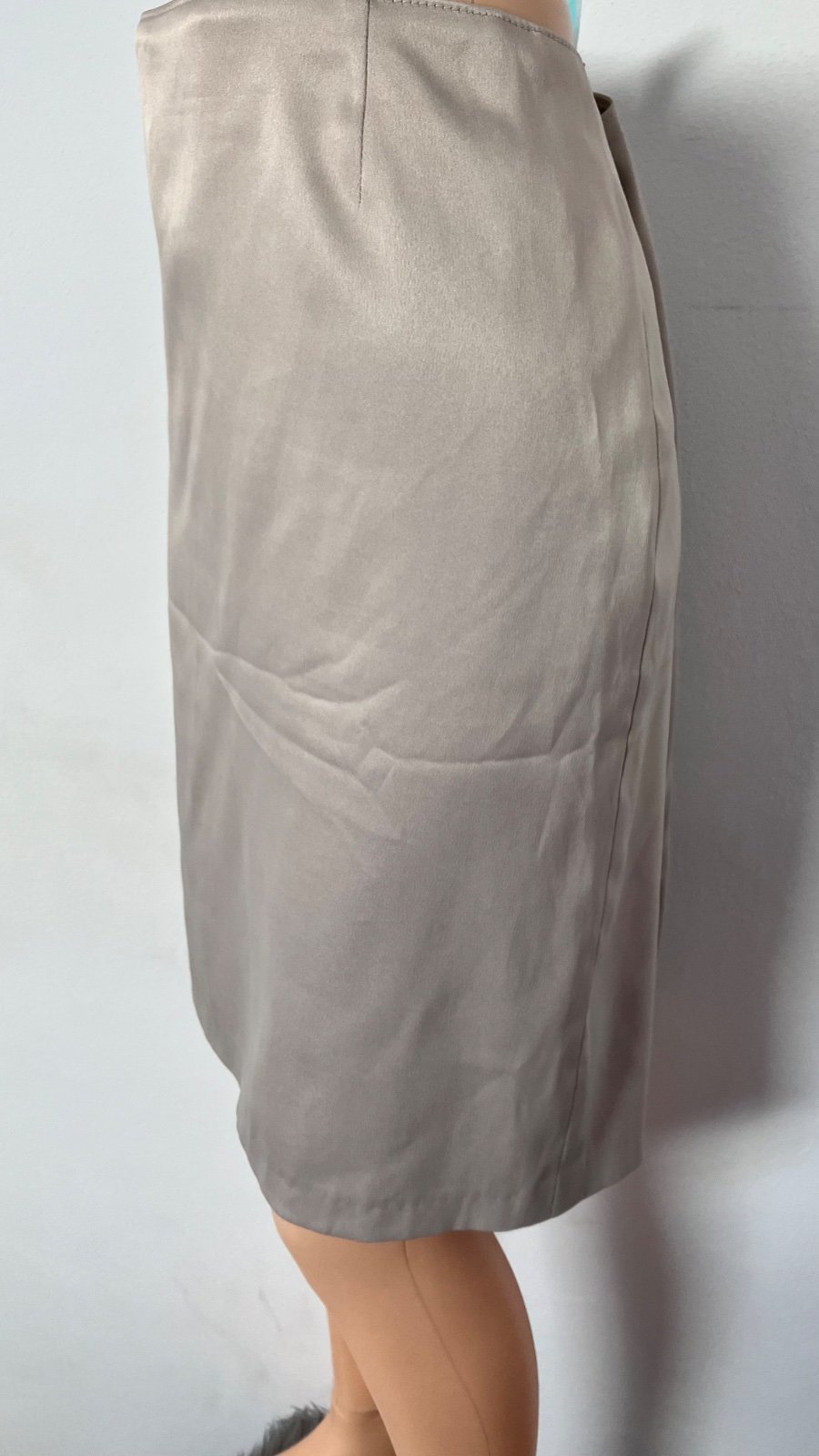 Dámska púzdrová sukňa, lesklá, hladká, nie je elastická, zapínanie vzadu na zips, nie je priesvitná, veľkosť cca M.
