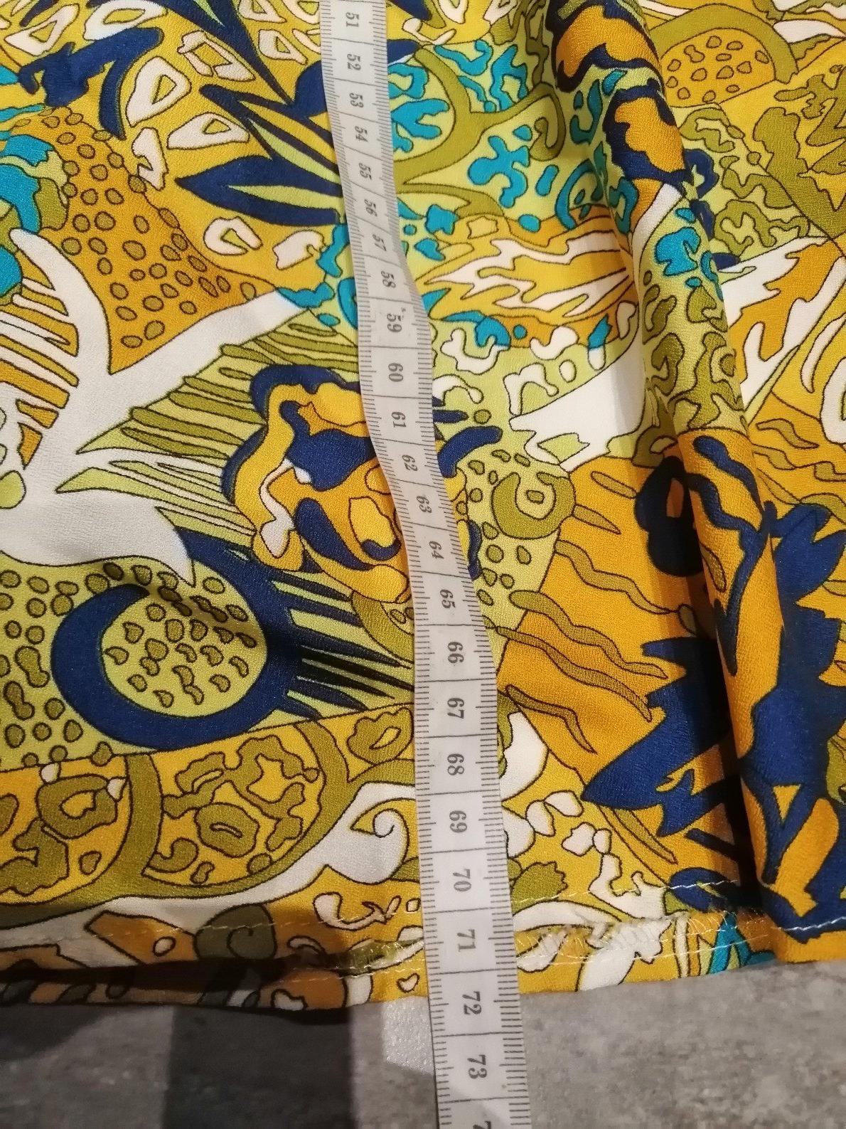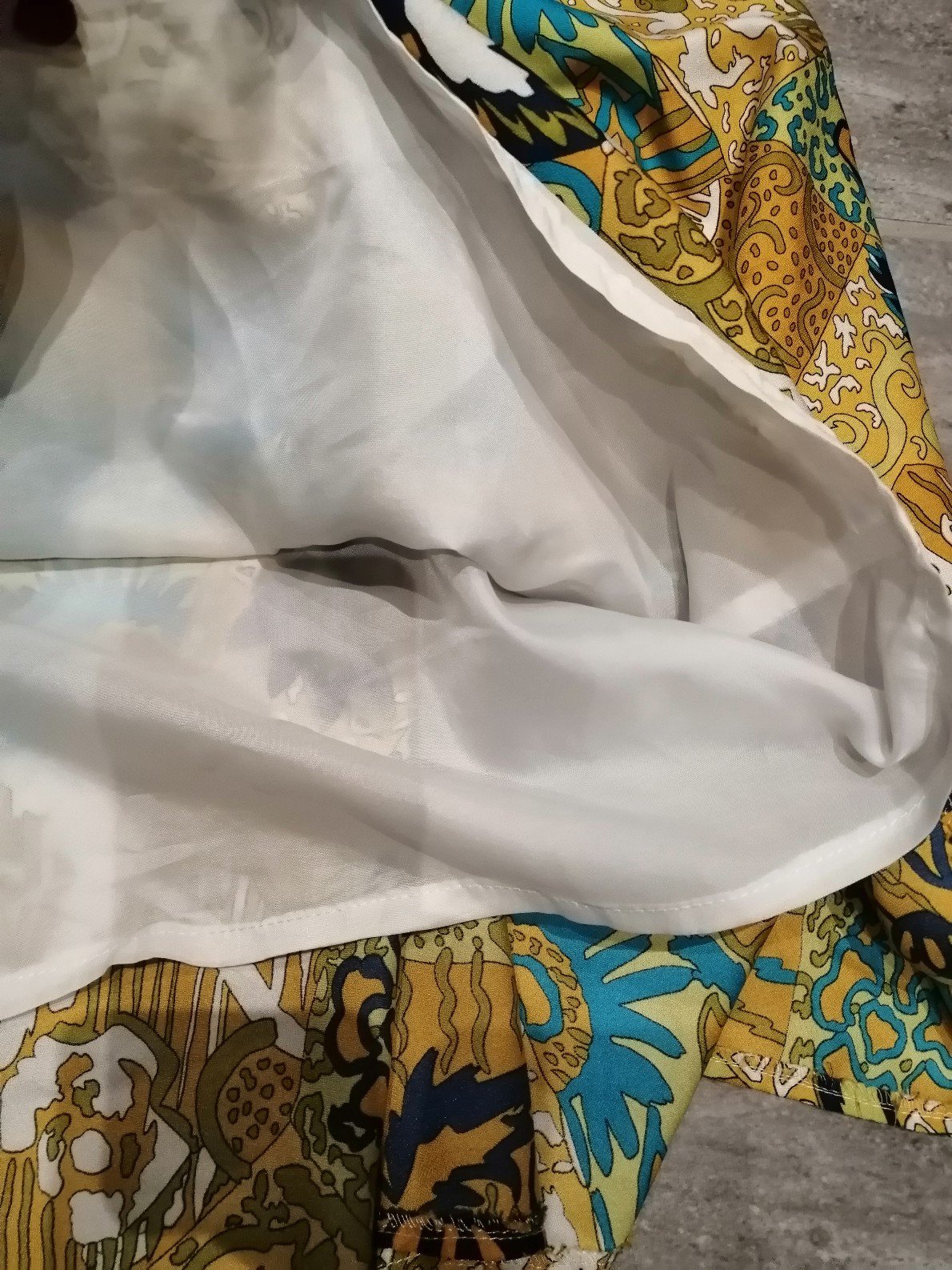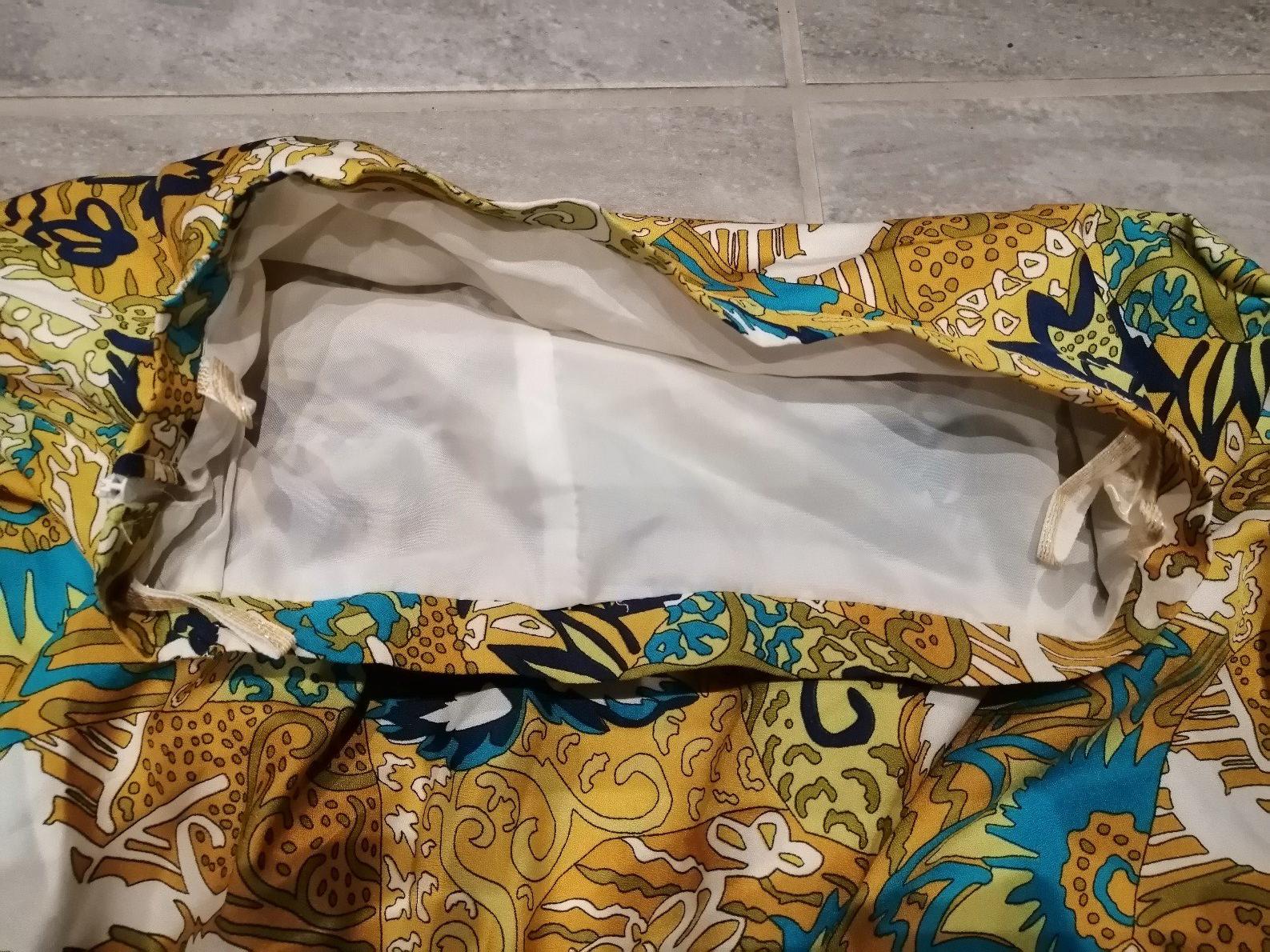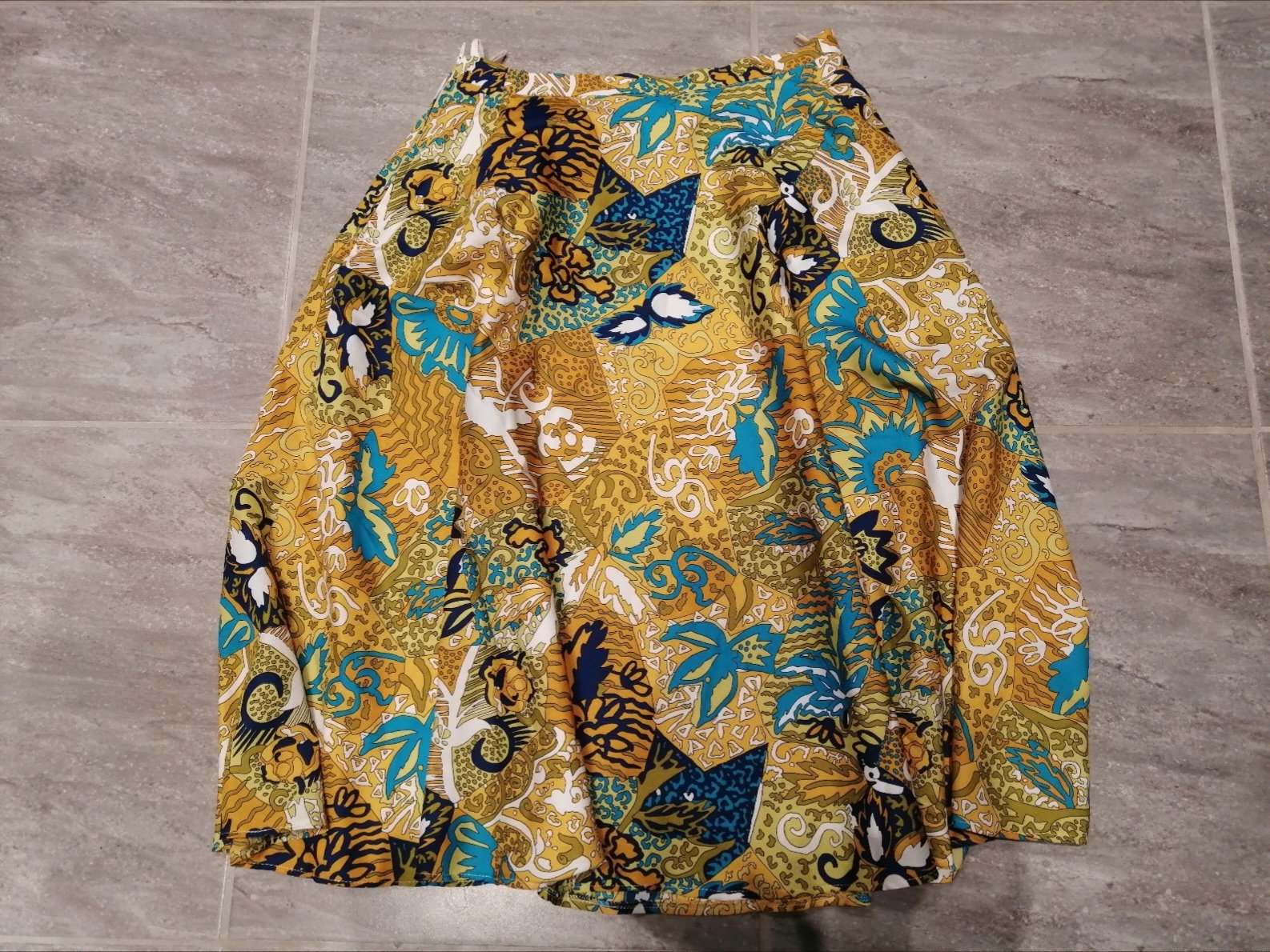 Ľahký polyester. Retro vzhľad. výborne sa kombinuje s jednoduchým tričkom, balerínkami a kardiganom do pása. Úplne super k všetkému bielemu / modrému.