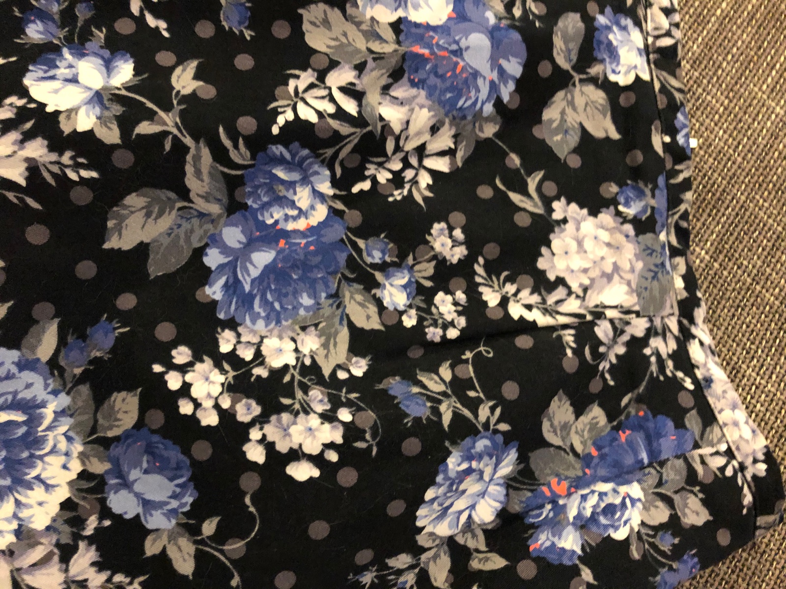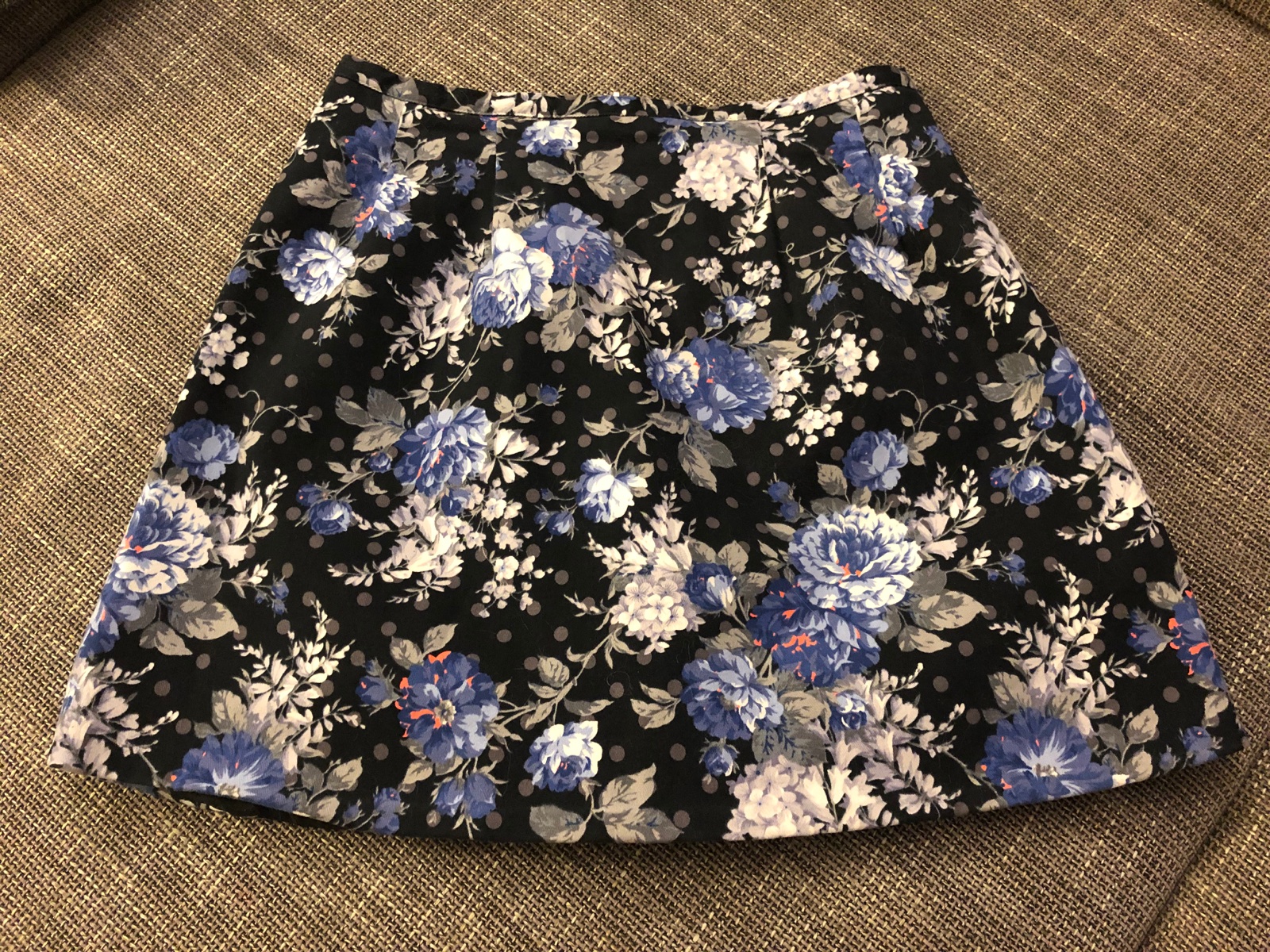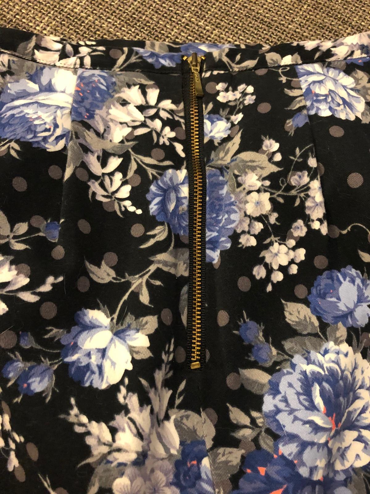 Kvietkova, tmavomodrý podklad. Vzadu na kratky zips, putka na zavesenie, pekne sedi.