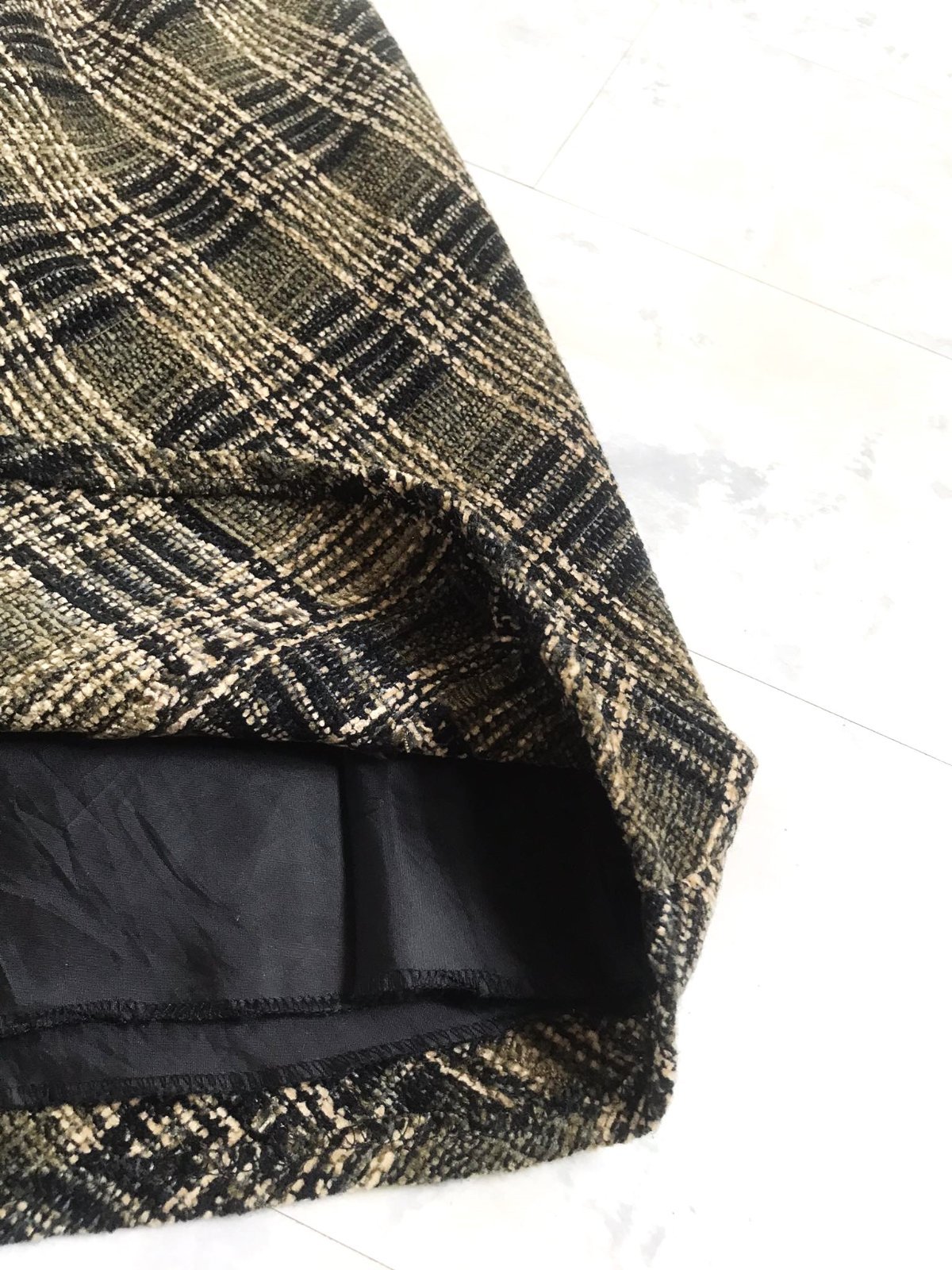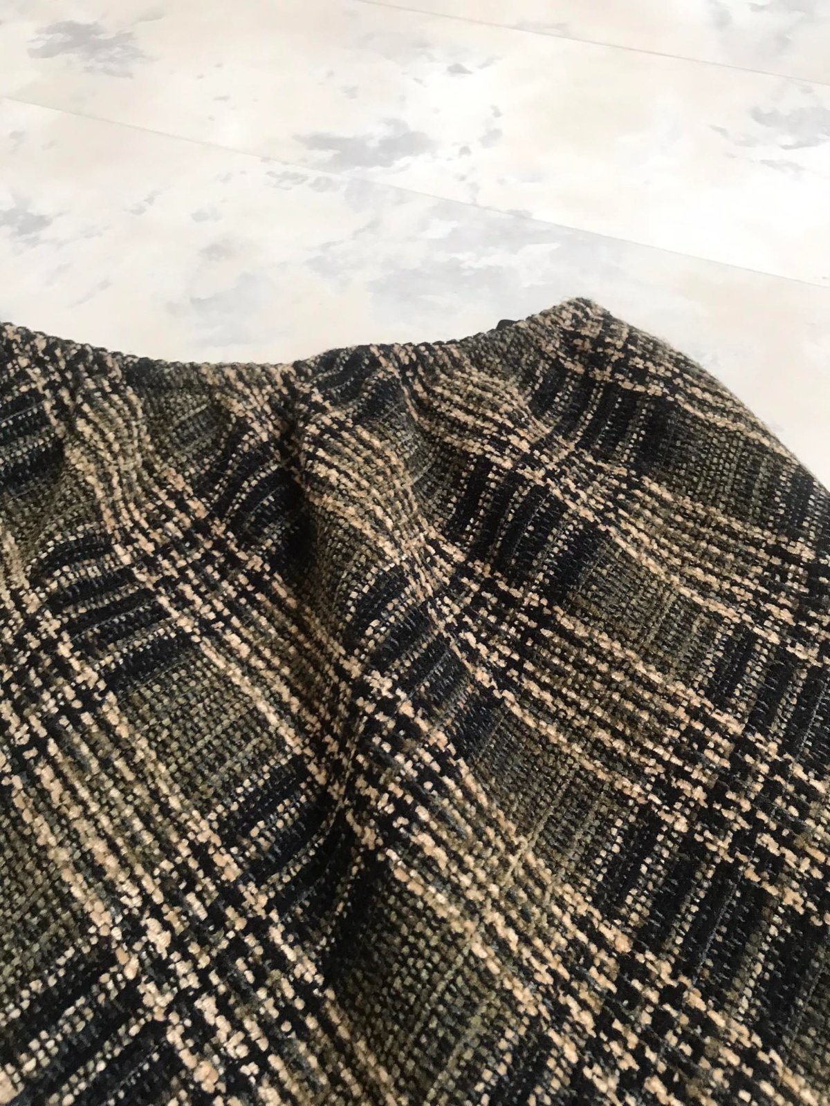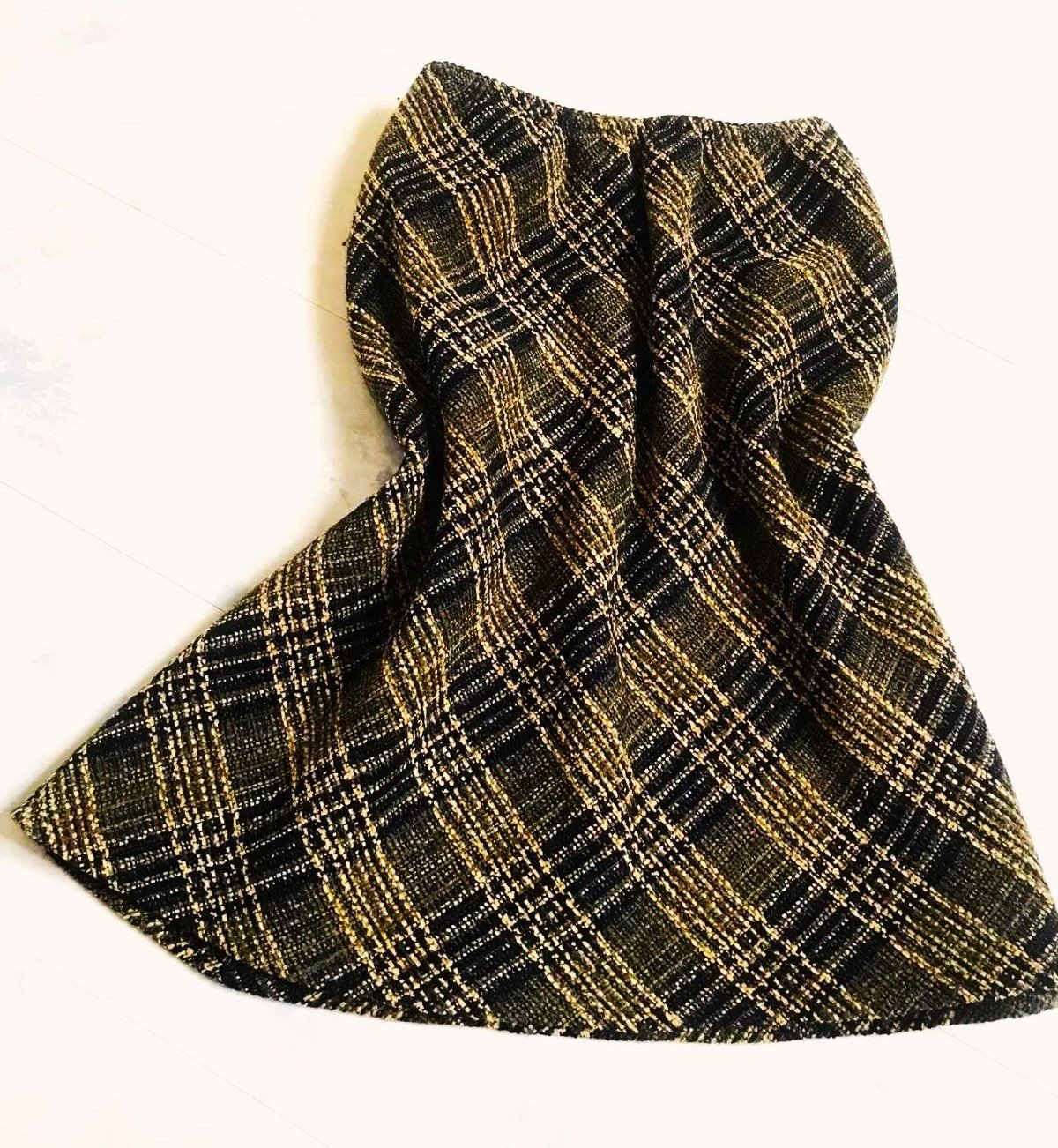 krásna moderná podšitá károvaná sukňa nad kolená z tvídu s charakteristickým vzorom v čiernych, žltých (horčicových) a hnedých odtieňoch,kvalitný materiál - tkané buklé s naznačeným jemným uzlíčkom,v páse jemná gumička,je jemne do áčka,super k hrubým pančuchám,kotníkom, čižmám ale aj k športovým kanadám,