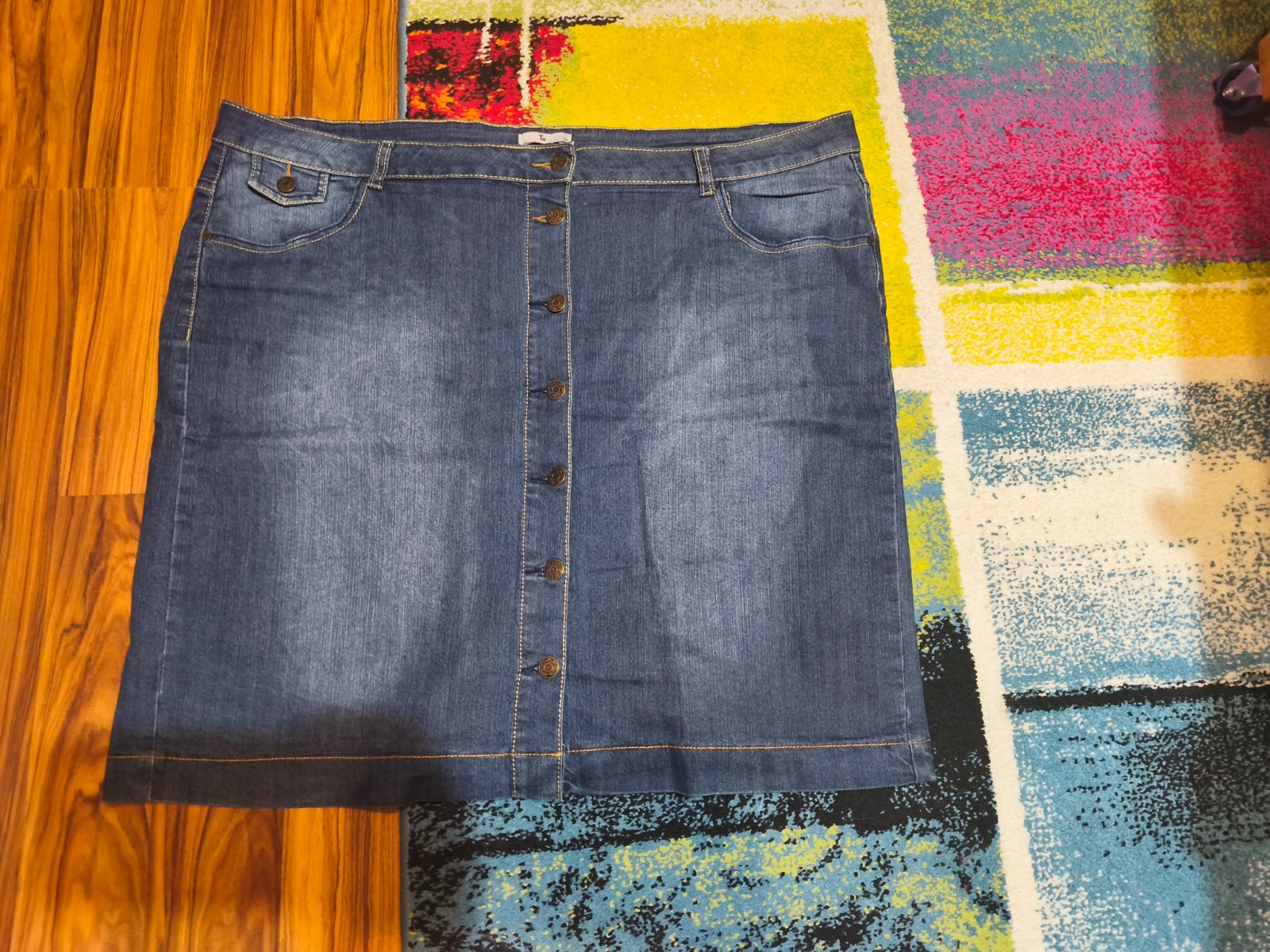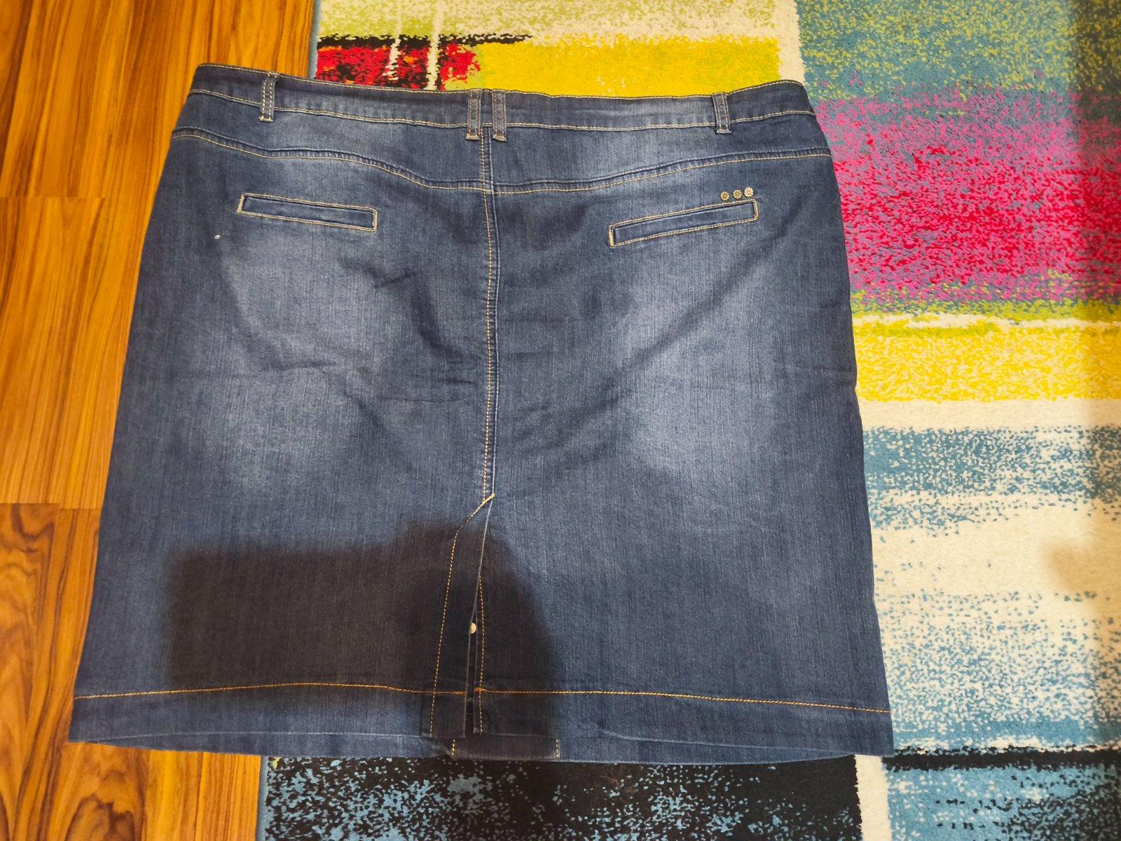 Krásna sukňa na gombíky vpredu, vzadu imitačné vrecká. Dĺžka 57 cm, pás 120 cm.