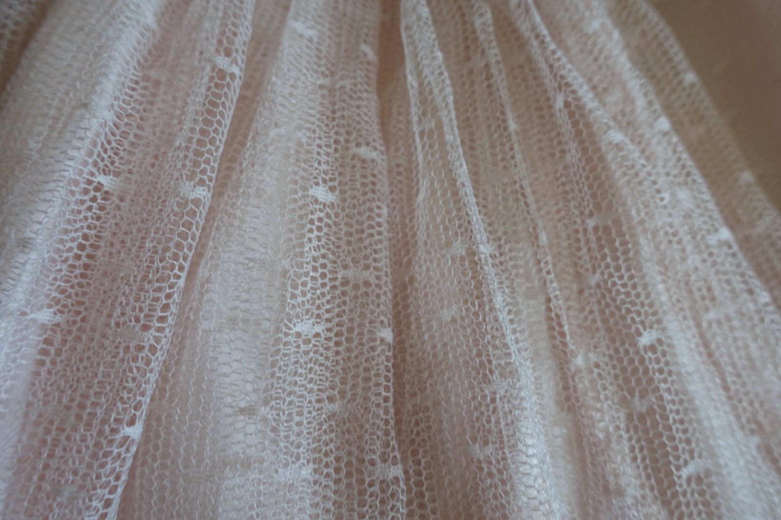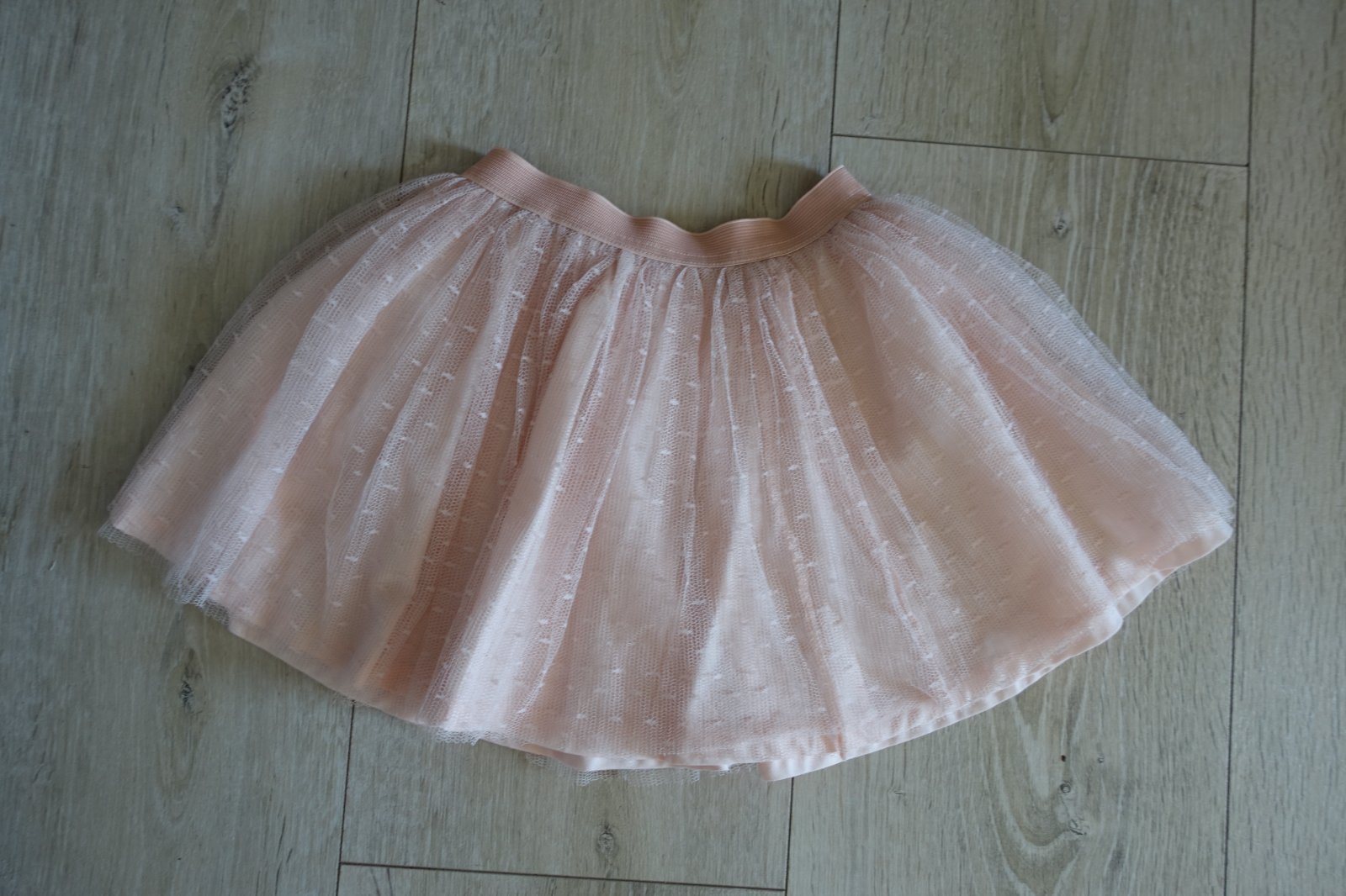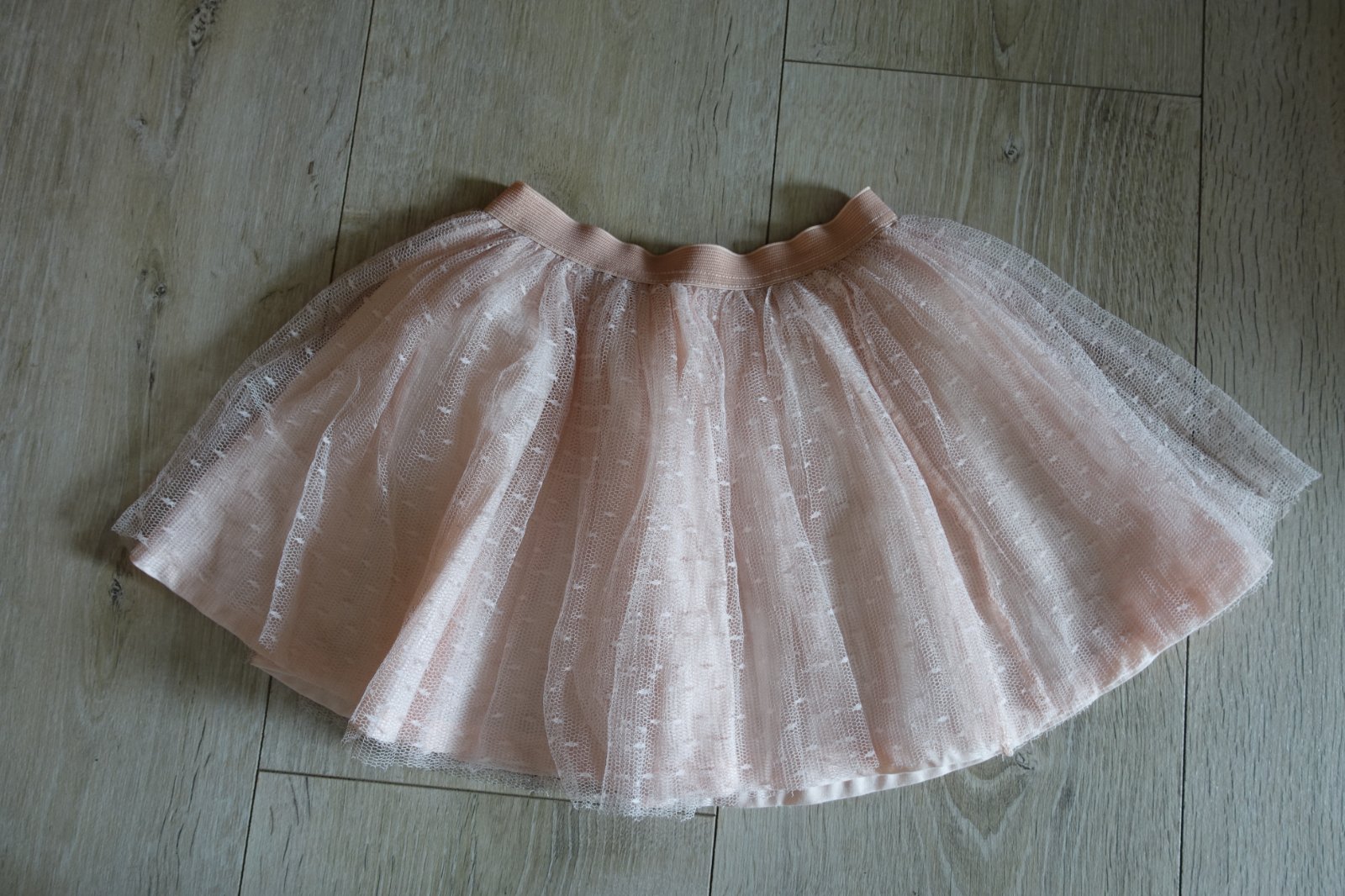Predám krásnu 2 vrstvovú bledoružovú pastelovú sukničku s trblietavým zlatým pásom. Vo vrchnej čipke má vzor - guličky. Mali sme ju 1x, ale je v peknom stave, až top stav. Dĺžka po spodničku je 32 cm. Šírka pásu v kľude je 23,5 cm.