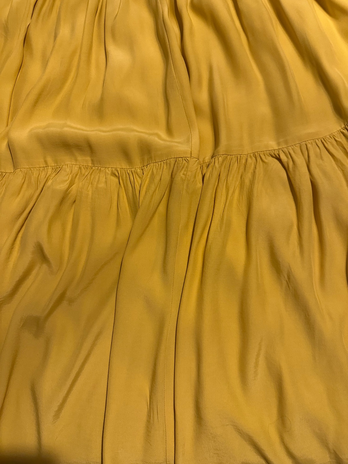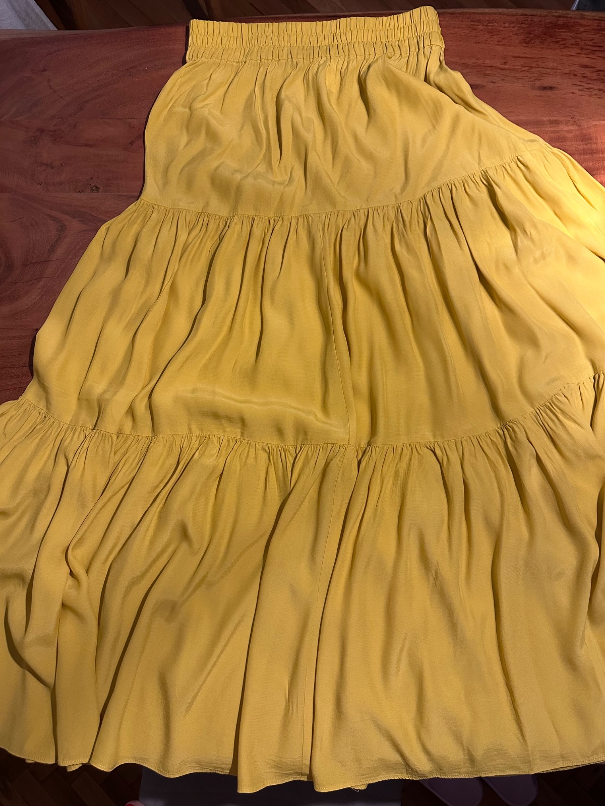 Ľahká letná sukňa, farba slnečnice, materiál viskóza, chladivý, padavý. Pás 6 cm, pevnejší do gumučiek. Tri široké nariasené pásy vytvárajú objem sukne. Dĺžka 100 cm, šilrka pás 2 x 33 cm, roztiahne sa na 2 x 37 cm. Top stav bez poškodení. Dobre kombinovateľná, aj k teniskám aj k sandálom, do práce, na voľný čas aj na dovolenku.