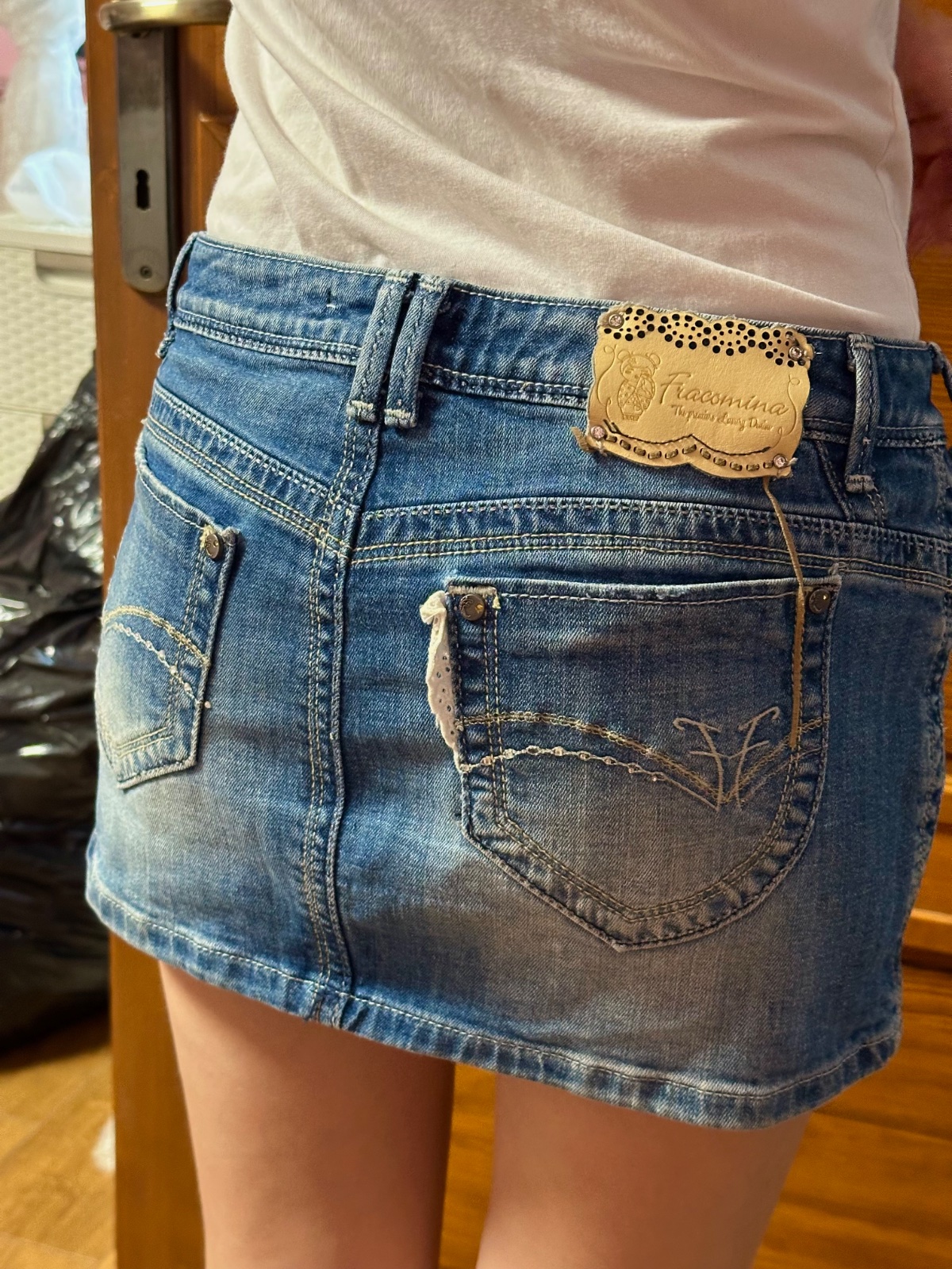 Rifľová mini sukňa značky Fracomina s vyšúchaným efektom a zaujímavými detailmi na vreckách.