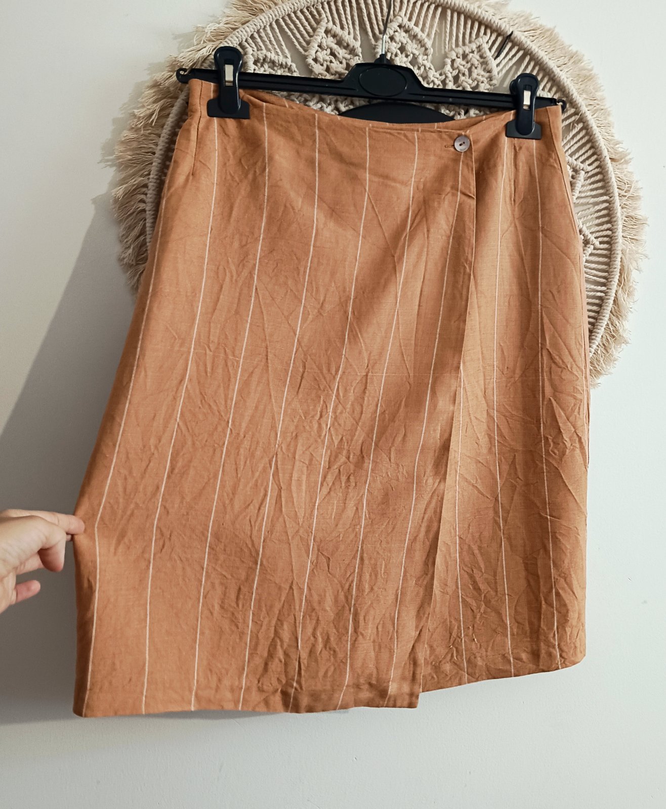 Predám hnedú minisukňu, veľkosť 38/M. Je nosená, no v top stave bez poškodení. Vpredu na jednej strane ozdobné prešívanie, vzadu na jednej strane na opasku ozdobná aplikácia. Pás 2x 41 cm, dĺžka 32...