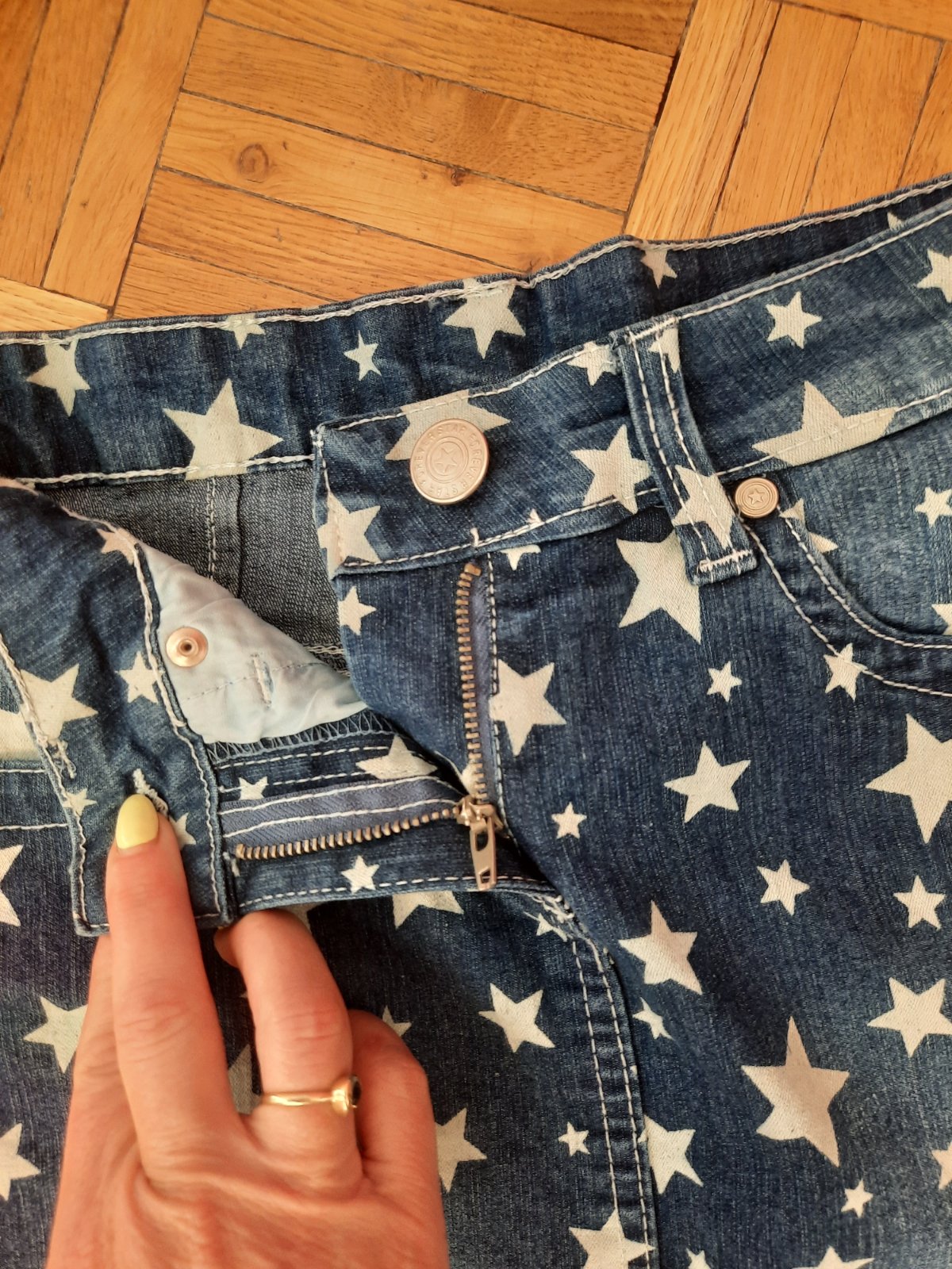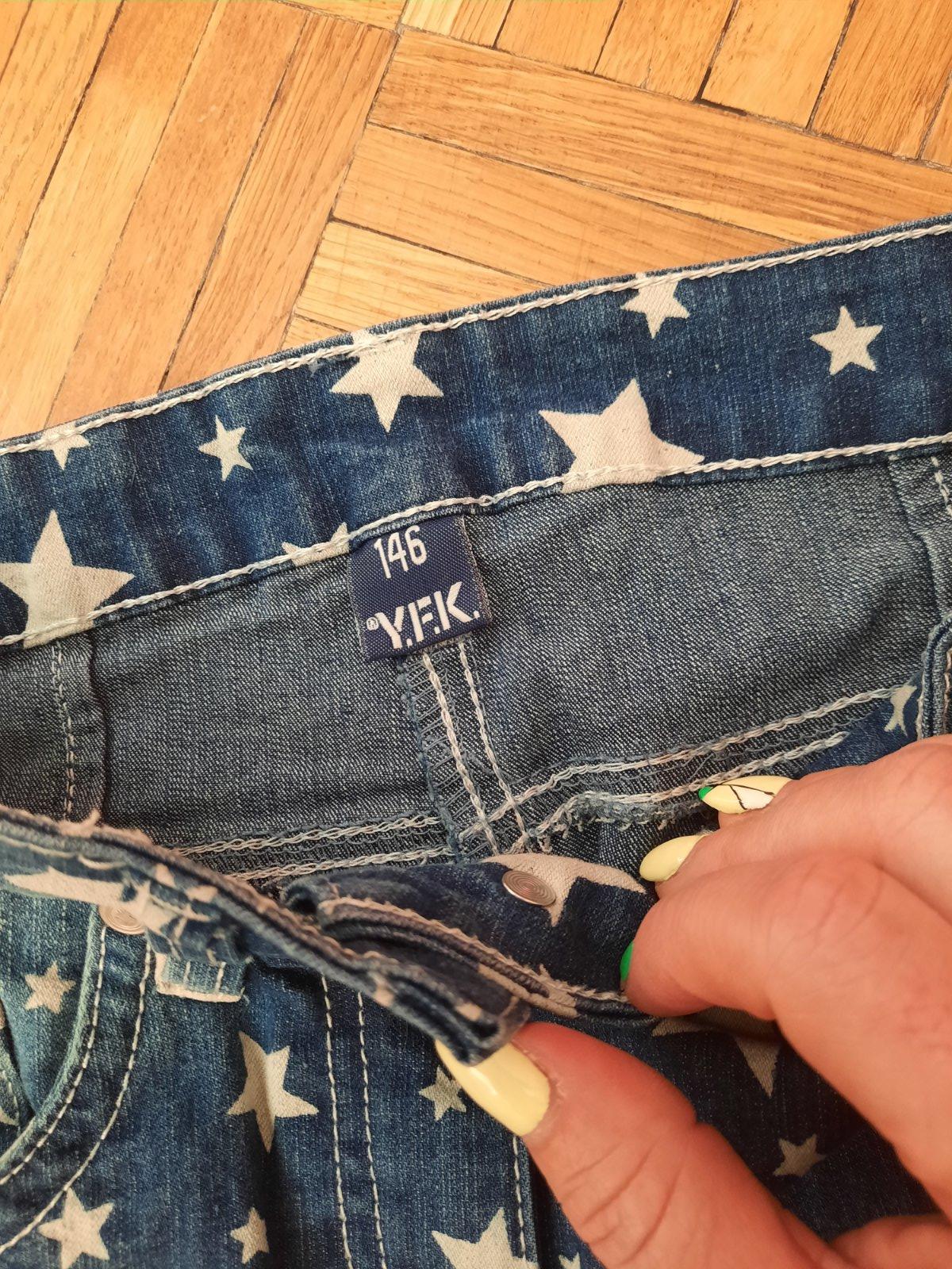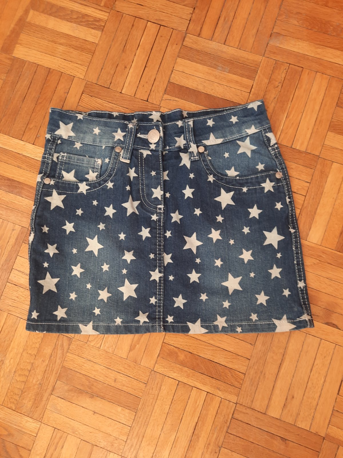 Veľmi pekná rifľová vzorovaná sukňa v super stave. Vačky sú vpredu aj vzadu.