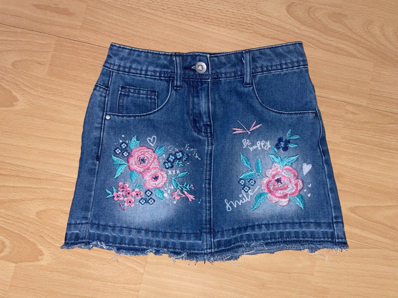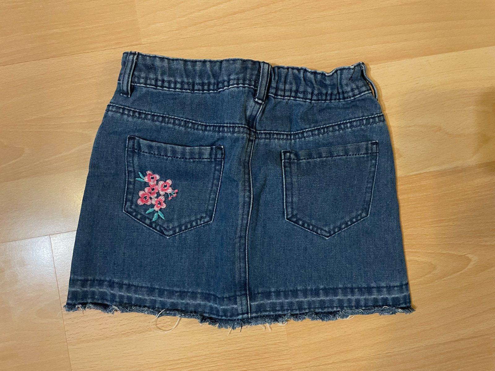 Predám rifľovú sukňu s kvetovou vyšívanou aplikáciou na prednej časti aj zadnom vrecku. Sukňa má prispôsobiteľný pás na gumu s gombíkmi. Top stav