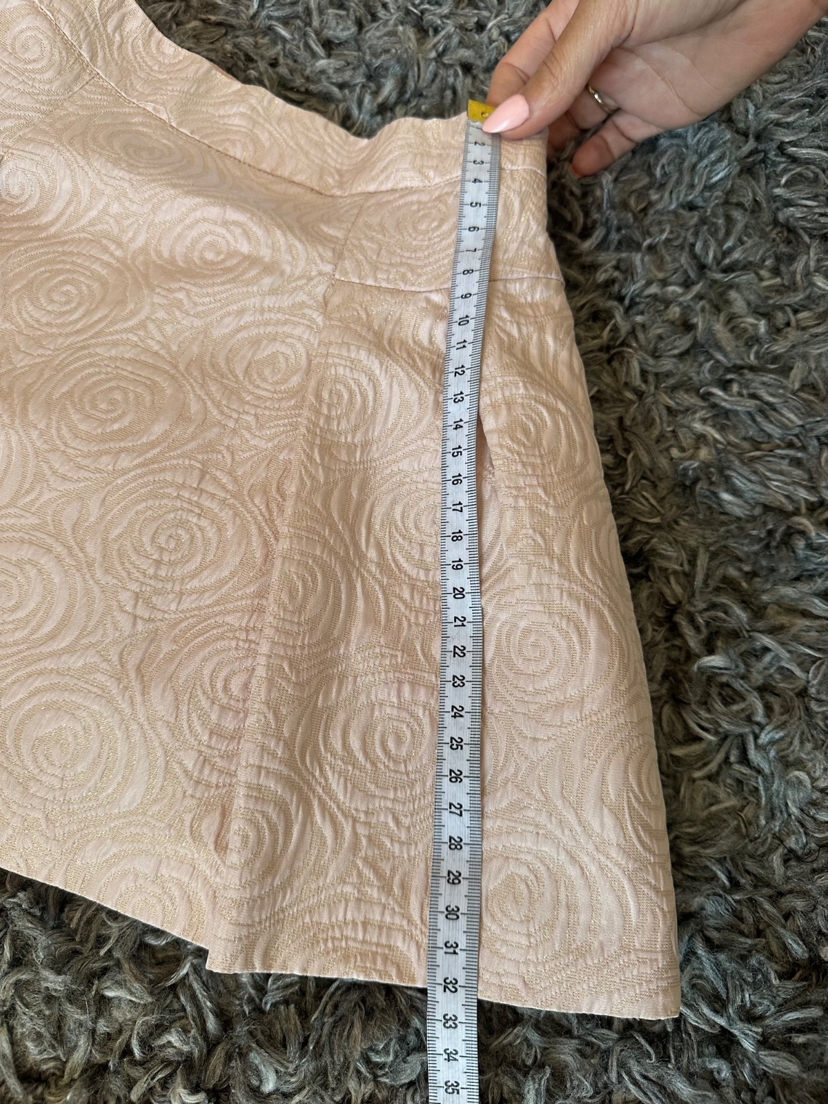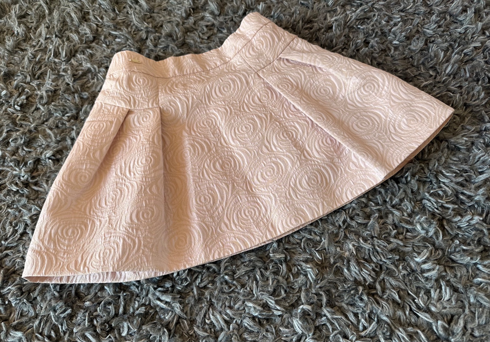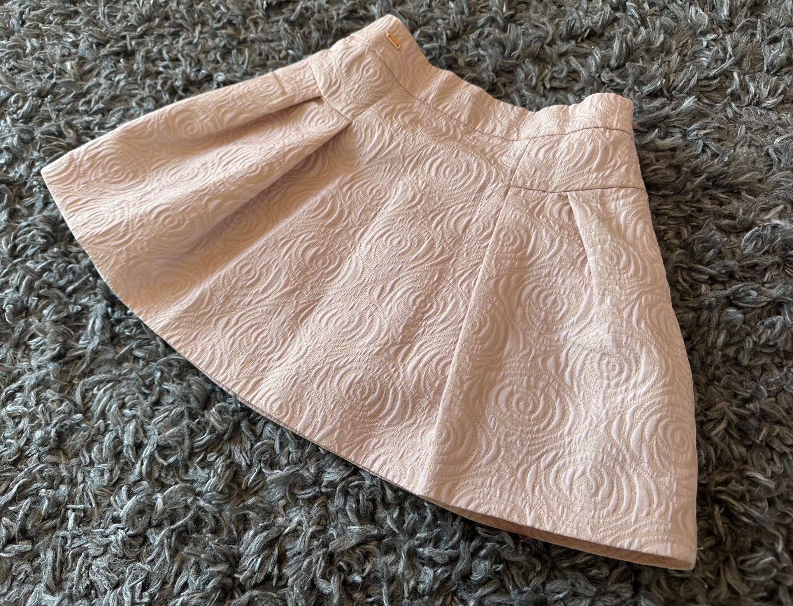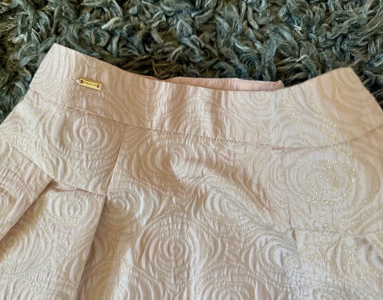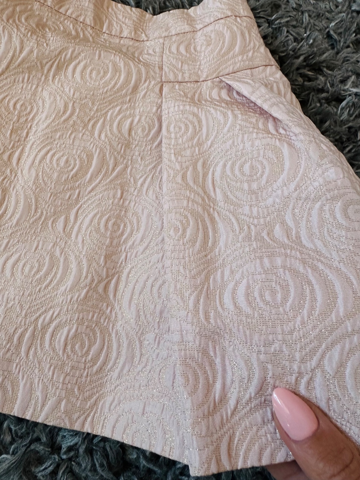 Raz oblečená. Farba je pudrovo ružová s ružičkami a zlatými trblietkami.