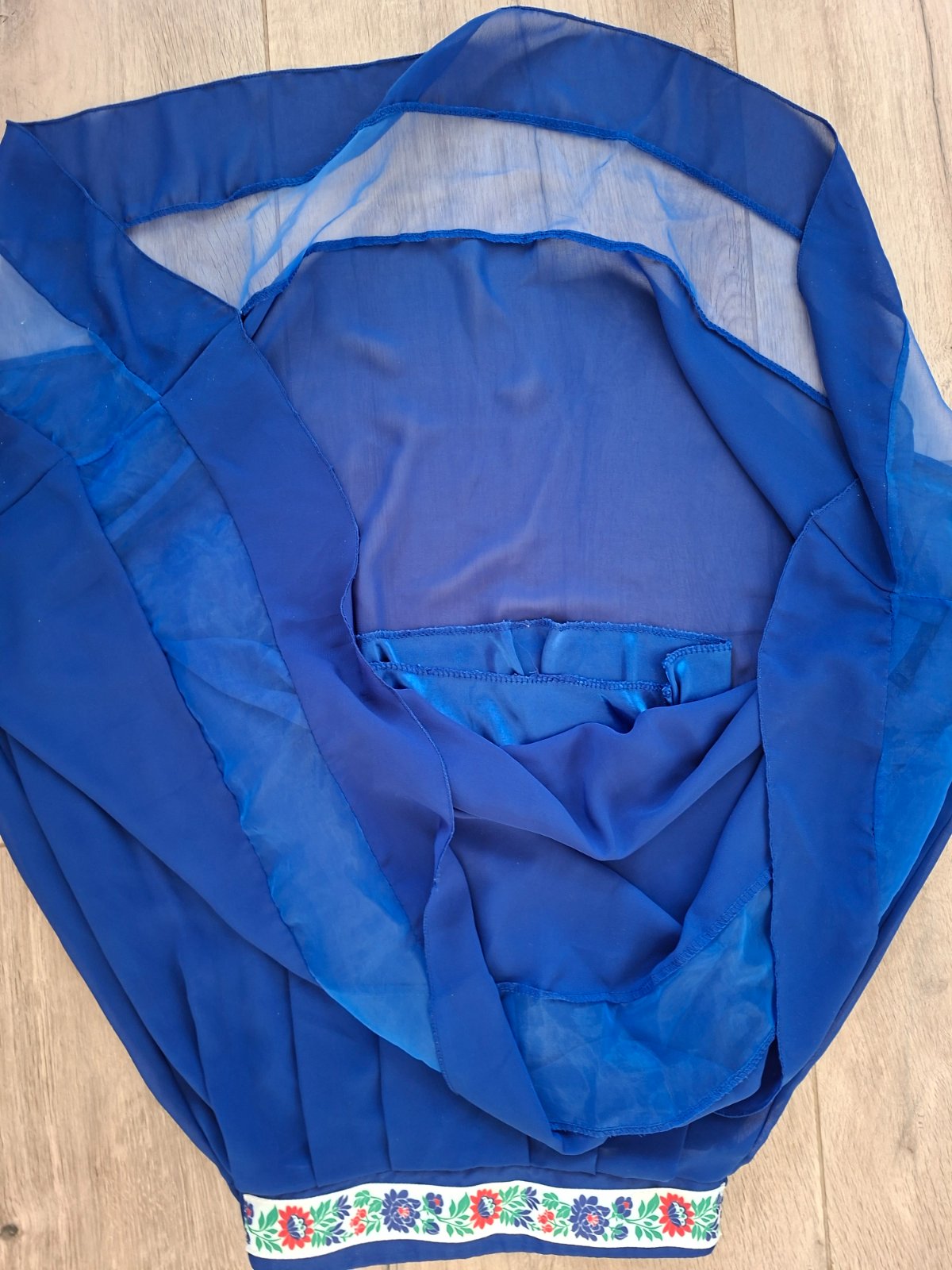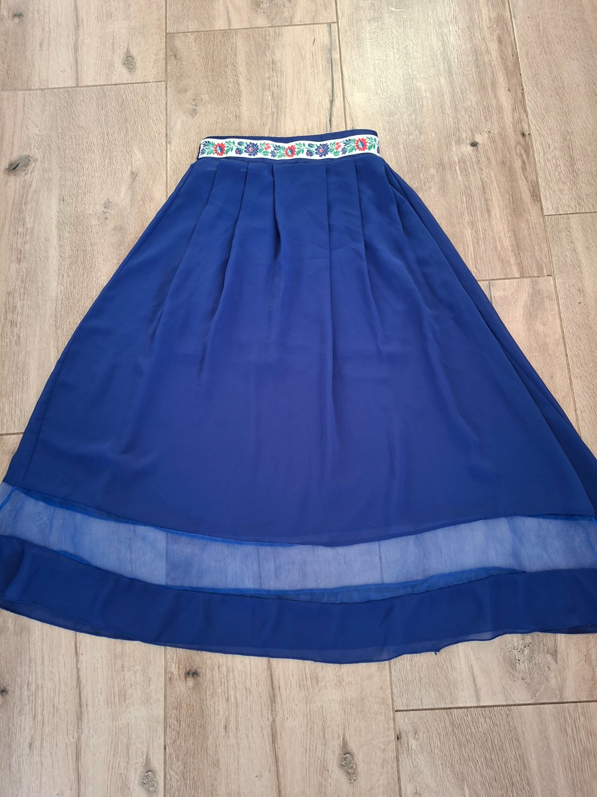 S kratkou podsivkou. V pase folklorny motiv. Vzadu je na gumu. Dlzka 82cm
