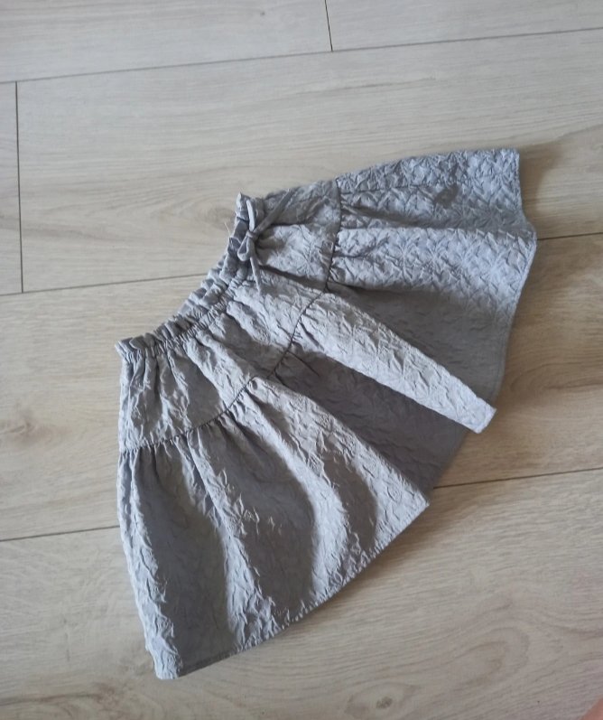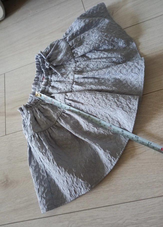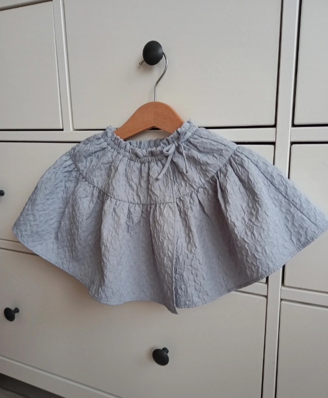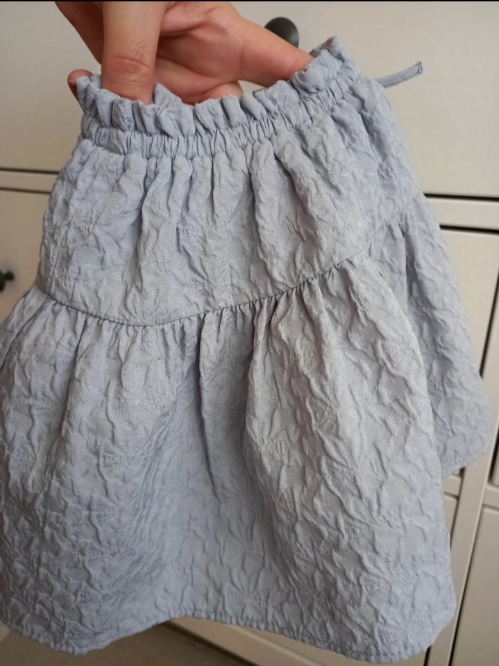 Ľahká 2 vrstvová suknička s volánom do gumičky, ozdobené mašličkou. Bledomodrá, mierne lesklá látka s textúrou. Podšívka bavlna, vrch neviem. Bez chyby. Tie škvrny robí objektív, suknička je bez chyby, minim. nosená. Dĺžka 25cm. Ideálne na leto. Priedušná, nekrčivá.