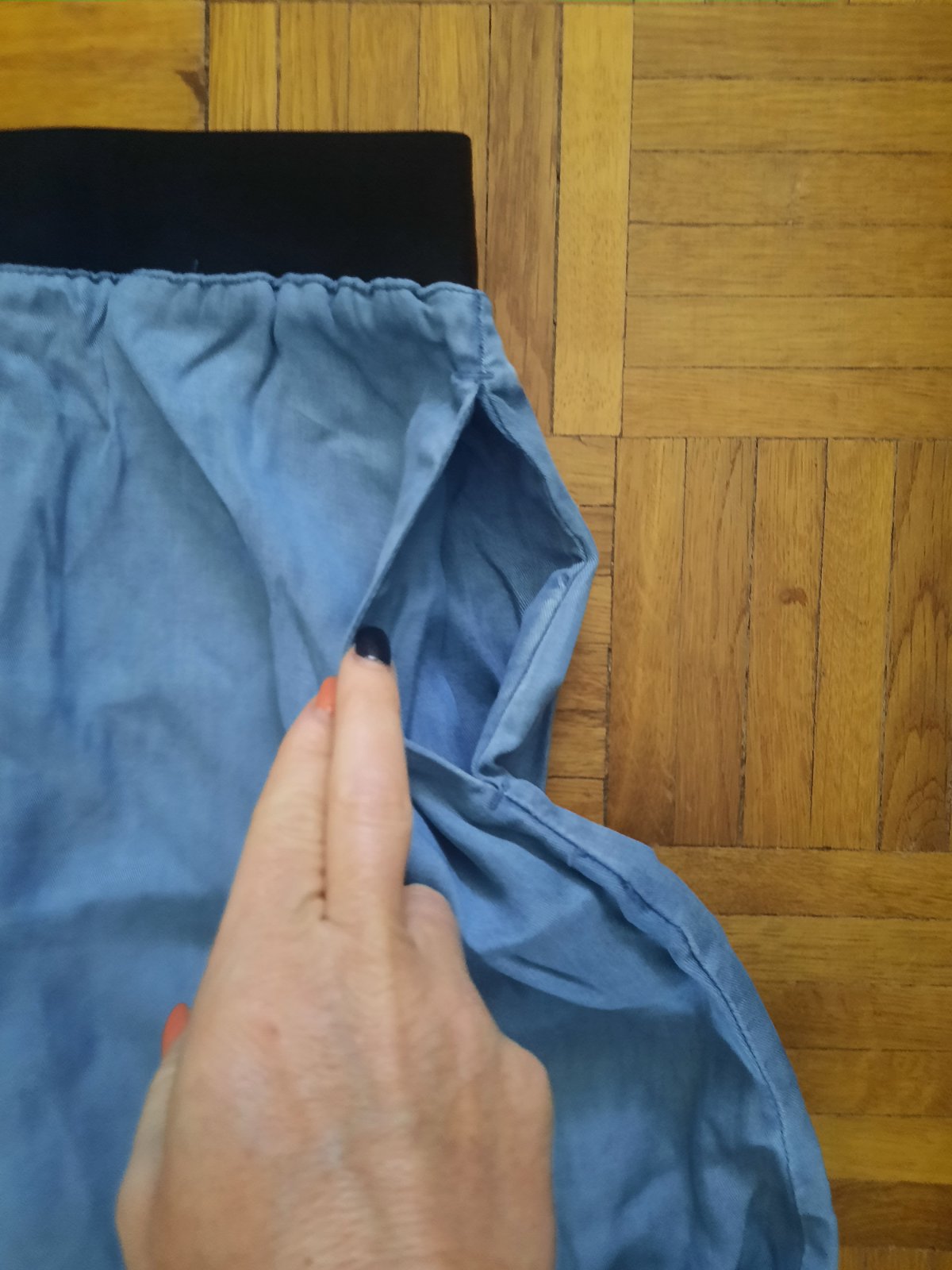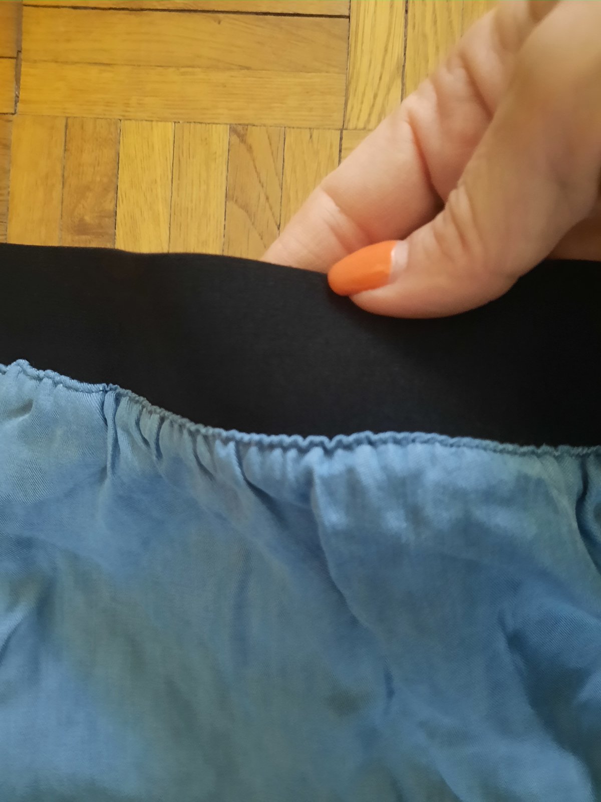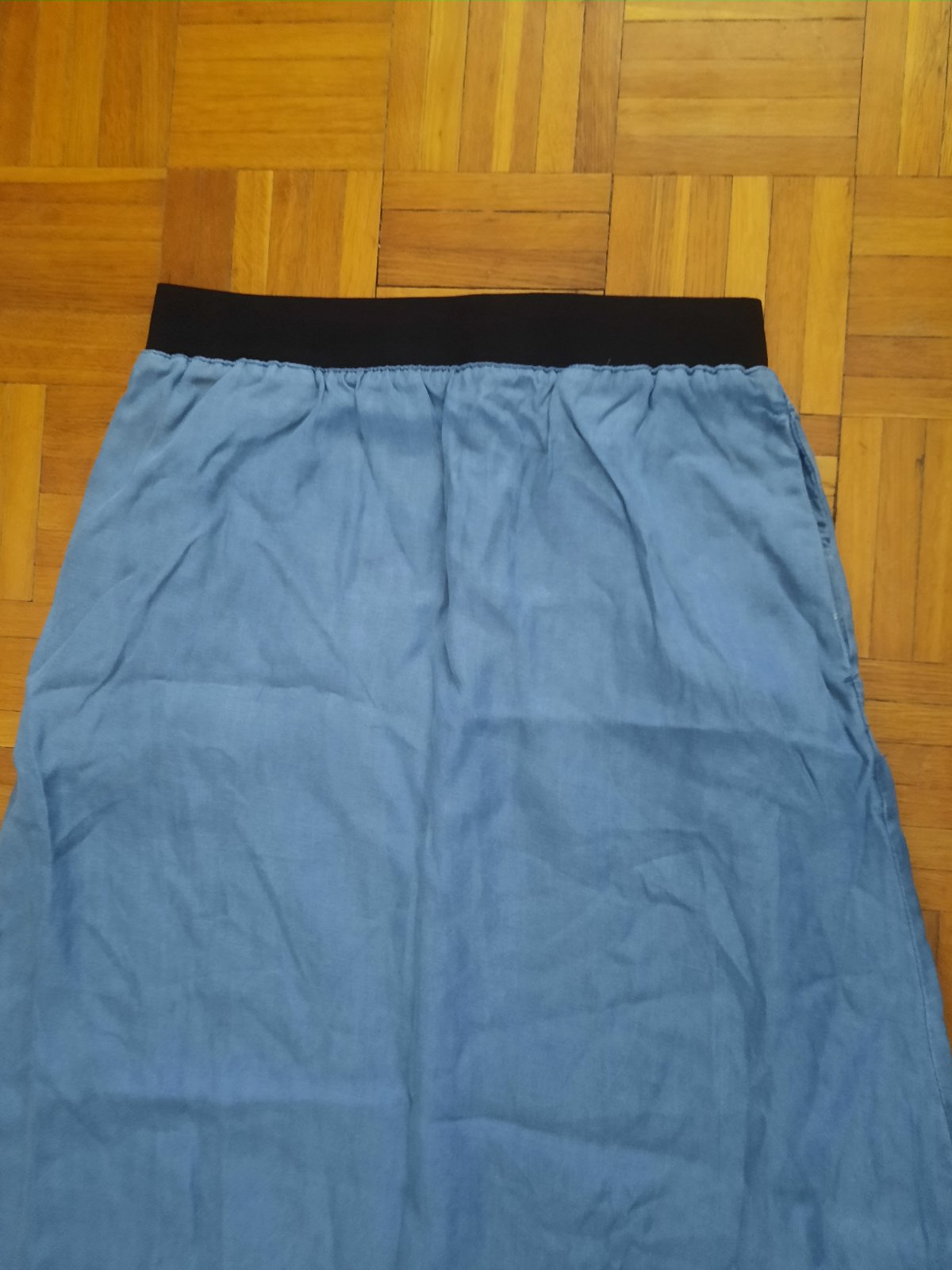 DIhá dámska sukňa z mäkkej látky -imitácia rifloviny. Pás je na širšiu gumu. Vačky sú z boku.