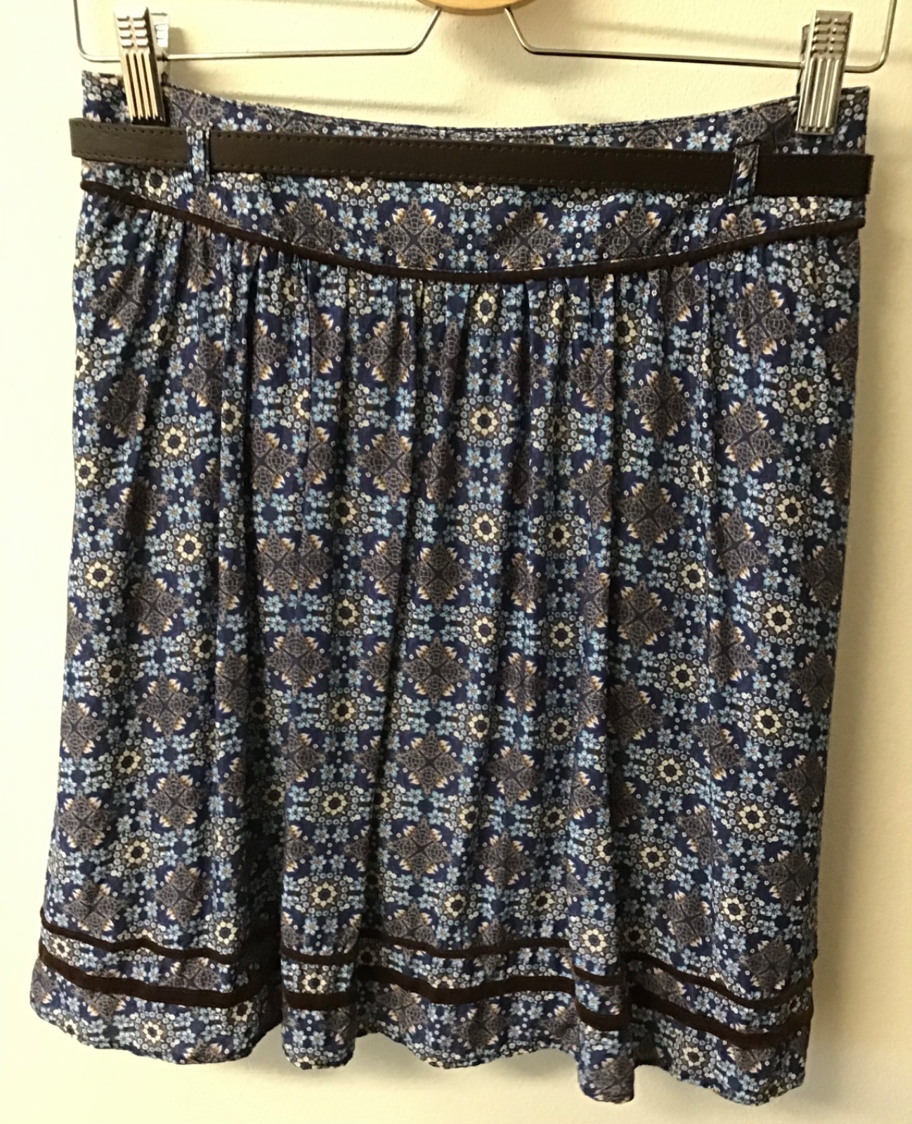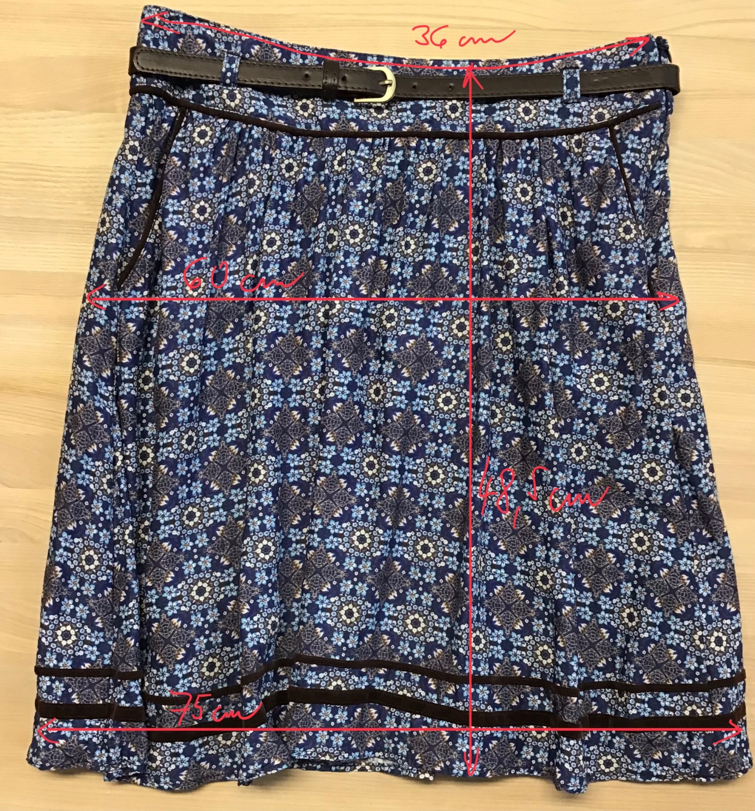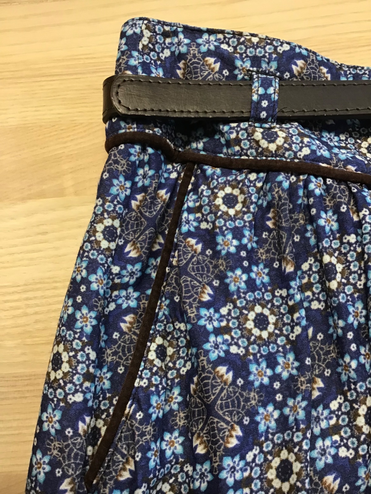 Predám rozkošnú málo nosenú riasenú sukňu s hnedými opaskom. Okrem zaujímavej modrej kvetovanej látky má aj zaujímavé zamatové aplikácie pri opasku, na spodnom okraji a okolo vreciek a podšívku. Suknička má veľkosť 34 a je značky Camaieu.