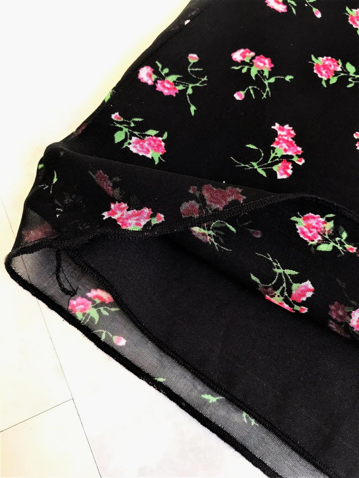 ľahká kvetovaná letná sukňa značky Kenvelo, má čierny základ s celoplošným vzorom červených ruží a zelených lístkov, jemne áčkový strih, vyrobená z tenkého, padavého materiálu