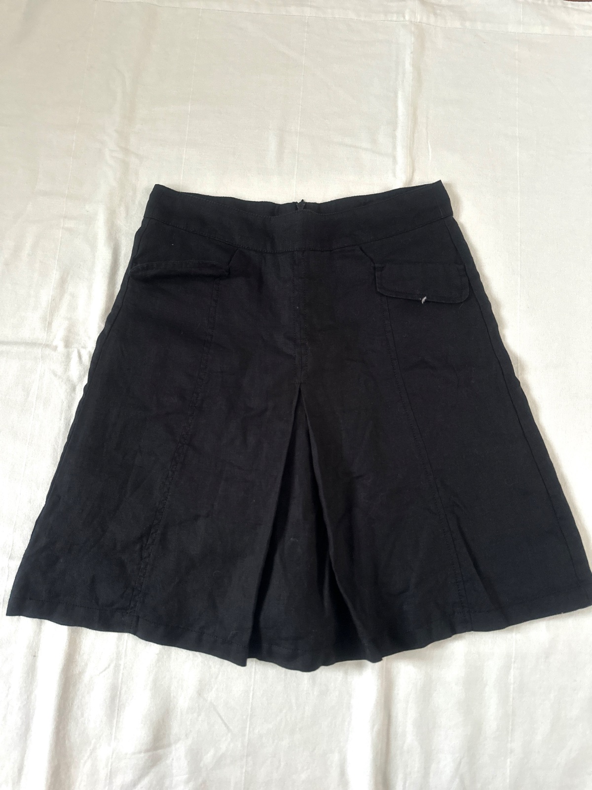 Čierna ľanová áčková sukňa. Má bočné vrecká a zapína sa na zips vzadu. Záhyb vpredu aj v zadu dodáva sukni lichotivý vzhľad. Materiál je 100 % ľan a podšívka 100 % bavlna. Povedala by som, že je to veľkosť M; všetky rozmery sú na fotkách. Sukňa vyzerá skvele s chlopňami a tričko vyzerá skvele s potlačou.