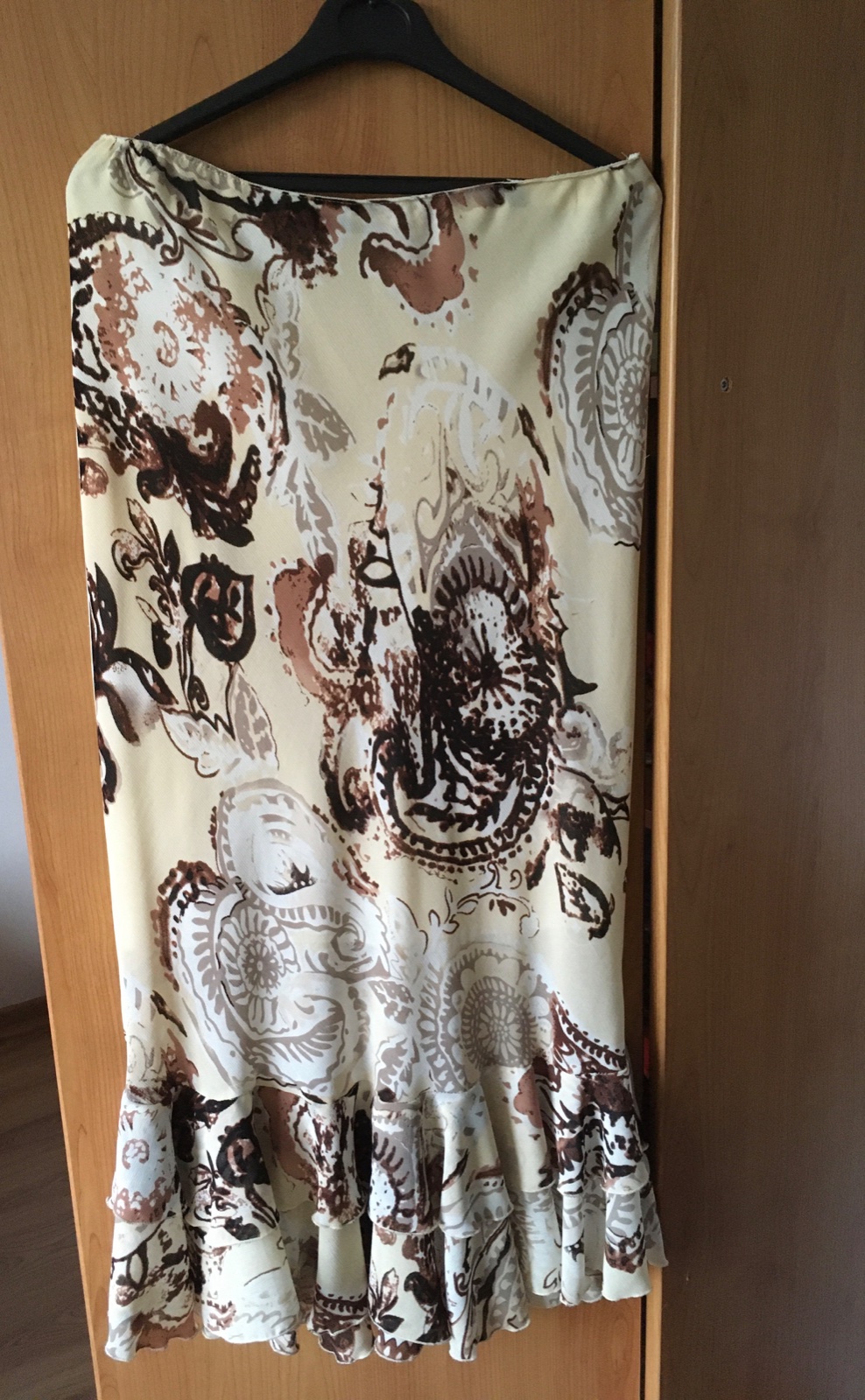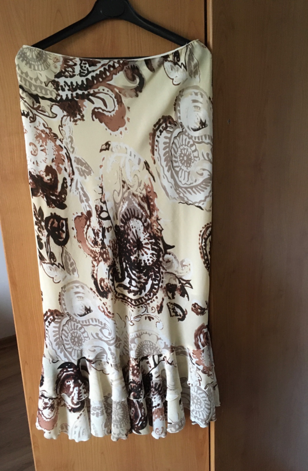 Sukňa béžovej farby so vzorom mušlí. Zloženie: polyester aj podšívka. Veľmi dobrý stav.