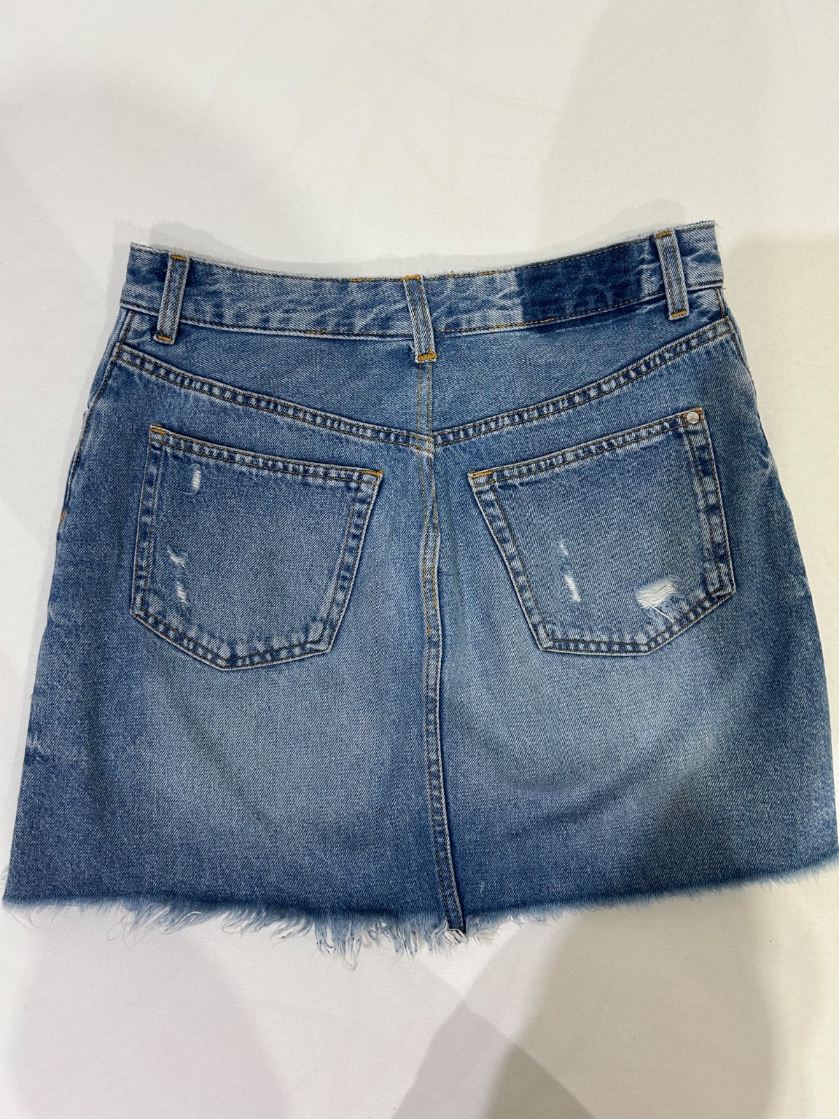 Ponúkam túto jeansovú mini sukničku zn. H&M, tmavomodrej šúchanej jeansoviny, na prednom vrecku a spodnej časti s trhanými dierami, klasické zapínanie ako pri jeansoch - zips s kovovým gombíčkom, v...