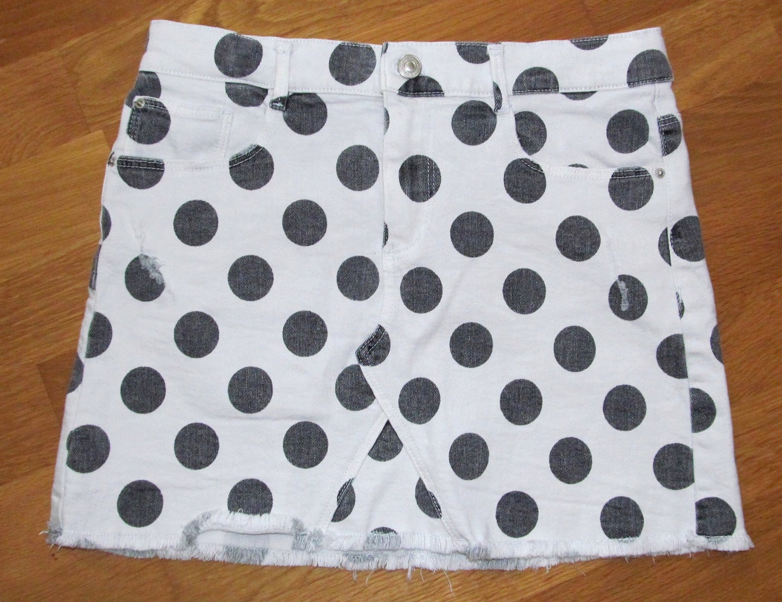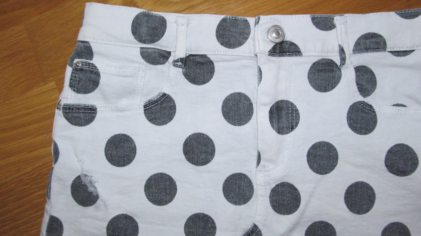 Ako nova, oblecena jediny raz. Dcere bola hned mala, pisana je velkost 164 ale mne sa zda trosku mensia, preto zaradujem ako 158. Je to taka biela / ecru riflovina, elasticka, s potlacou bodiek a srozstrapkanym spodnym okrajom. Super kusok, pas je zvnutra nastavitelny posuvnou gumickou. dlzka 36 cm, pas v klude 2*36,5 cm.