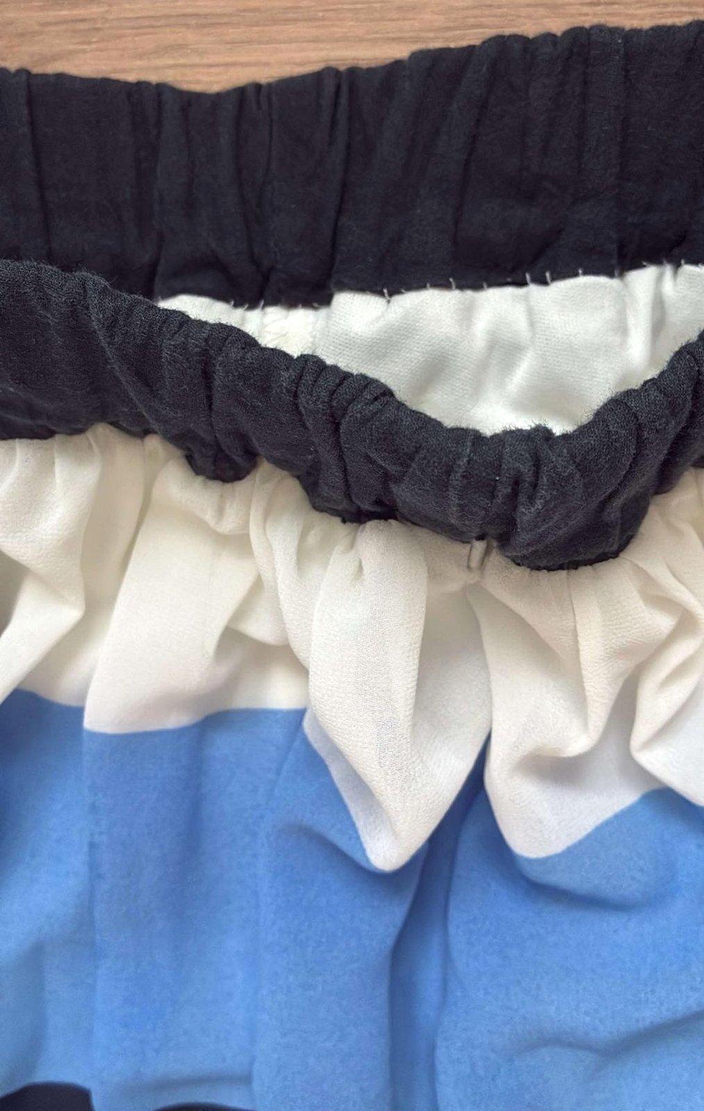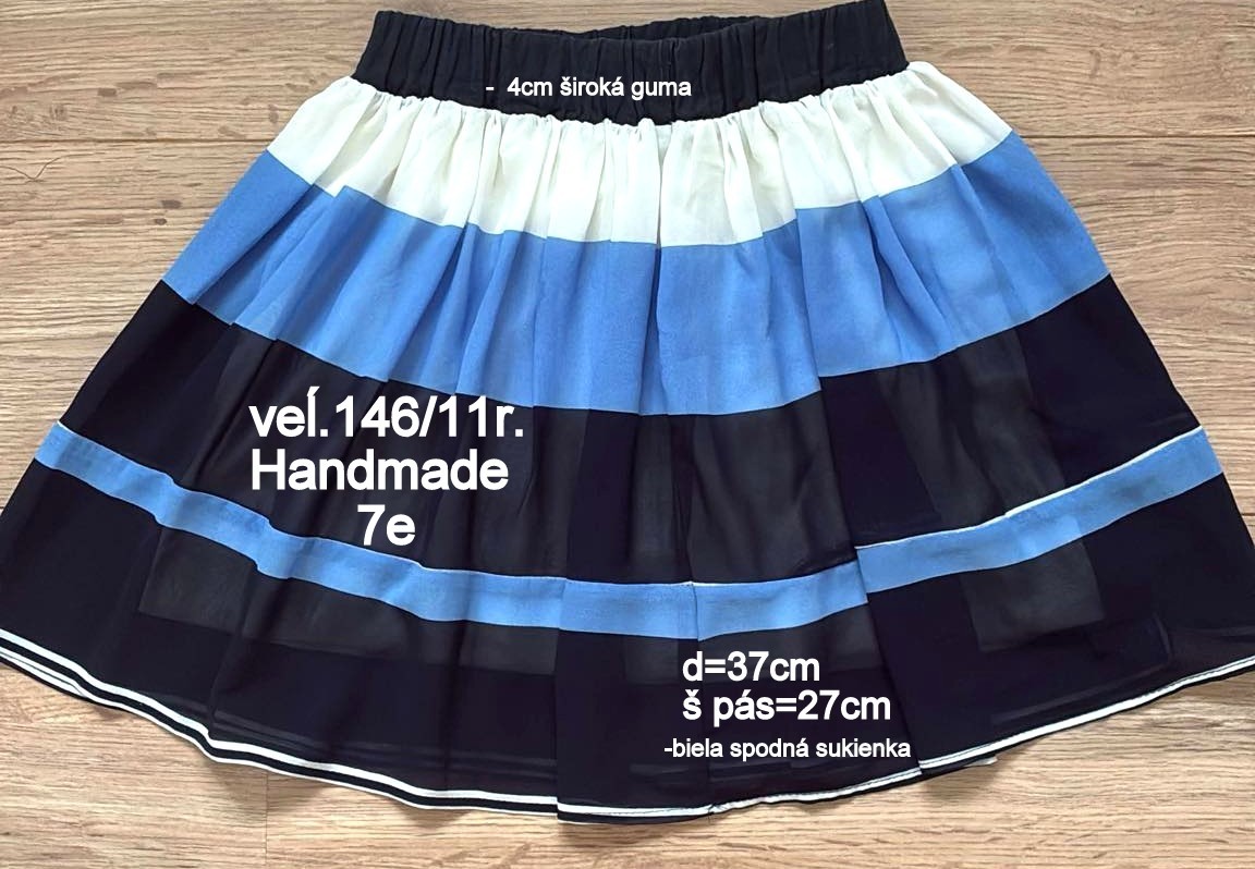 Predám handmade šitú sukňu, s pruhmi, má výrazný odtieň tmavomodrej a modrej, je pohodlná vďaka 4cm širokej gume v páse, , má všitú bielu spodničku vďaka ktorej pekne drží tvar a nepresvitá, materiál jemný polyester a viskóza, ĺahká, vzdušná, padavá, mierne priesvitná, krásne točivá, vhodná na leto, d=37cm, š pás=27cm( v nenatiahnutom stave), málo nosená ako nová.