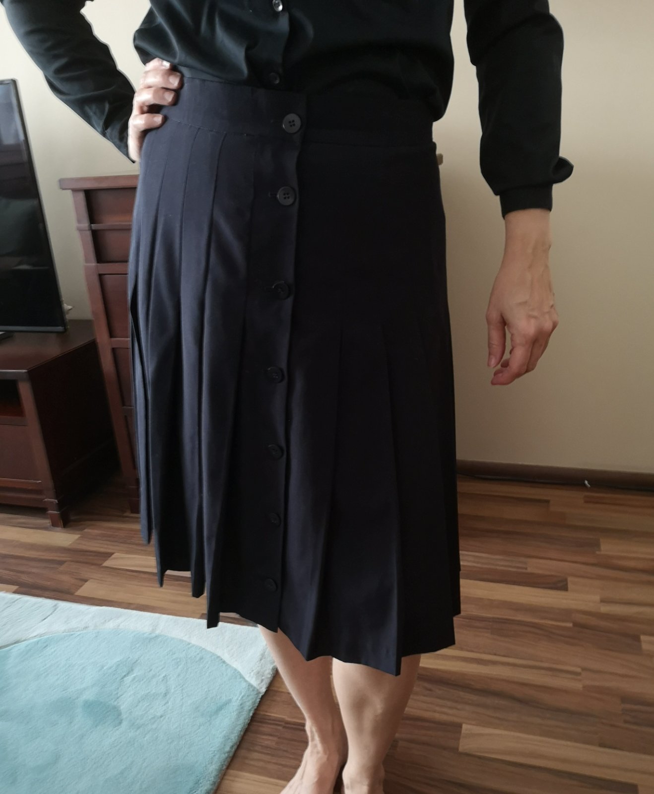 Predám túto tmavomodrú skladanú sukňu značky Bogner. Vpredu gombíky a hore aj zips. Je so spodničkou, dĺžka cca po kolená, Výborný stav.