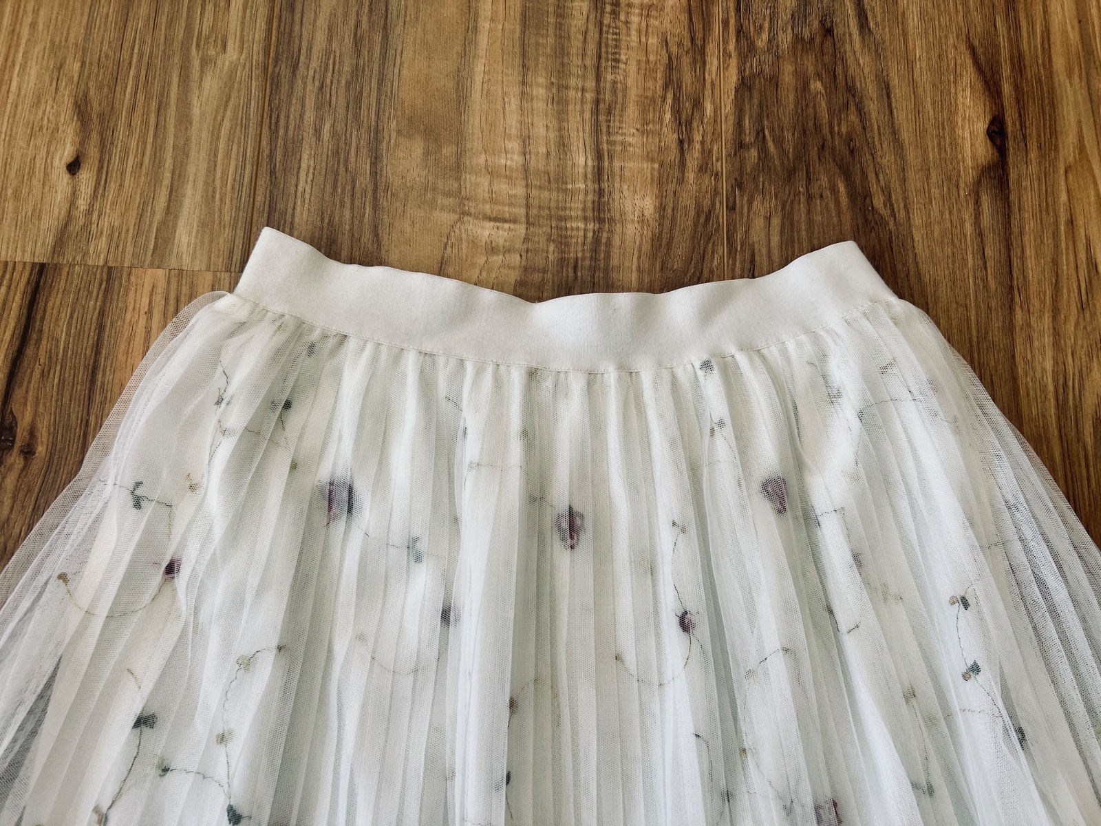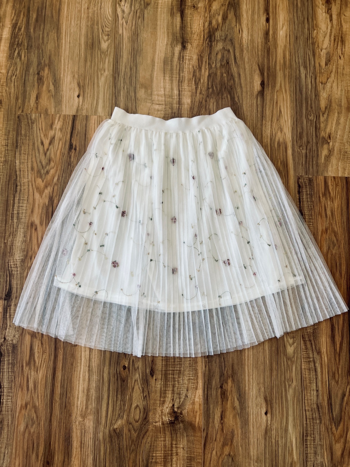 Biela sukňa s kvietkami značky Mohito. Je na gumičku, takžesa prispôsobí. Vrchná vrstva je priesvitná tylová, na spodnej sú vyšívané kvietky. Veľkosť 34.
