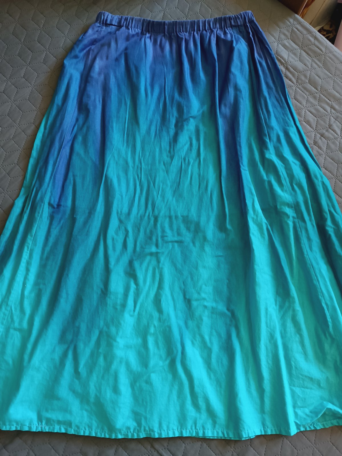 Zaujímavá sukňa, od fialovej až po svetlú tyrkysovú. Veľkosť M, pás na gumu od 39 do 50 cm. Dĺžka 90 cm. Podšitá zhruba do polovice. Cena 6 eur plus poštovné.