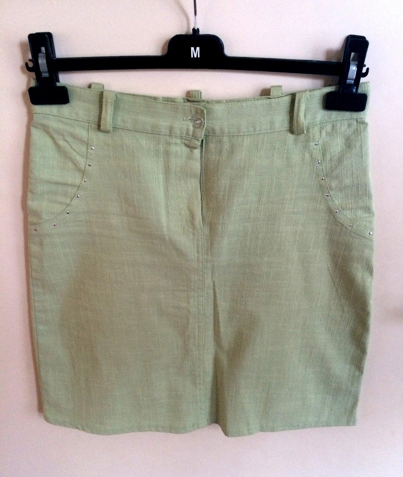 Bledozelená sukňa, krátkeho strihu. Veľmi ľahký materiál. Veľkosť je písaná 38, ale reálne je to 34.