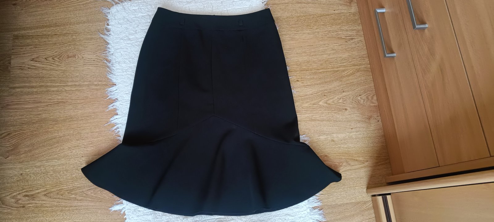 Krásna sýto čierna kvalitná sukňa na sviatok aj bežné nosenie. Vzadu zips. Dole volán. Pás 35x2 cm, dĺžka 59 cm. Cena plus pošta.