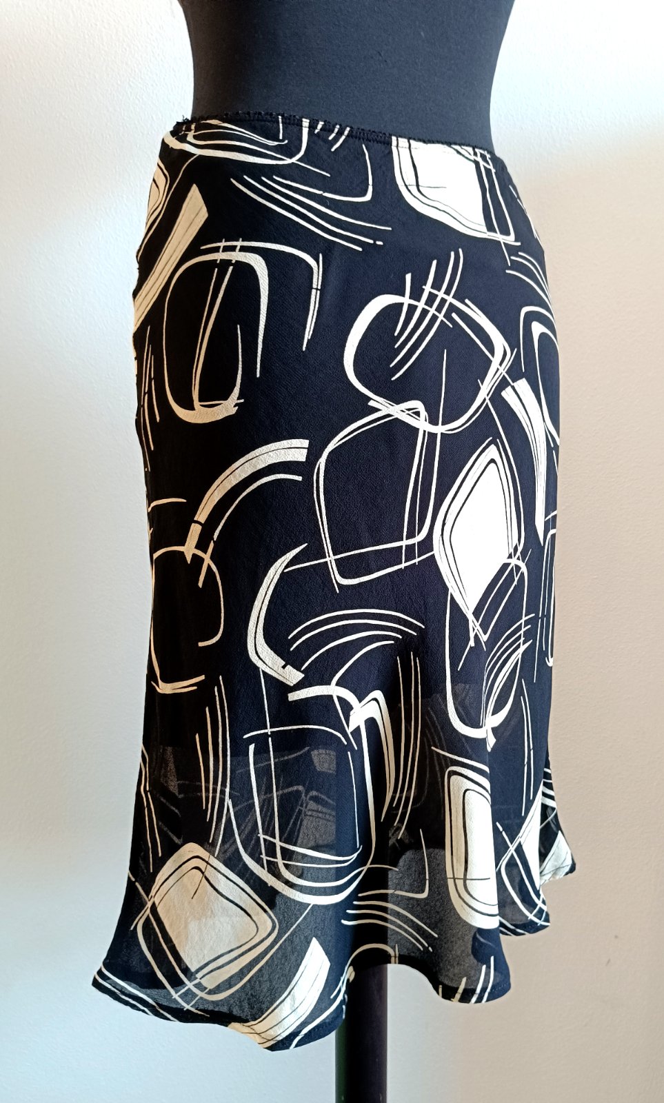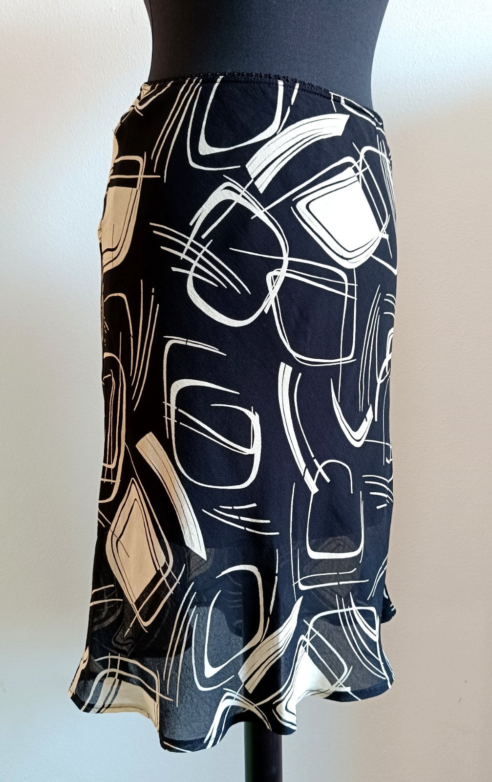 Podšitá sukňa, pás guma. Pás guma 34-45, dĺžka 63, boky 48-53.