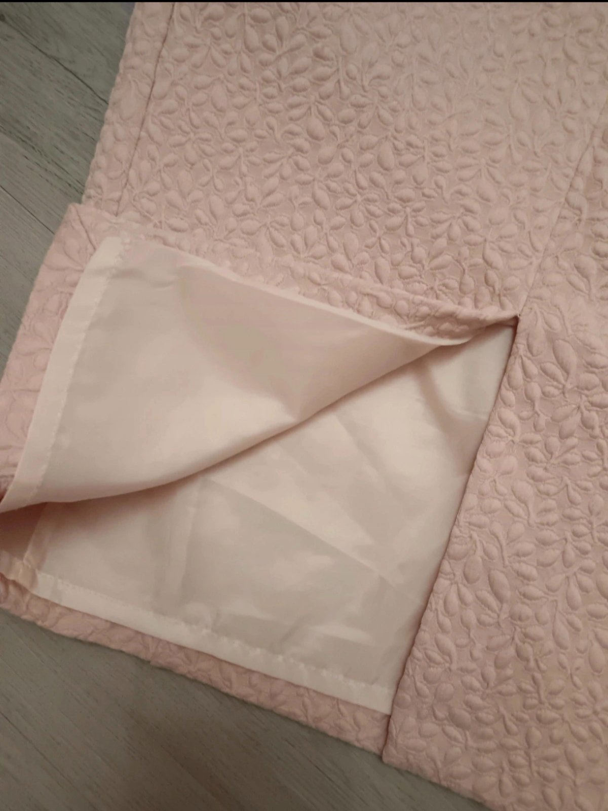 Elegantná sukňa s jemnou potlačou, farba v skutočnosti jemná ružová, oveľa krajšia ako na foto pod umelým svetlom. Bez poškodenia
