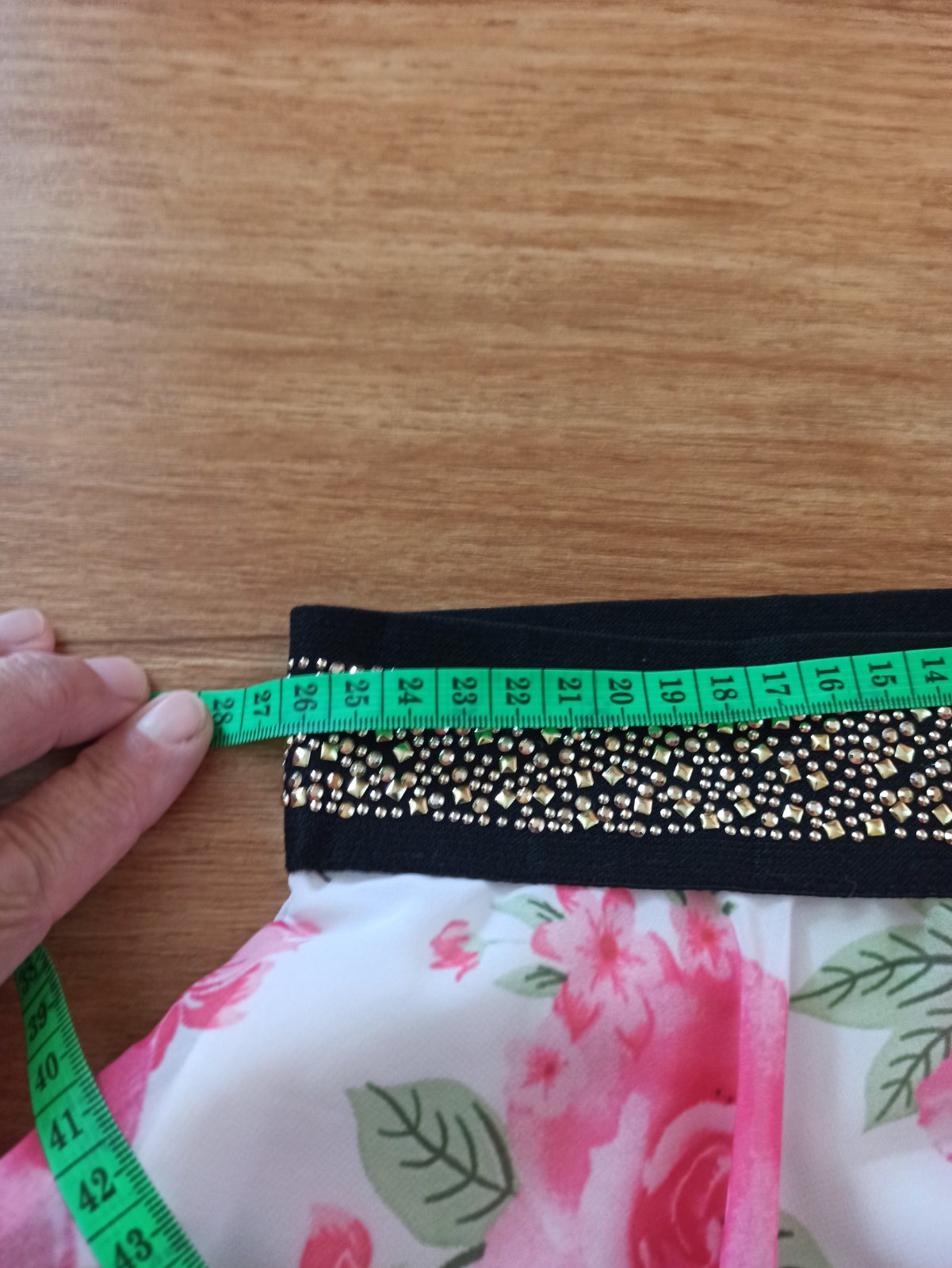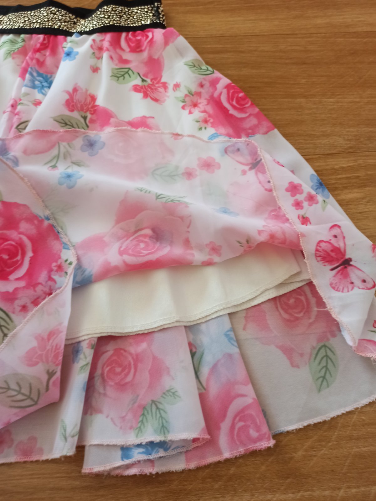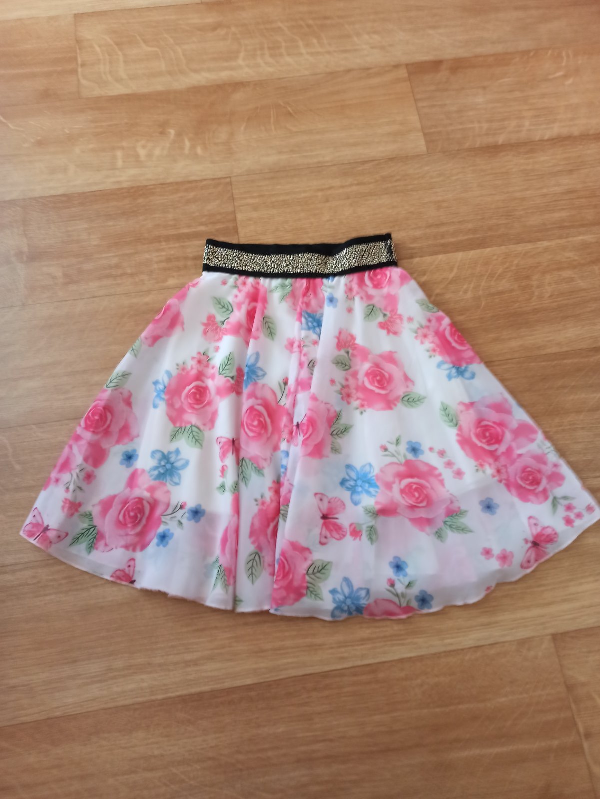 Krásna,ľahučka sukňa,má aj spodničku,v páse do pružnej gumy,farba je pekna,nevyblednuta