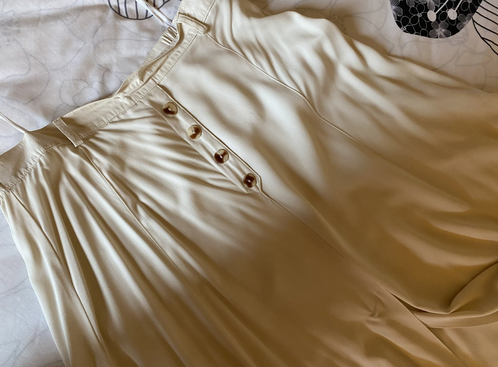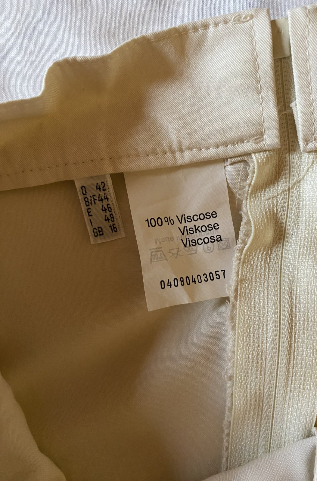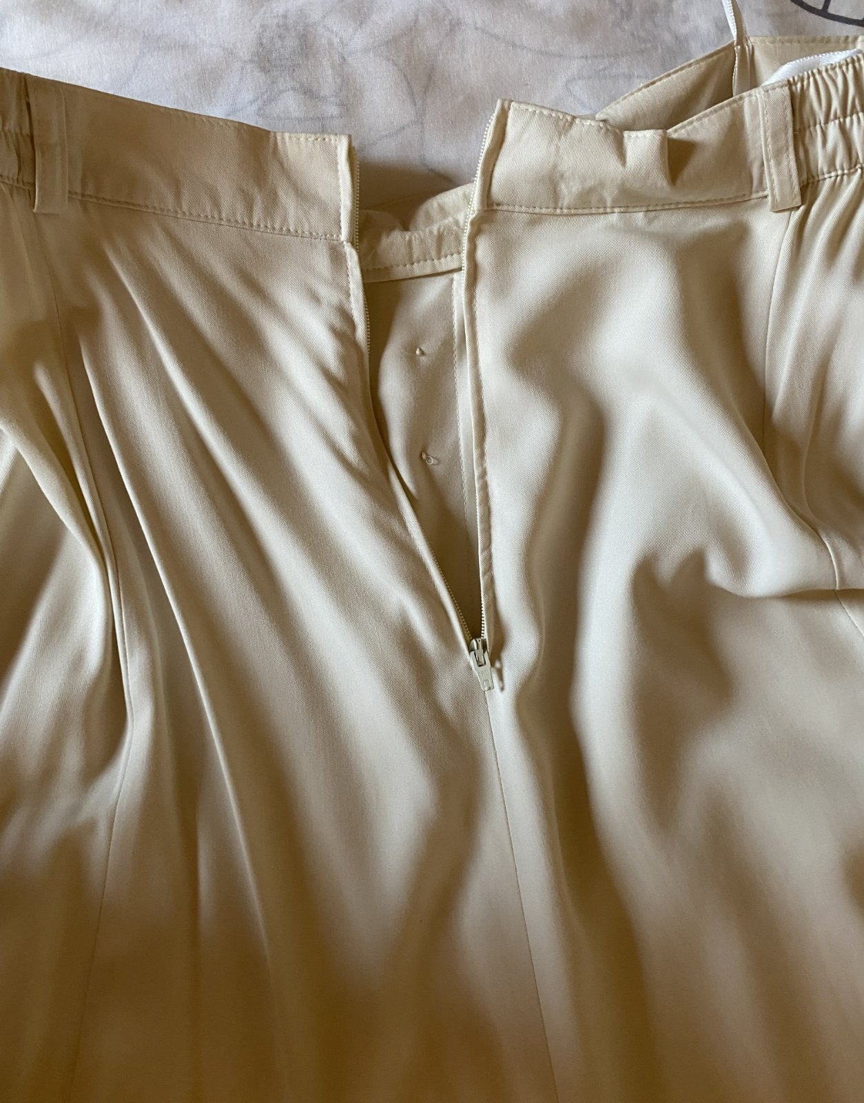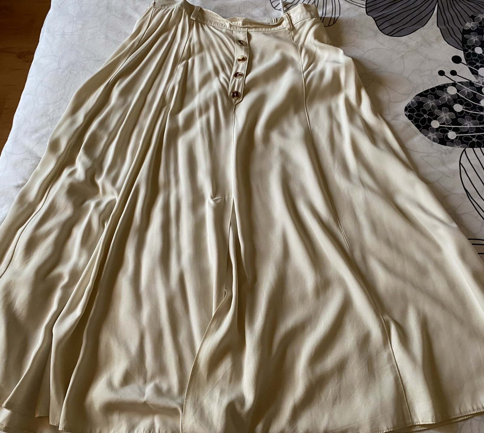 Kvalitná elegantná maxi sukňa v. 42, kvalitne prepracovaná, materiál 100% viskóza padavá látka, pekná smotanová farba, vpredu ozdobné gombíky, vzadu zapínanie na zips, vpredu dolu rozpárok, v spodnej časti široká, asi 2x oblečená. Miery: pás v kľude: 39cmx2, na bokoch gumičky, ešte povolí dĺžka: 86cm, šírka spodná časť :130cmx2