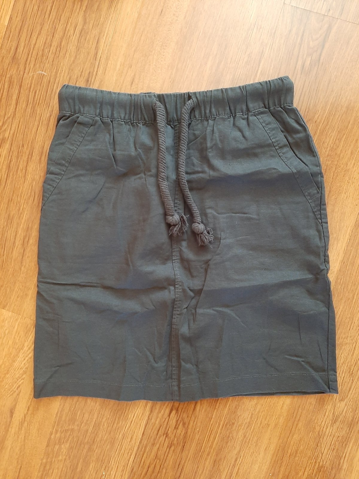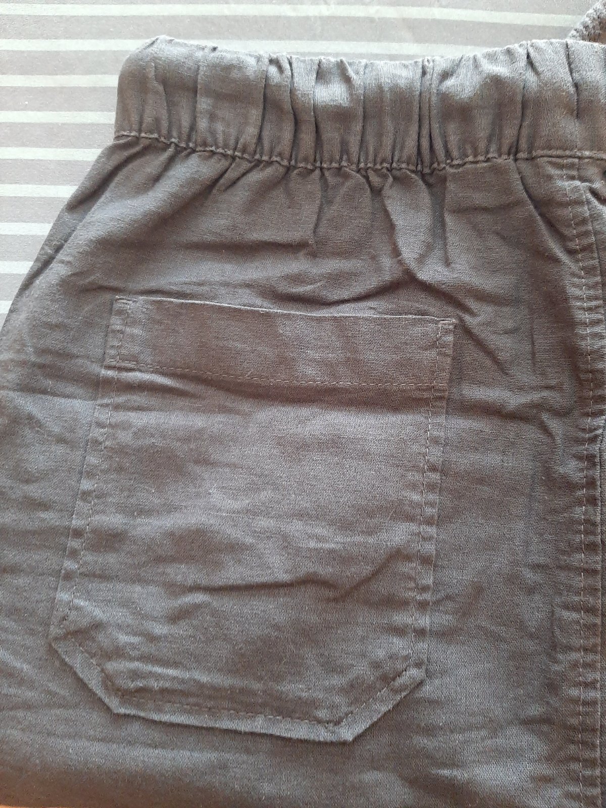 Raz na sebe, pás 34, je tam guma, šnúrka, bočné vrecká. Bočná dĺžka 47. Je aj v bledosivej farbe.