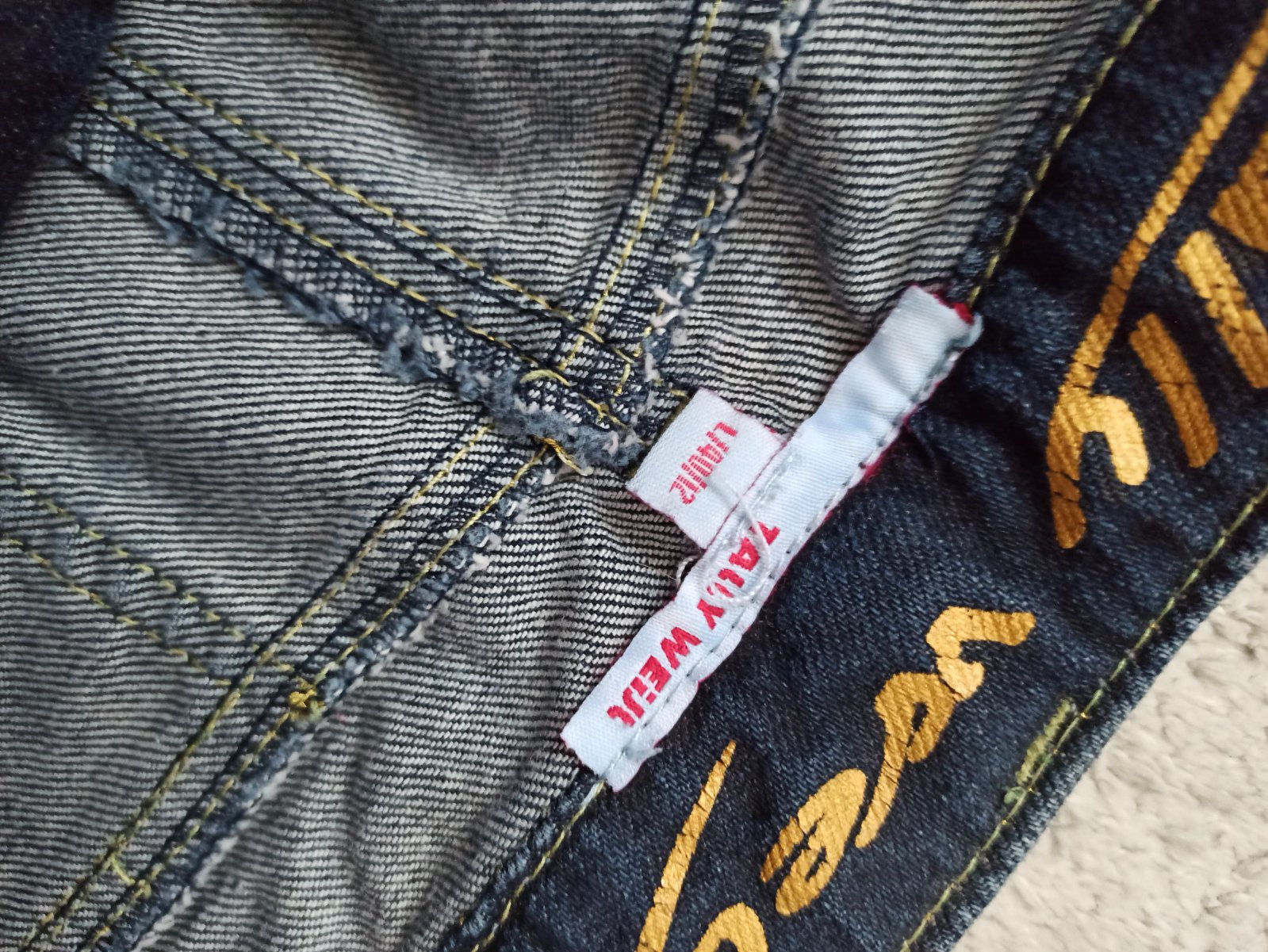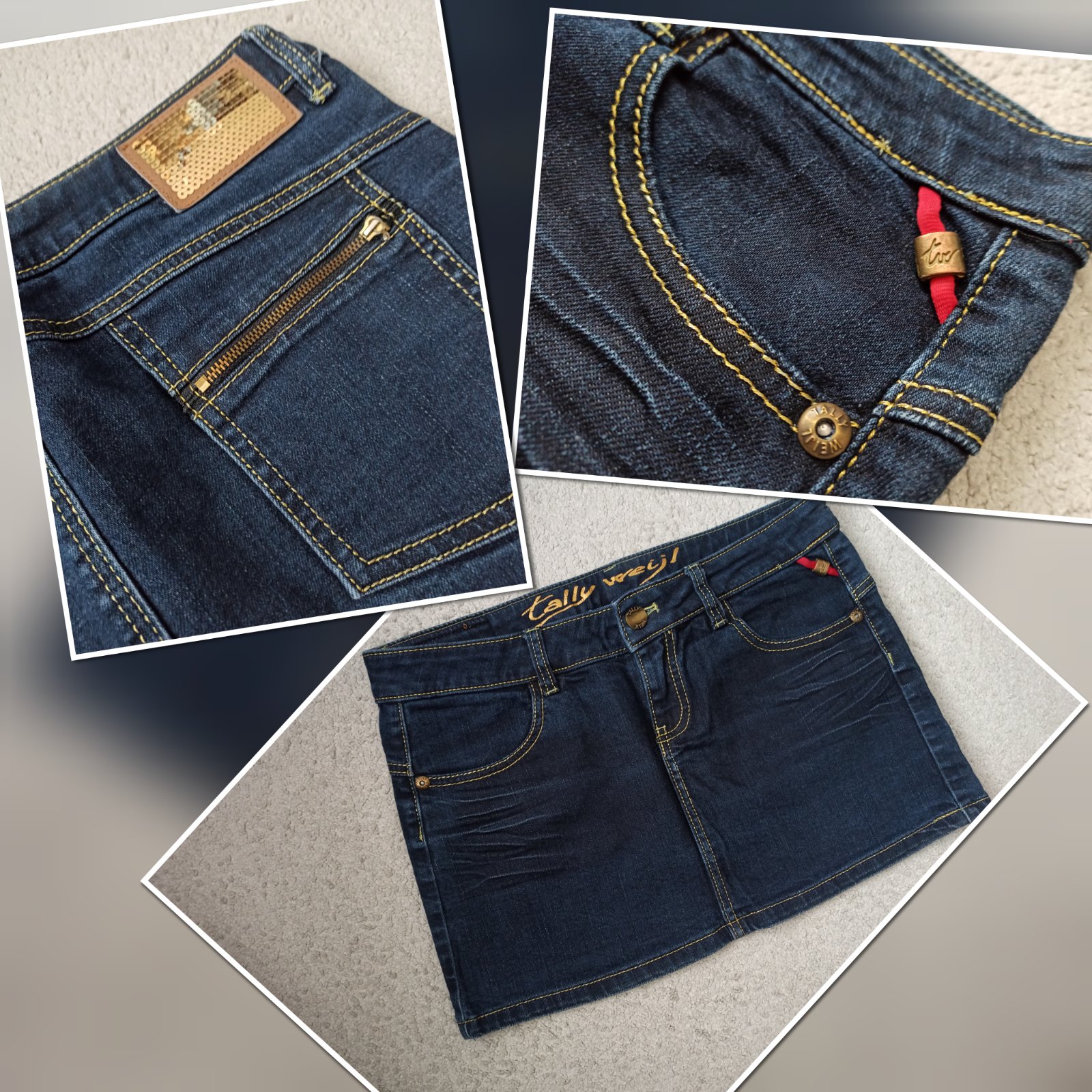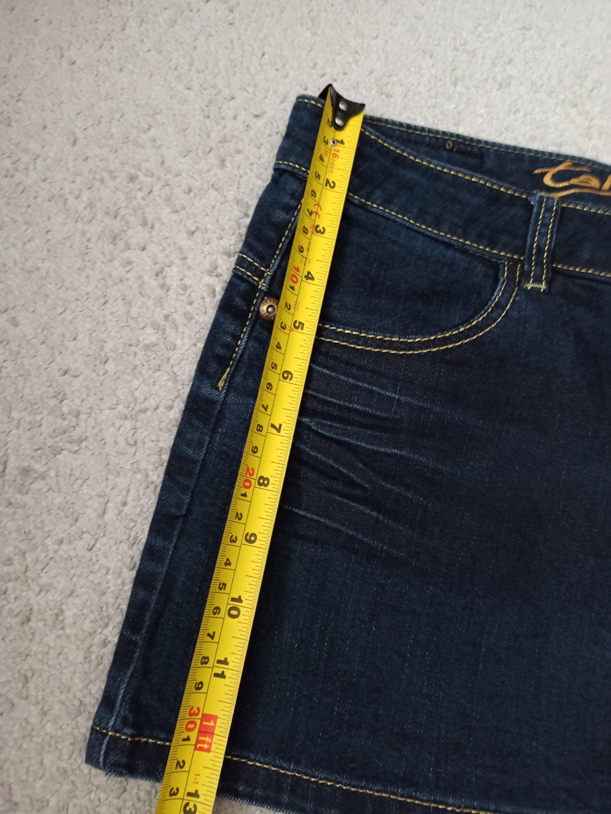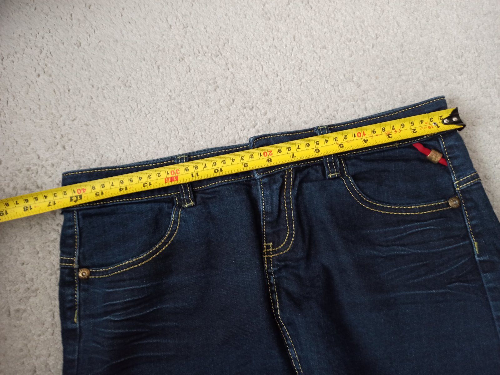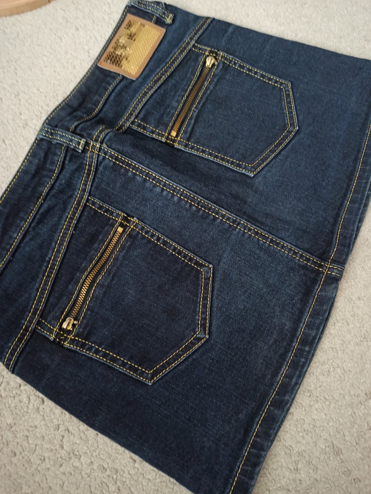 Riflová sukňa z pevnejšej rifloviny, efekt šúchania a záplat. Minimálne nosená. Pred a zad vrecká, gombík a zips, pútka. R: pás š: 42cm, dl:34cm, boky š:49cm.