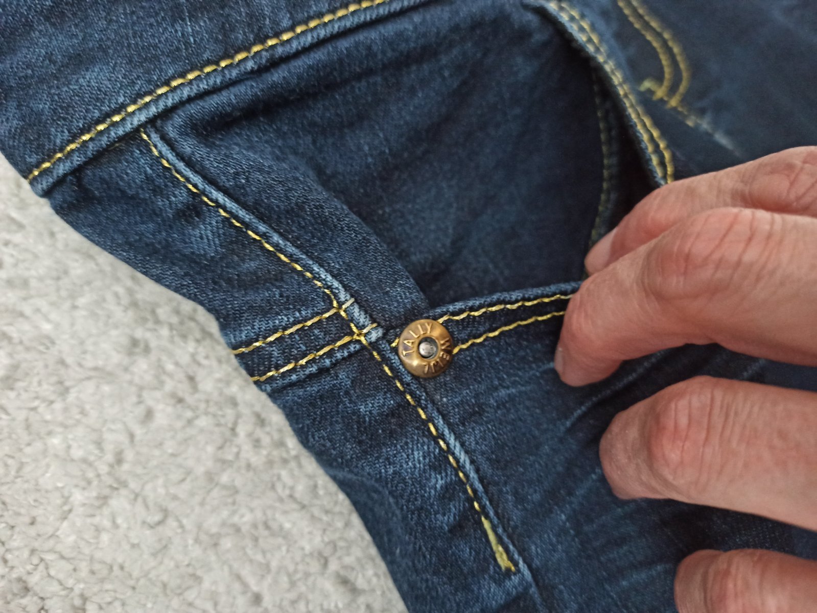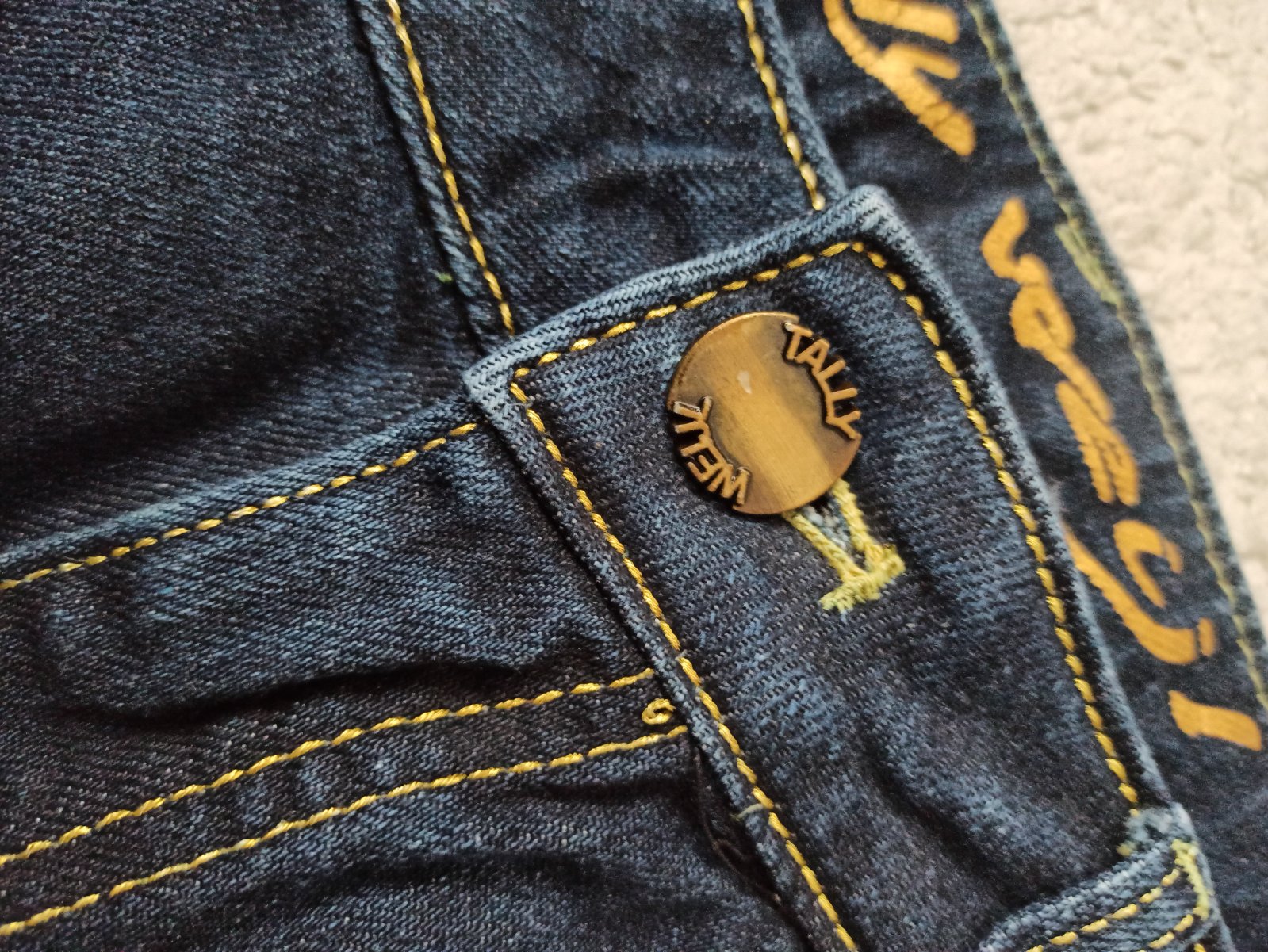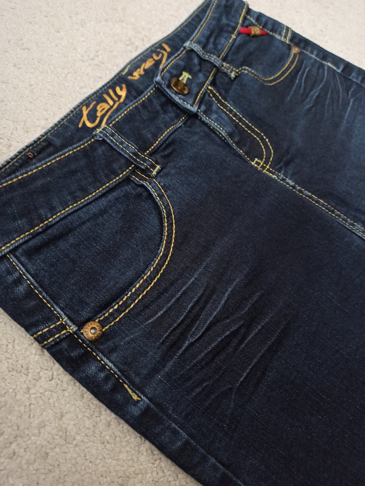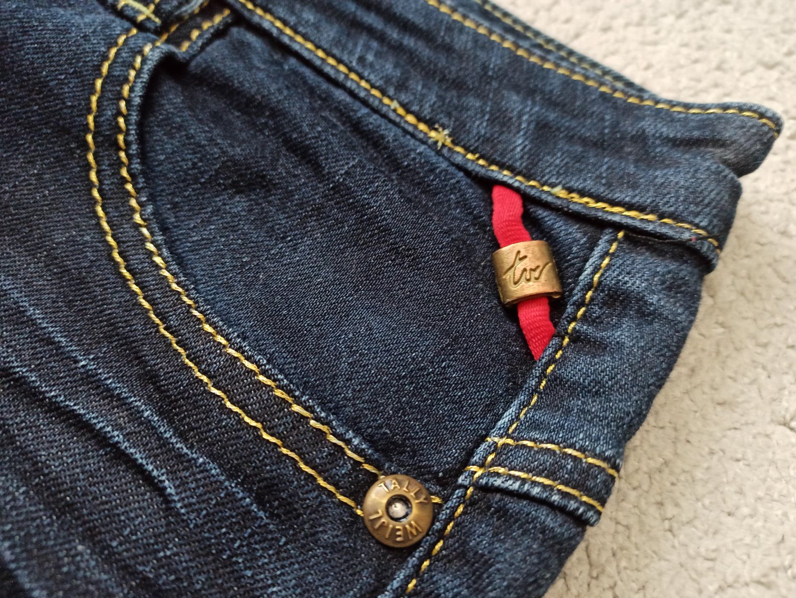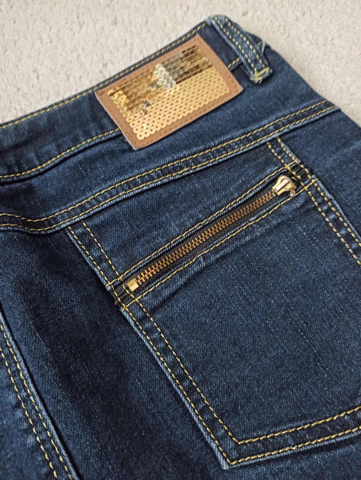 Riflová sukňa z pevnejšej rifloviny, efekt šúchania a záplat. Minimálne nosená. Pred a zad vrecká, gombík a zips, pútka. R: pás š: 42cm, dl:34cm, boky š:49cm.