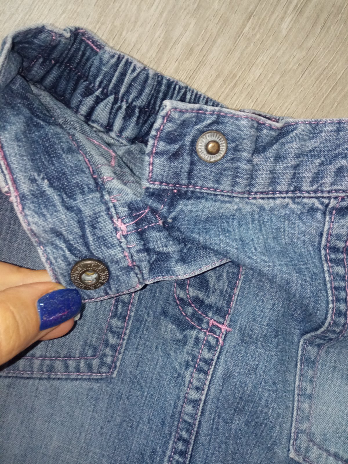 Dievčenská tenká rifľová suknička. Pás na gumu. Zapínanie na cvik. Dve predné vrecká. Materiál:100%bavlna.