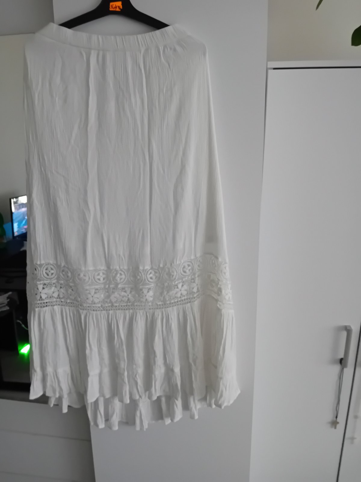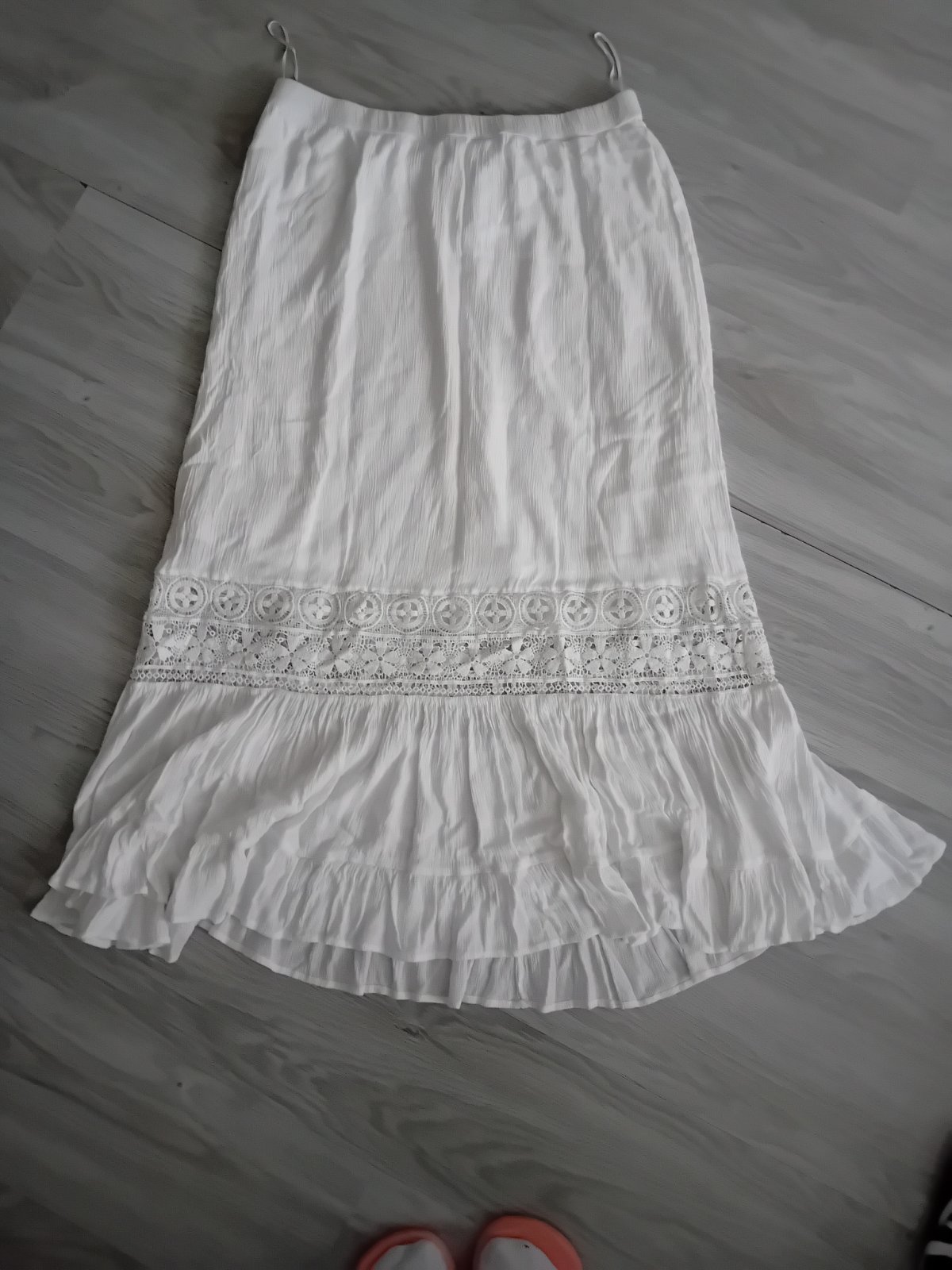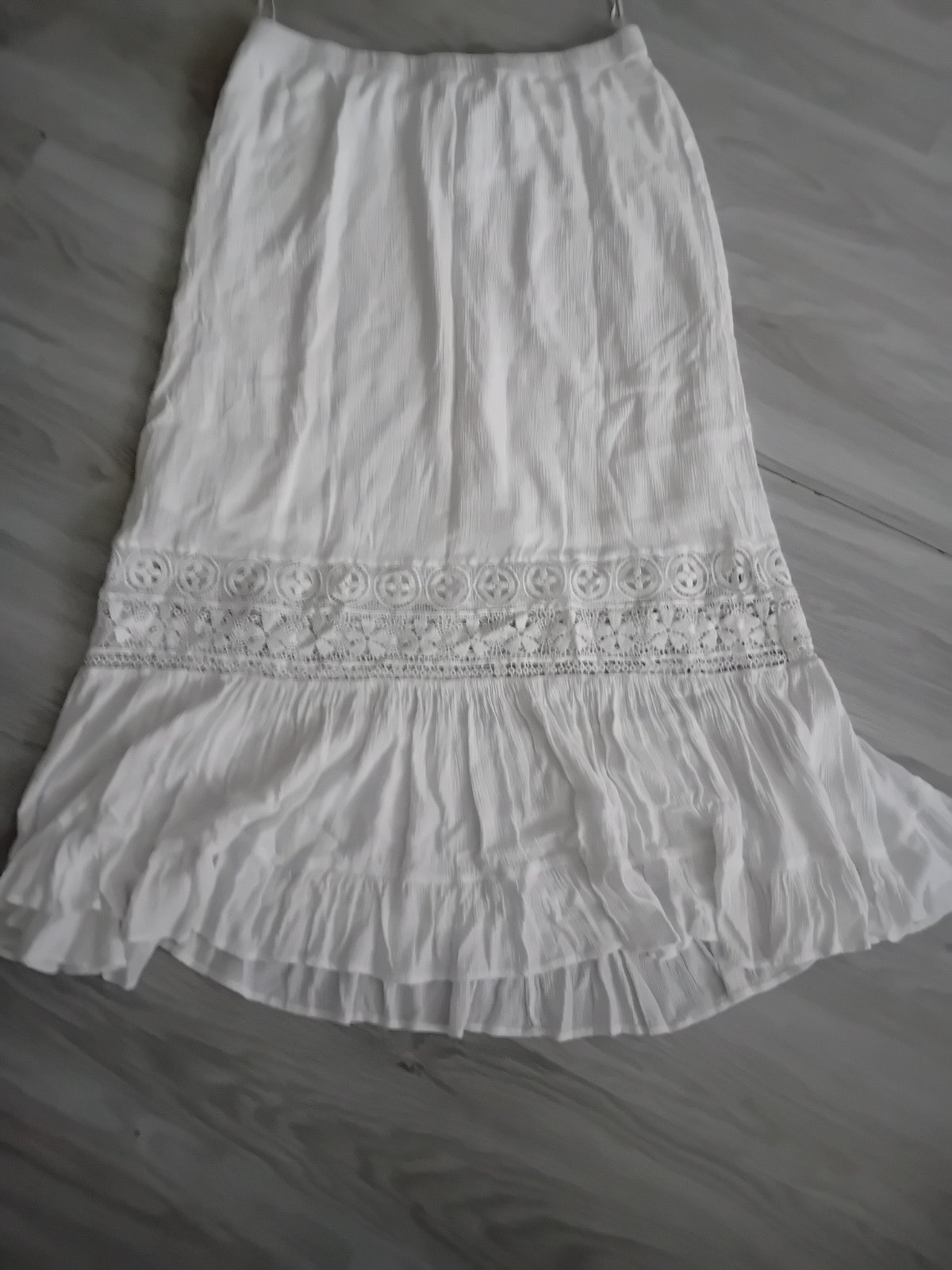 Pekná biela sukňa s miernymi trblietkami, nie veľmi lesklá, vhodná na letné dni či dovolenku, oblečená párkrát na dovolenke, bez poškodení, sedí na veľ.40/42, možno aj viac, má v páse gumu.