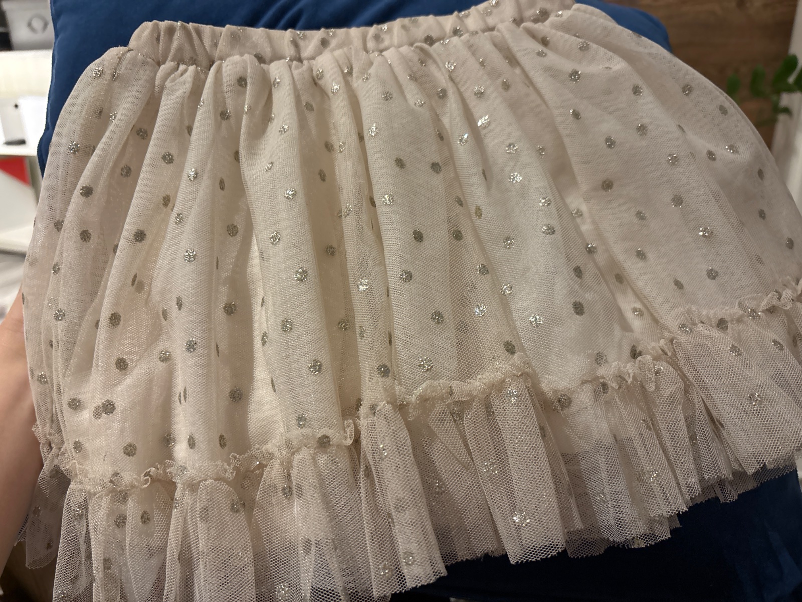 Suknička má v predu veľké vrecko. Spodok s volánikom.