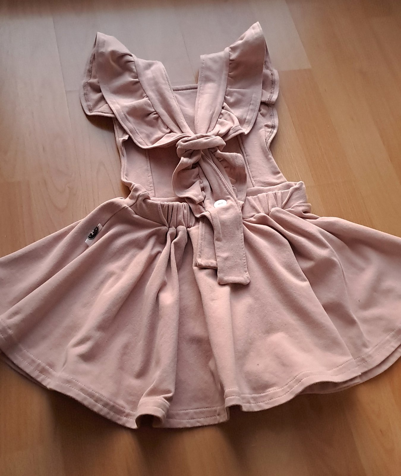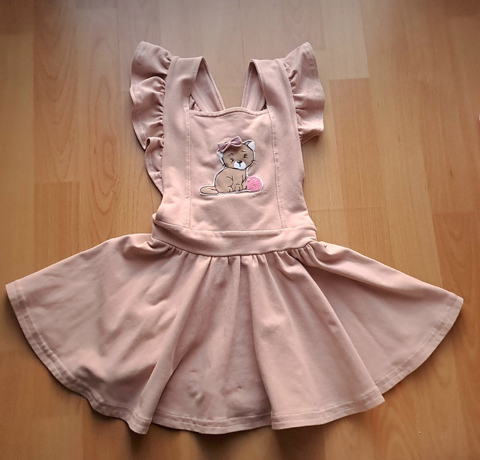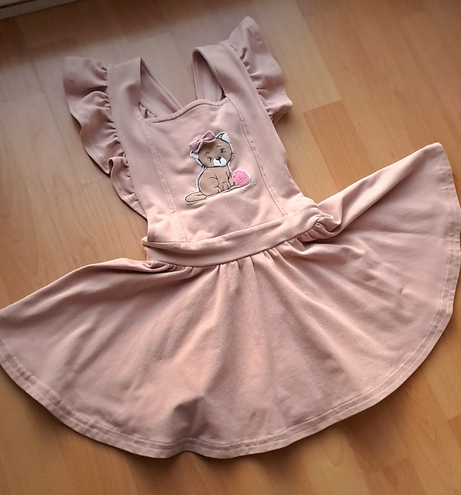 Nadherna staroruzova tociva sukna na traky, s volanikmi, vyrobena na moje zelanie. Latka je velmi kvalitna, mierne hrubsia, macicka je rucne kreslena a rucne nasivana aj s maslickou. Na chrbte je gumicka, ktora sa da posuvat a upravit ramena aby nepadali. Dcerka ich dostana na 3 roky, oblecie aj ako 4.5 rocna ale uz su jej trochu kratke.